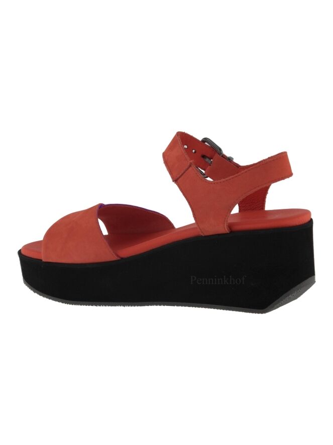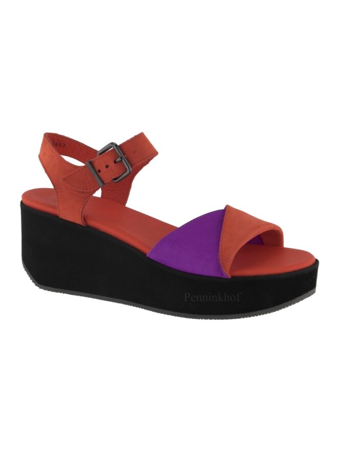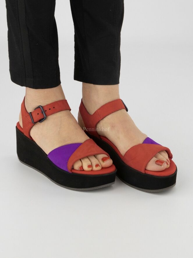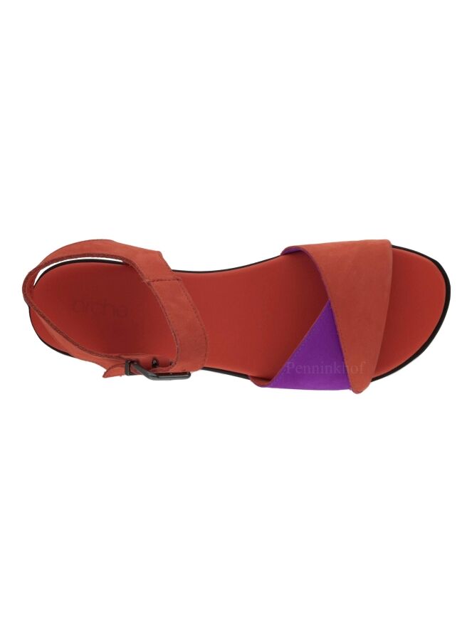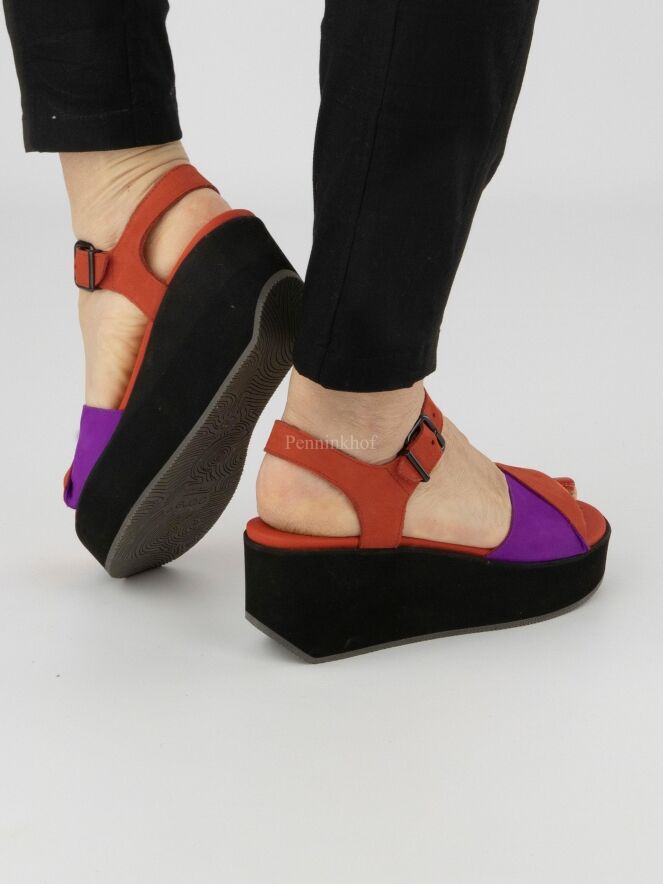 Een plateau sandaal van Arche in de kleur fuchsia met oranje. Het nubuck suède op de voorvoet is omgeslagen. Het hielbandje is verstelbaar met een nikkel kleurig gespje. Het voetbed is in het leder in de kleur donkerpaars.