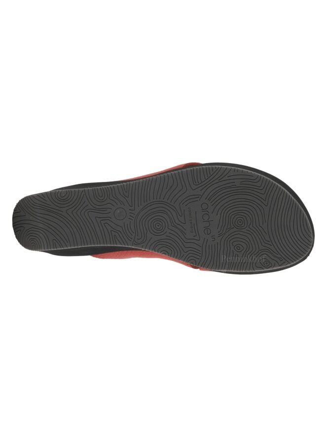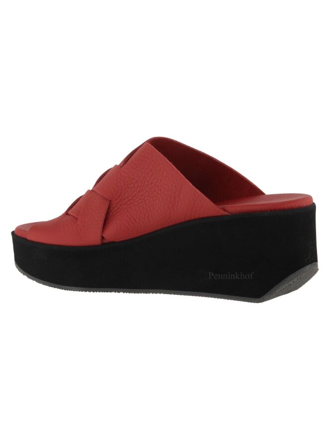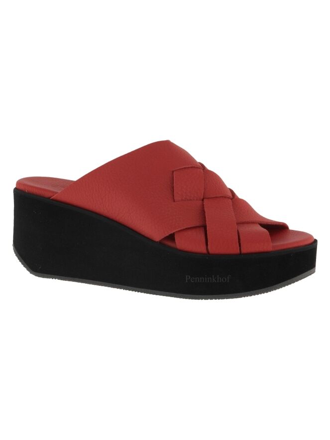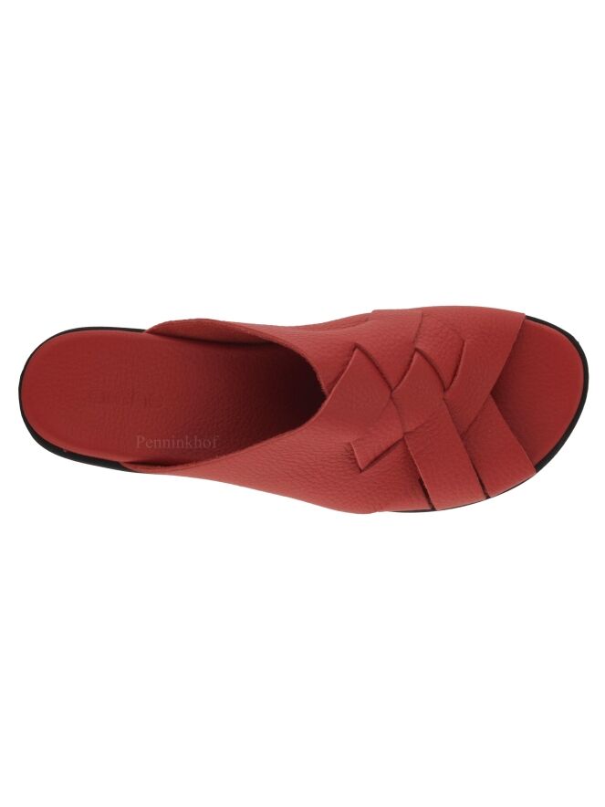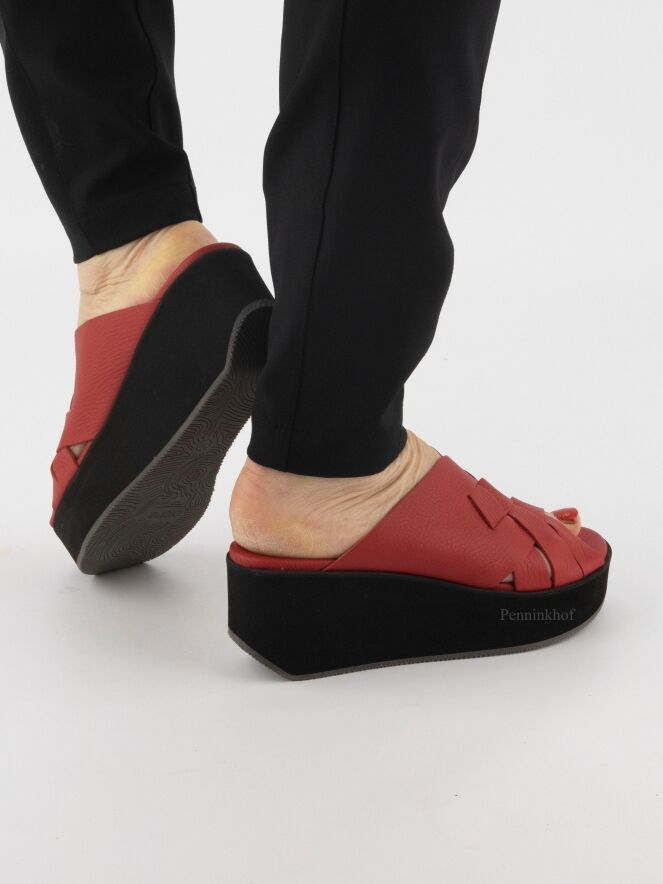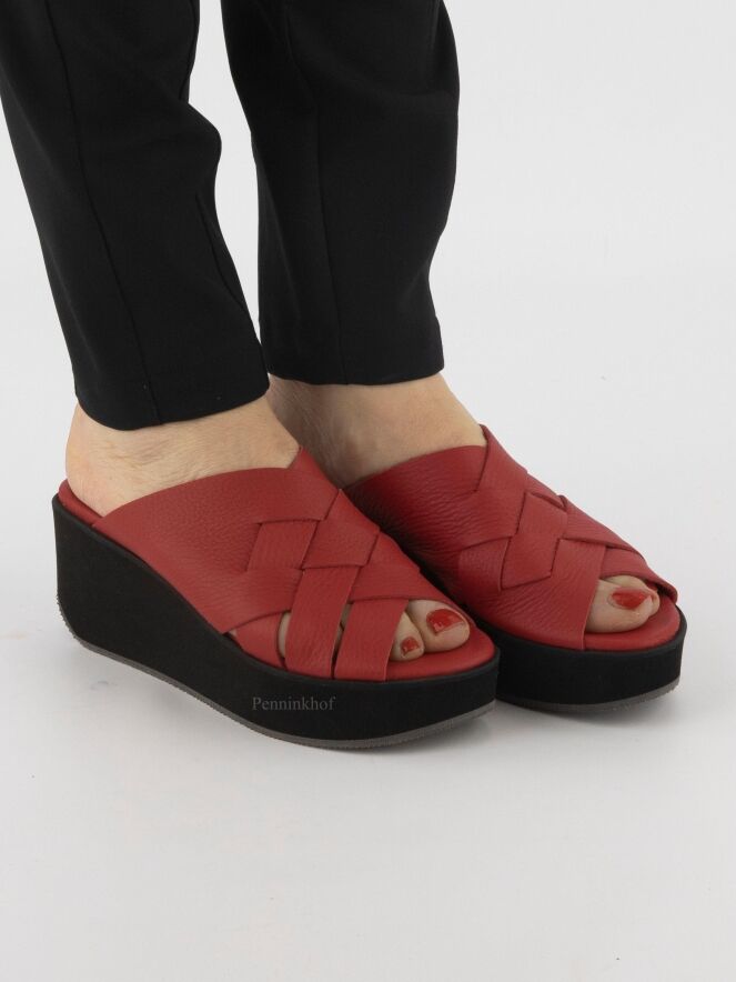 Een plateau slipper van Arche in de kleur rood. Het leder op de voorvoet is gevlochten. Het voetbed is in het zelfde materiaal en kleur als het leder over de voorvoet.