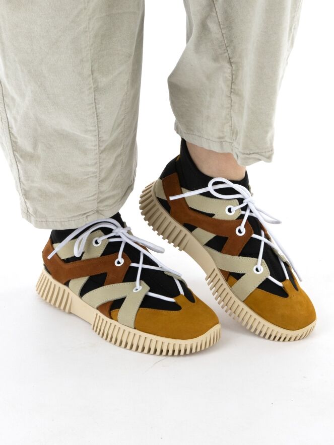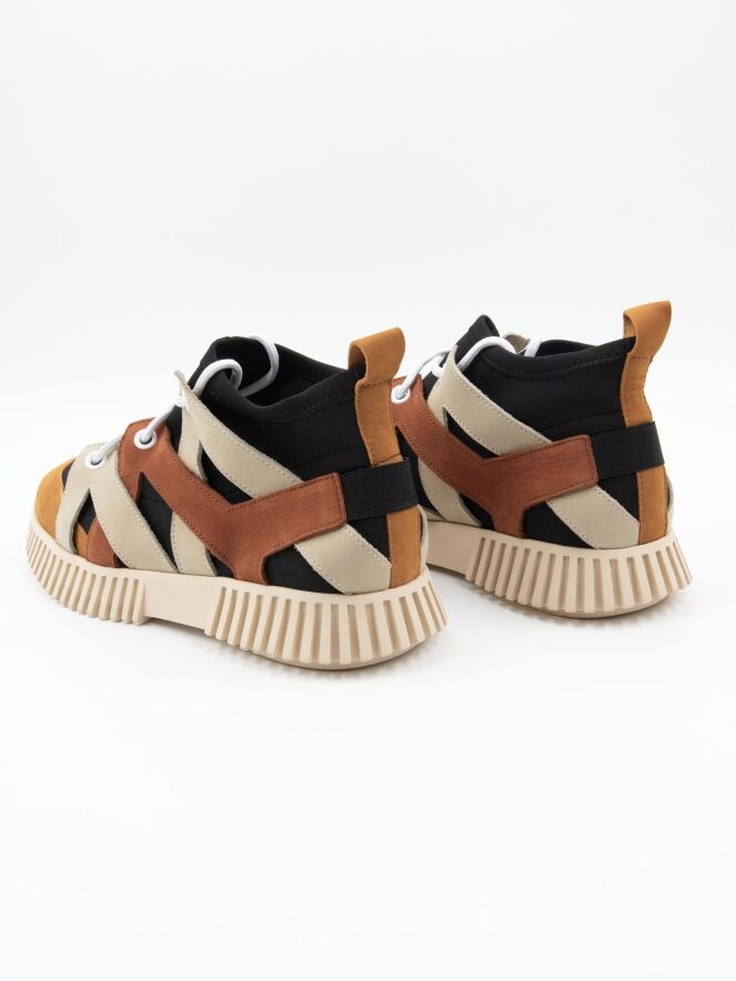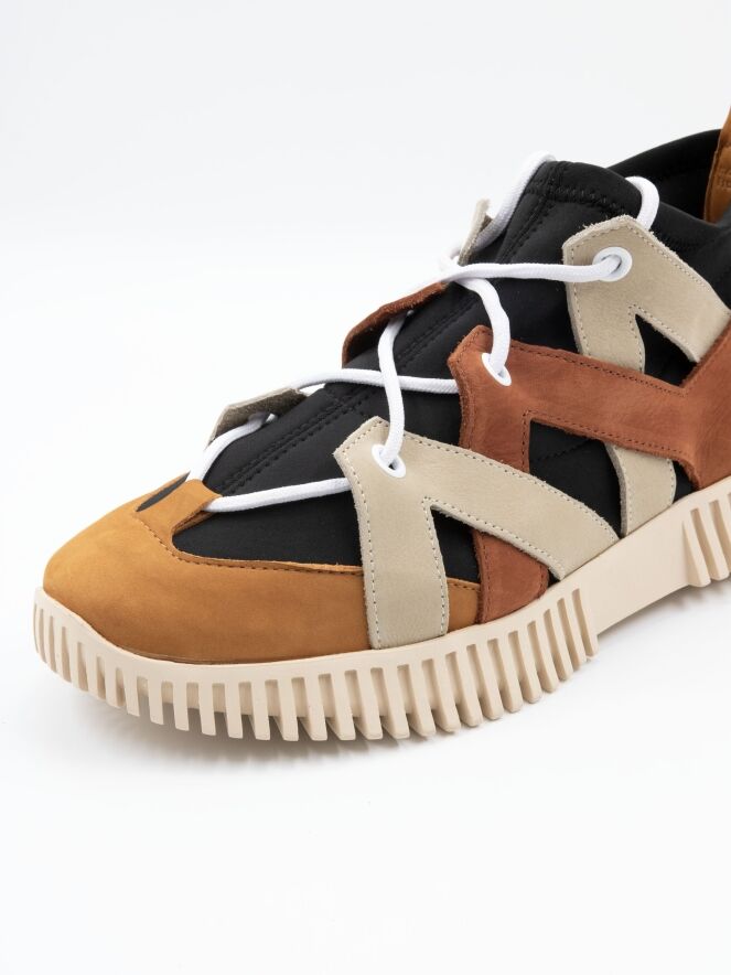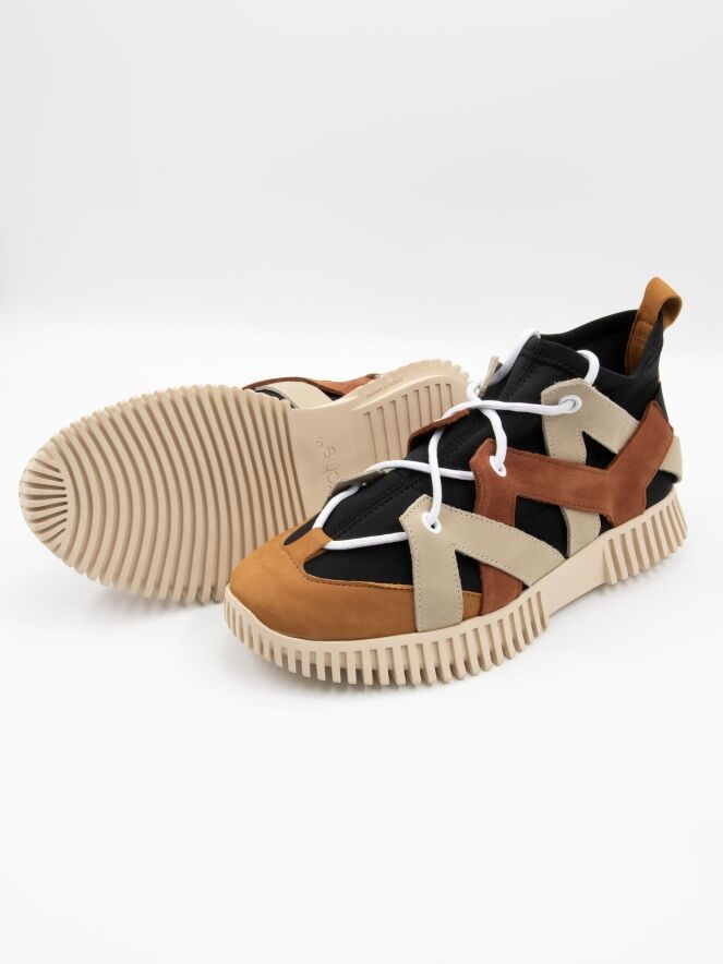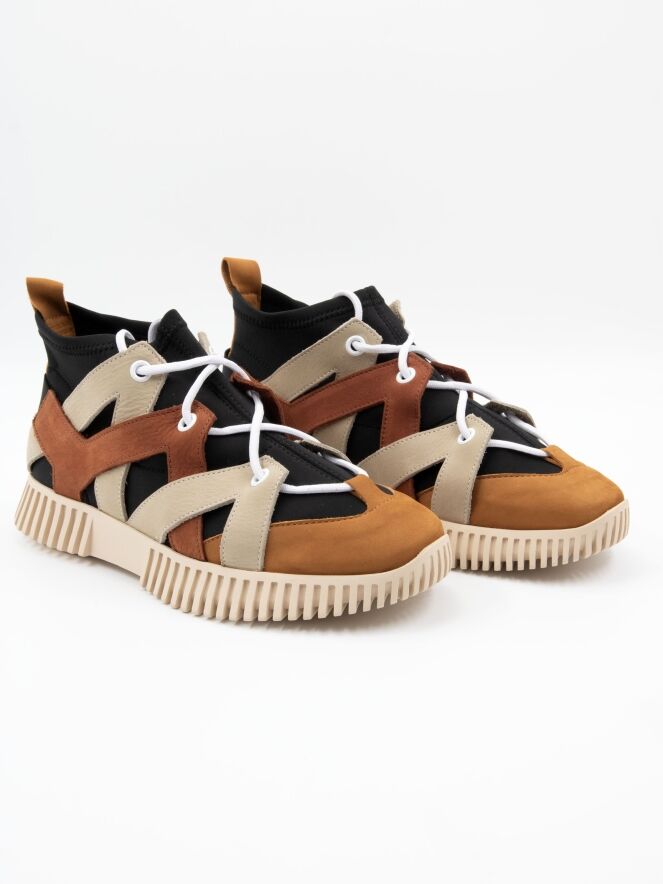 Een design sneaker van Arche in leer met een waterdicht sokje in het zwart. Het leer is in de kleuren beige en cognac verwerkt in diagonale banen langs de zijkanten en heeft een ronde neus. Aan de achterkant is het leer met elkaar verbonden door een elastische band. De roomwitte zool is geribbeld.