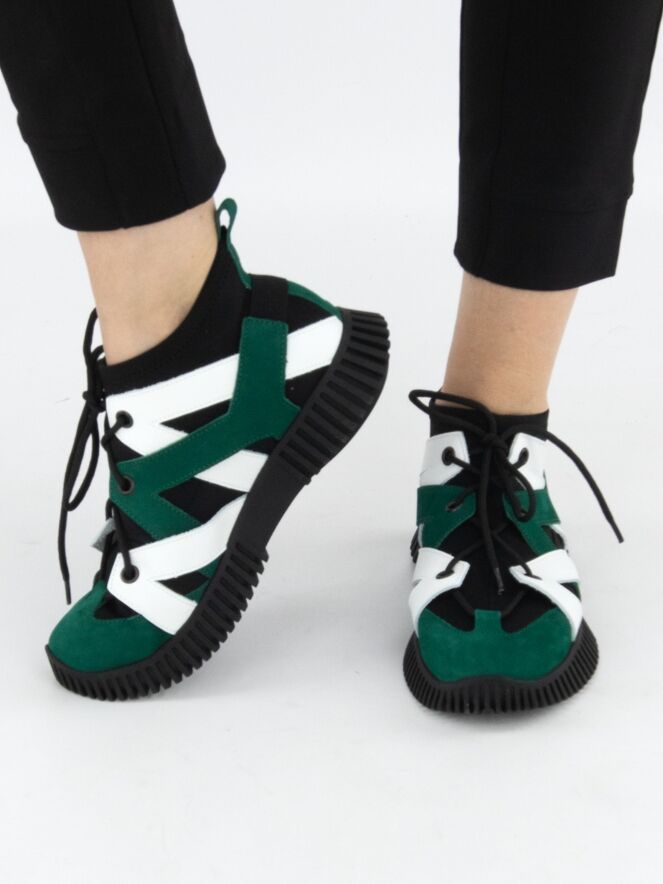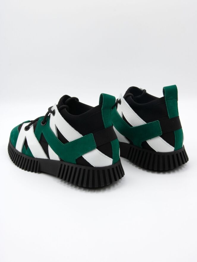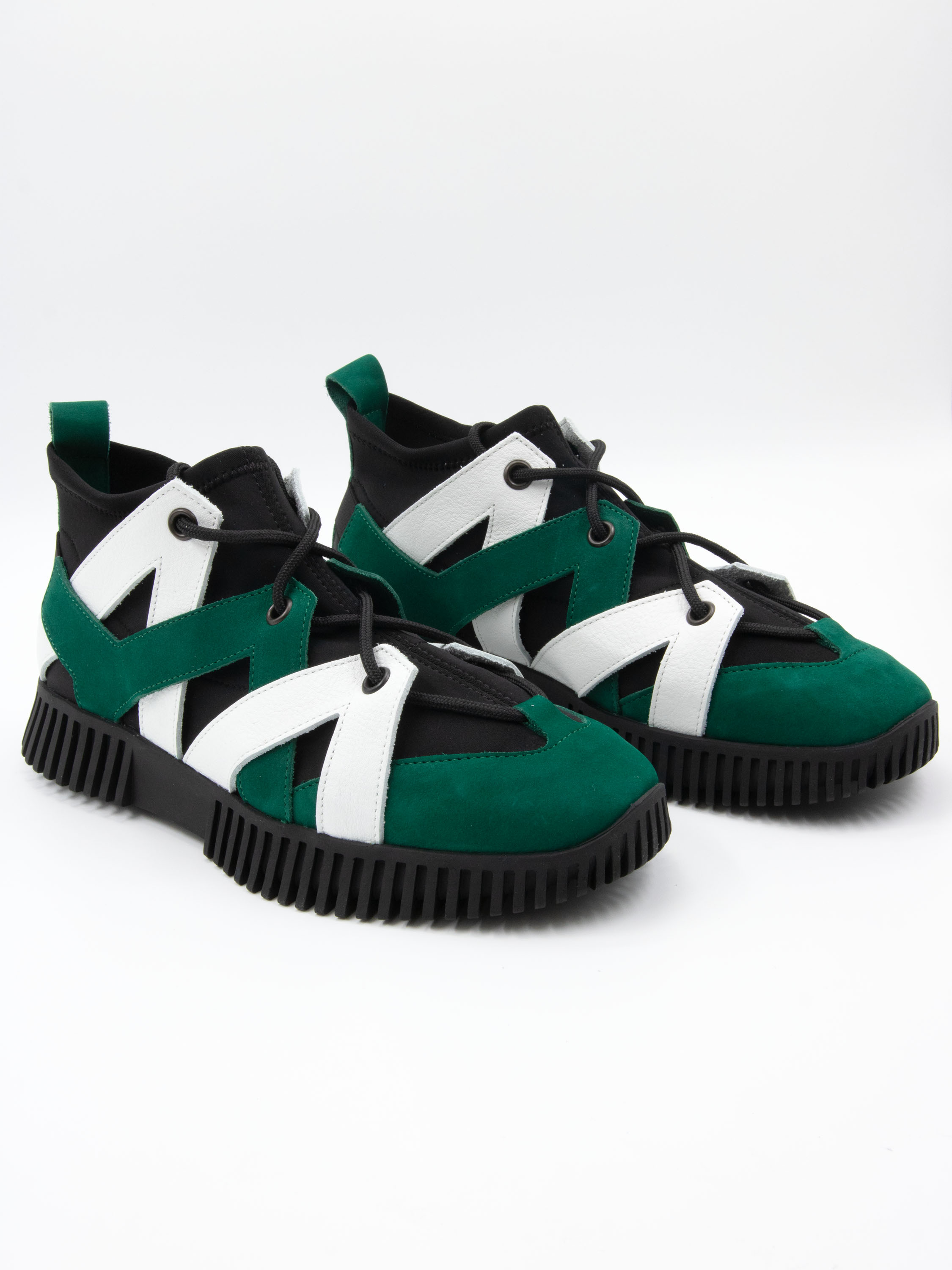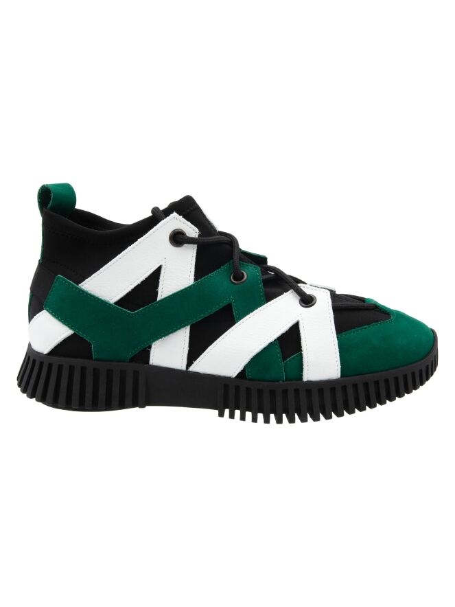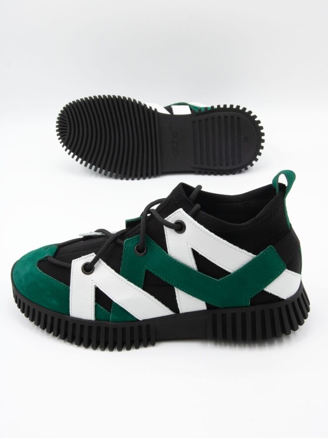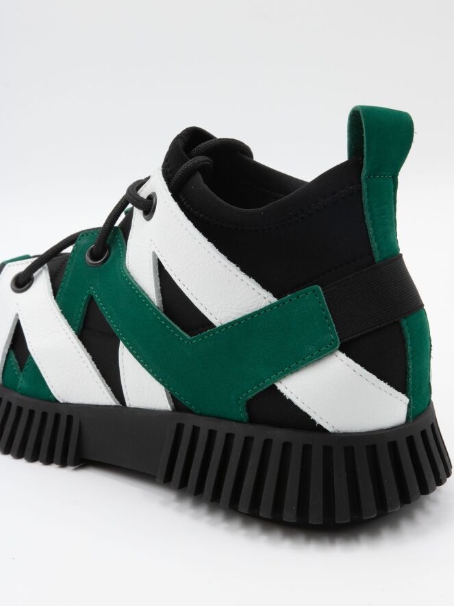 Een design sneaker van Arche in leder met een waterdicht sokje in het zwart. Het leder is in de kleur wit en groen in diagonale banen langs de zijkanten gemaakt met een ronde neus. Het leder is aan de achterkant met elkaar bevestigd met een elastieken band. De zwarte zool is geribbeld.
