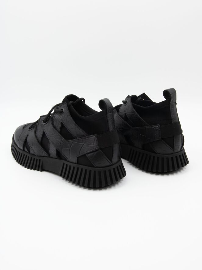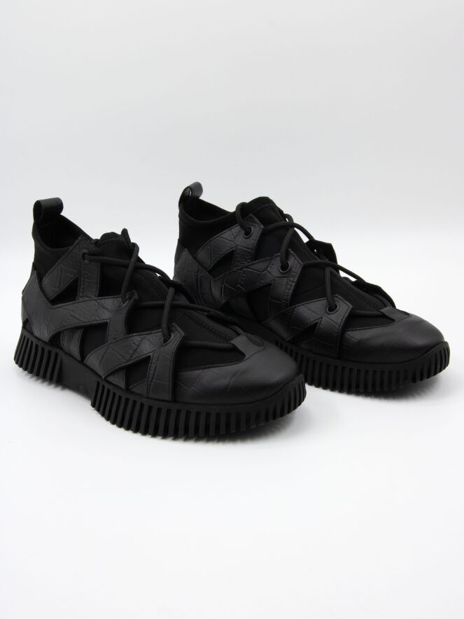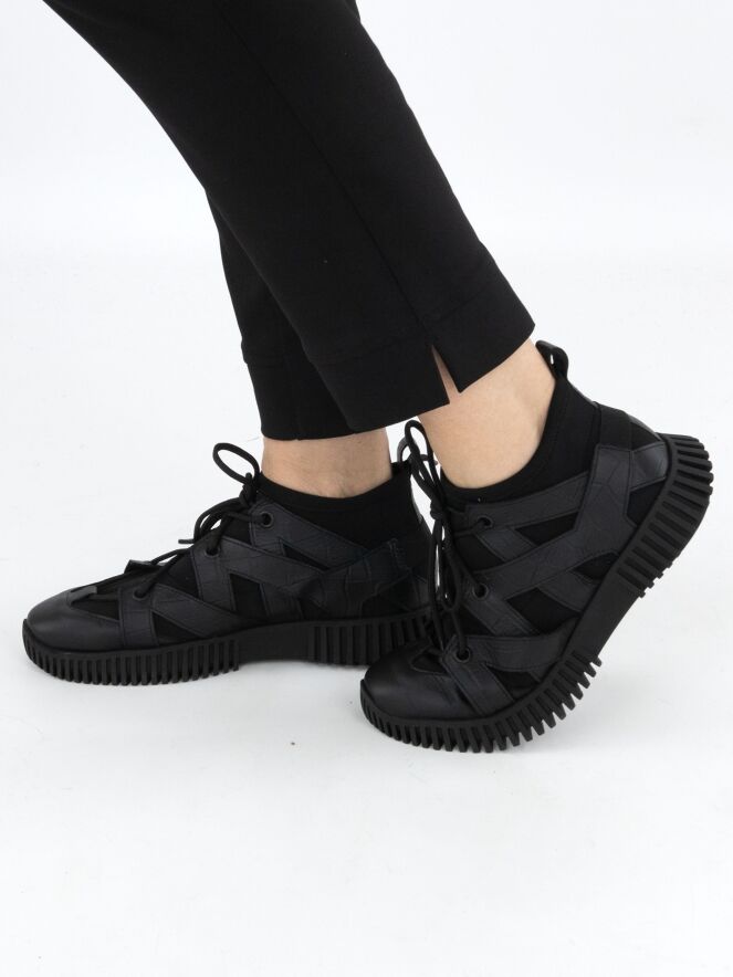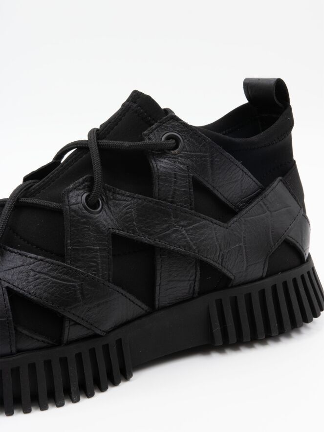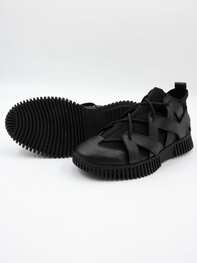 Een design sneaker van Arche in leder met een waterdicht sokje in het zwart. Het leder is in de kleur zwart in diagonale banen langs de zijkanten gemaakt met een ronde neus. Het leder is aan de achterkant met elkaar bevestigd met een elastieken band. De zwarte zool is geribbeld.
