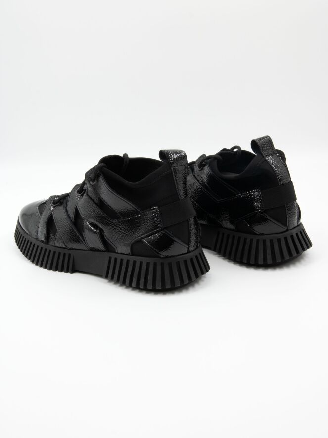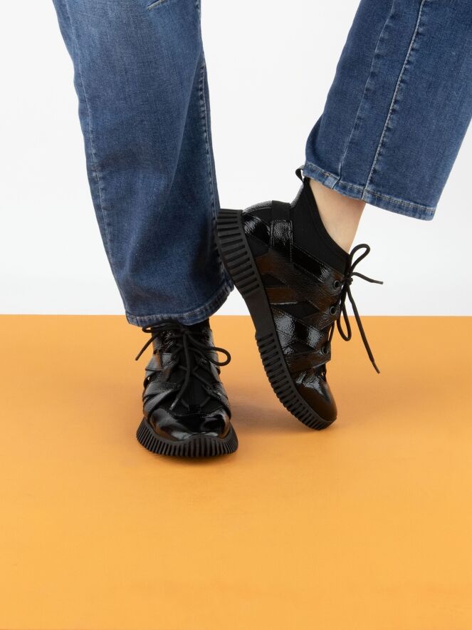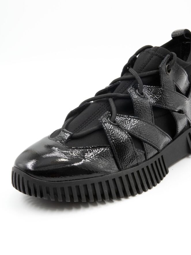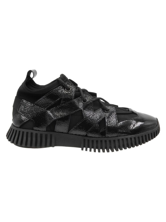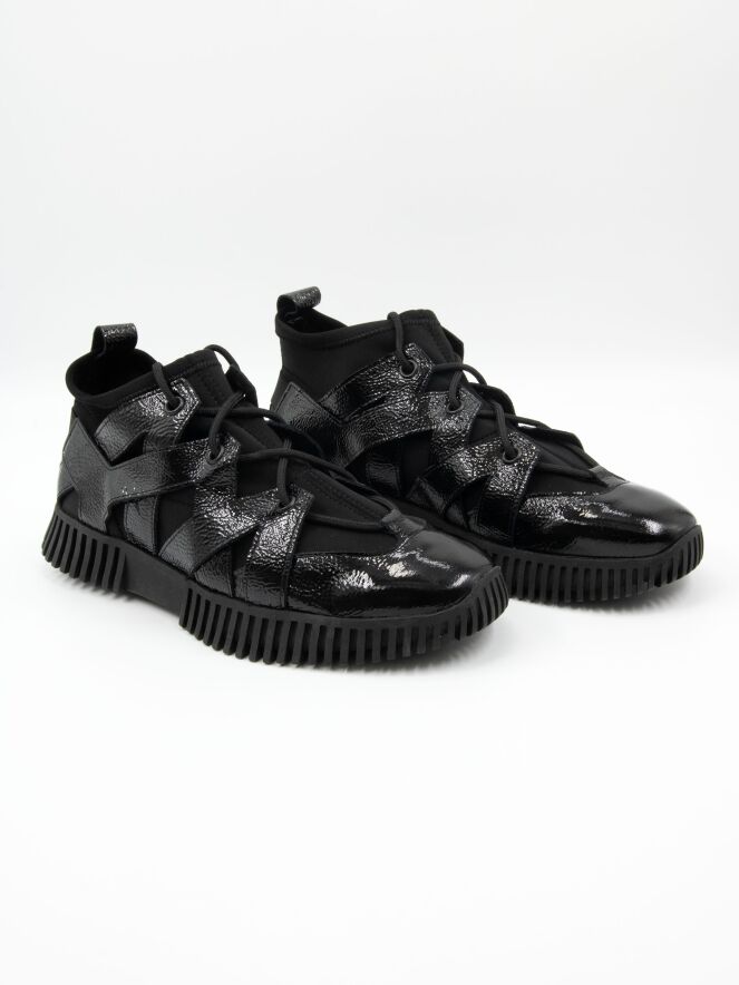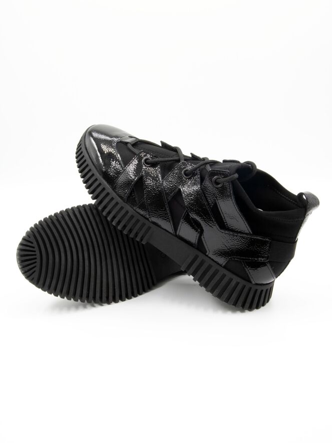 Een design sneaker van Arche in lakleder met een waterdicht sokje in het zwart. Het lakleder is uitgevoerd in diagonale banen langs de zijkanten en heeft een ronde neus. Aan de achterkant is het leder met elkaar verbonden door een elastische band. De zwarte zool is geribbeld.