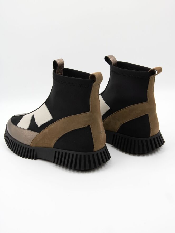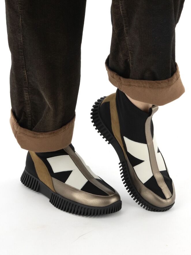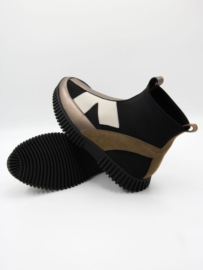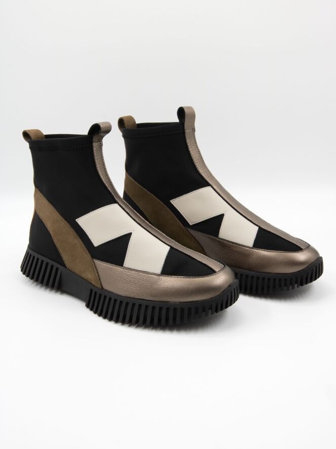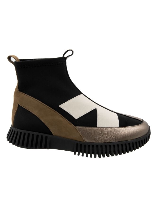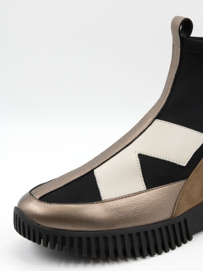 Een hoge design-sneaker van Arche in leer en nubuck, uitgevoerd in de kleuren brons, roomwit en camel op een zwarte achtergrond. De sneaker is vervaardigd uit zacht timberleder, nubuck en een elastische stof. De zwarte zool is recht gekarteld.