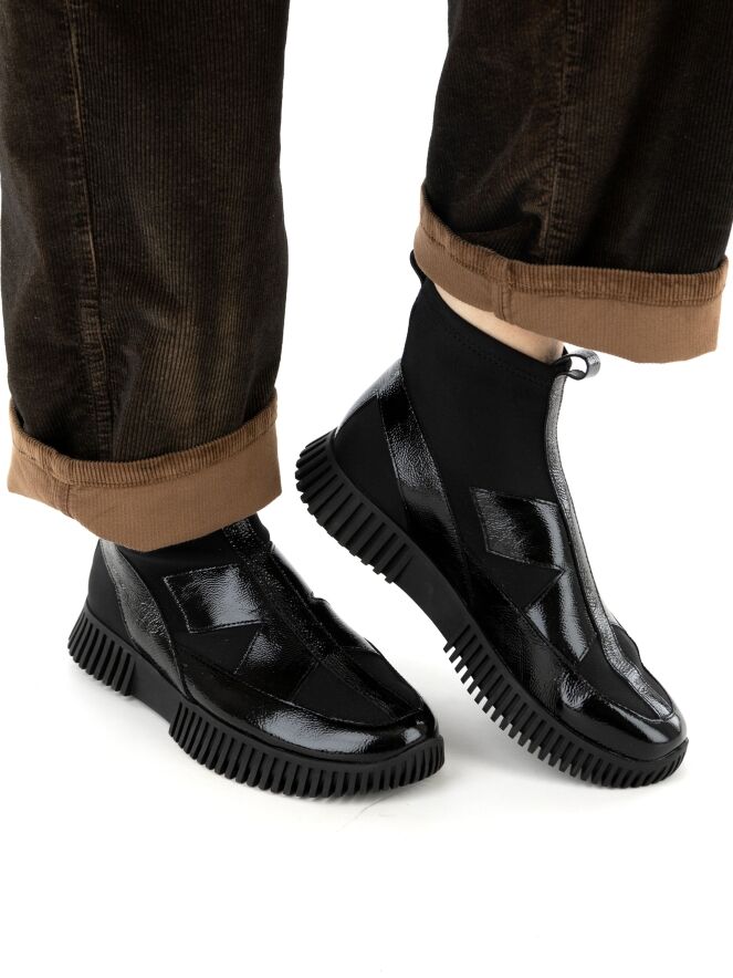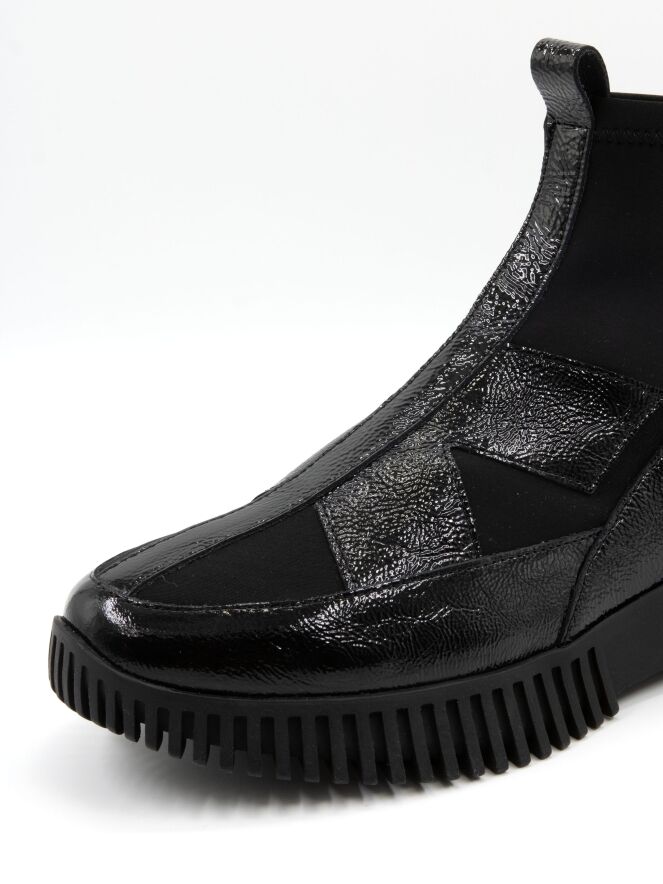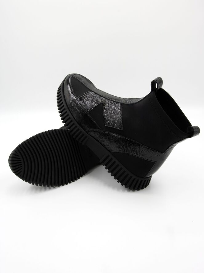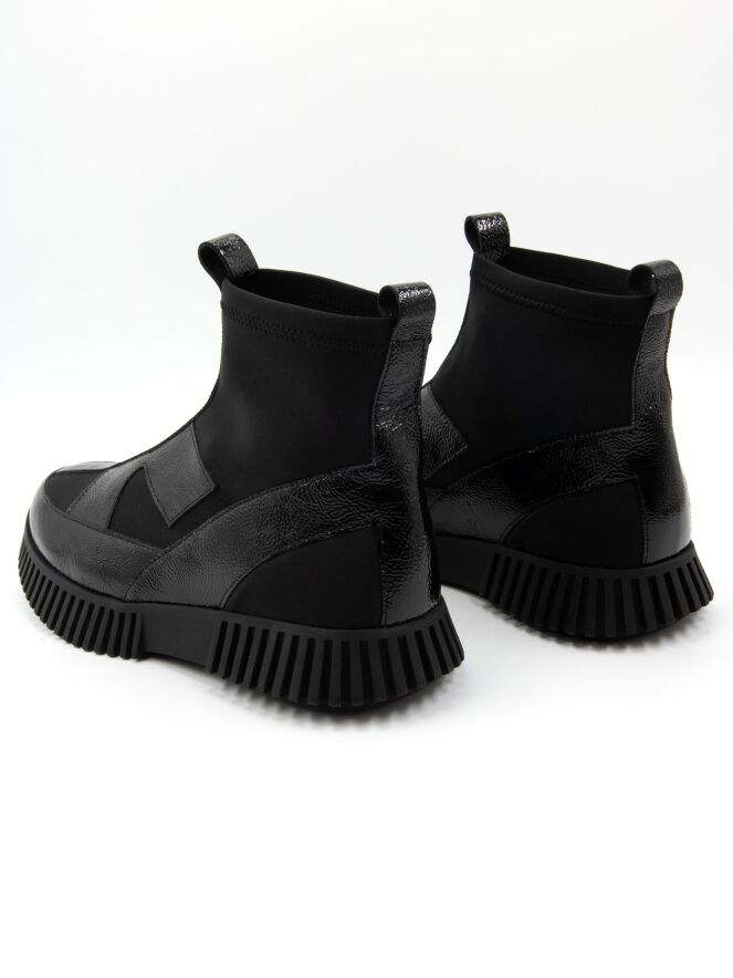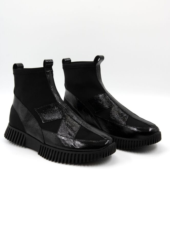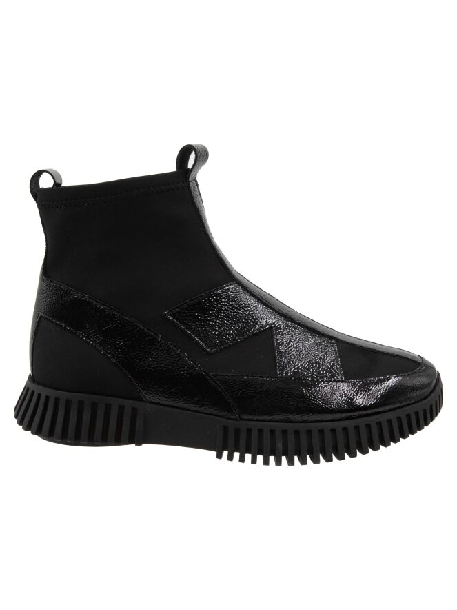 Een hoge design-sneaker van Arche in kreuklakleder met zwart elastiek. De zwarte zool is recht gekarteld.