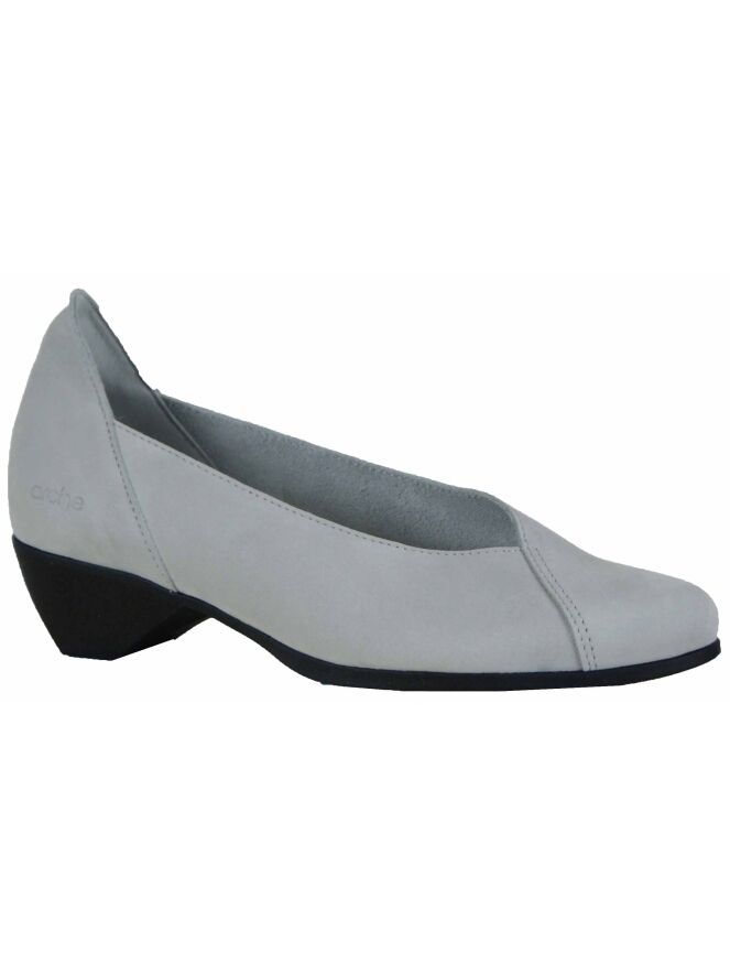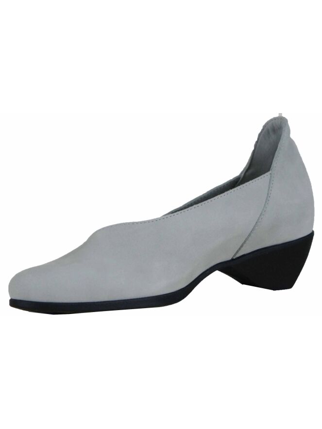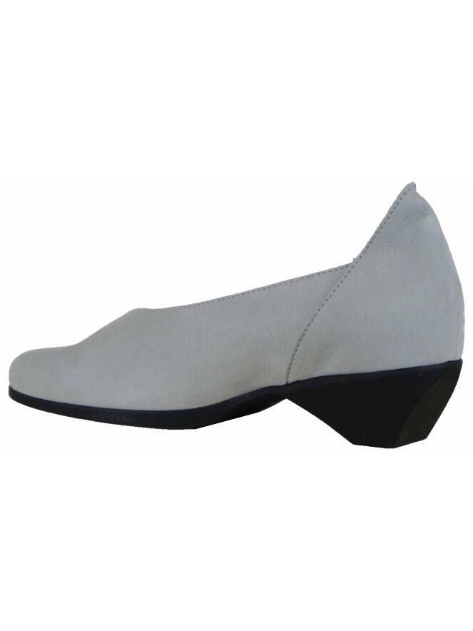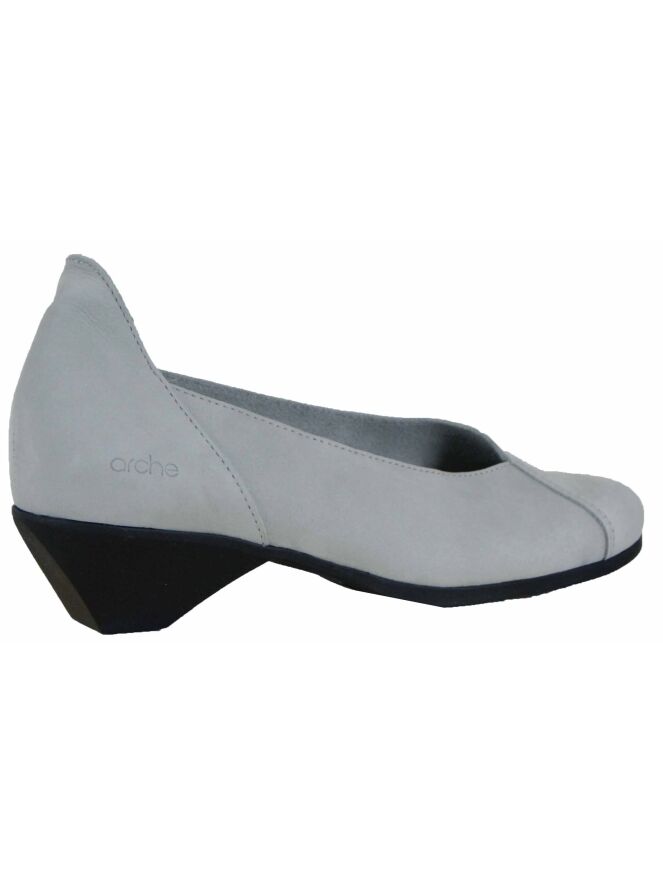Een pump van het merk Arche in de kleur licht grijs. De mooie ronde neus is aan één zijde onderbroken door een diagonaal gestikte naad. Dit detail komt terug op de hiel. De pump is niet gevoerd.