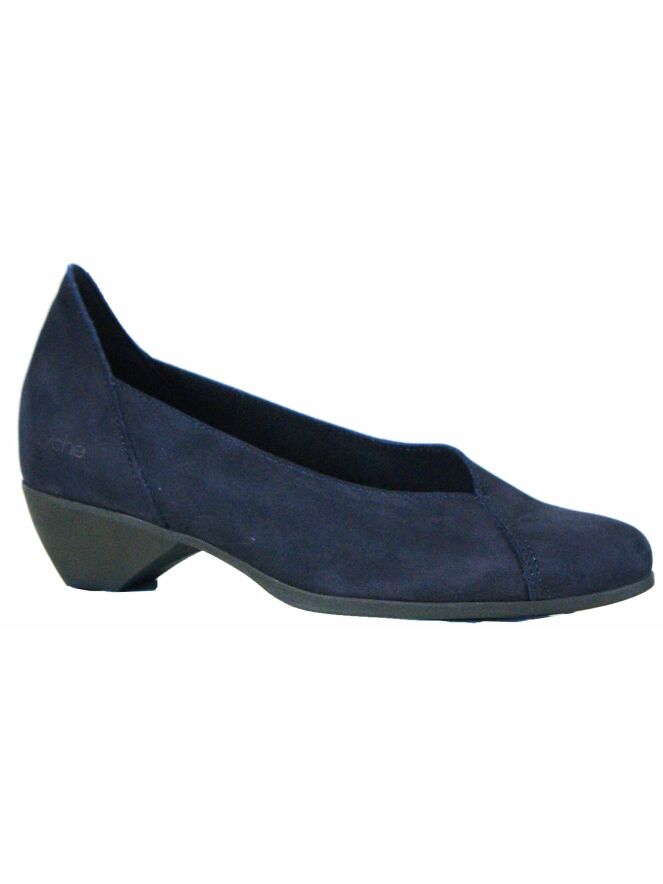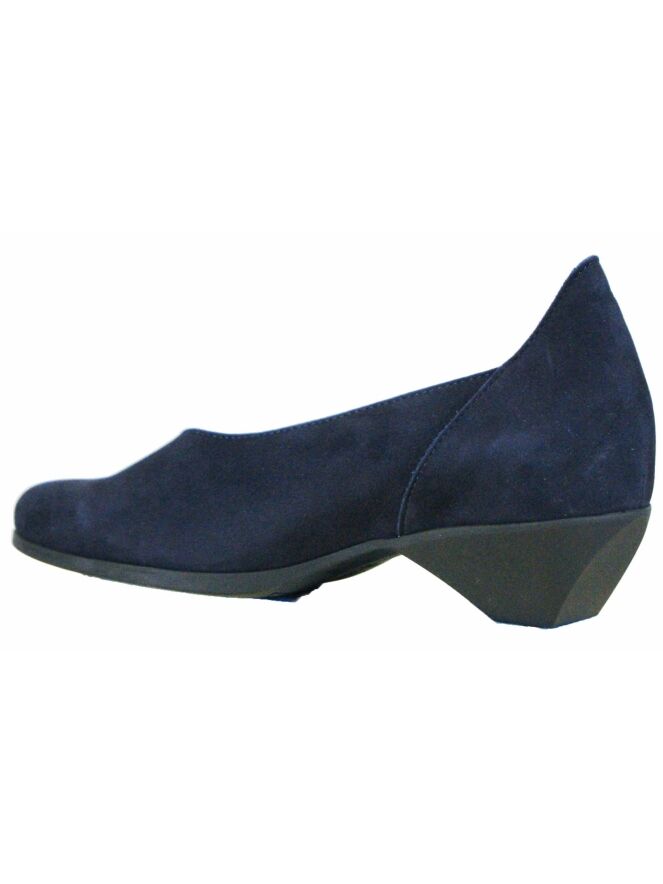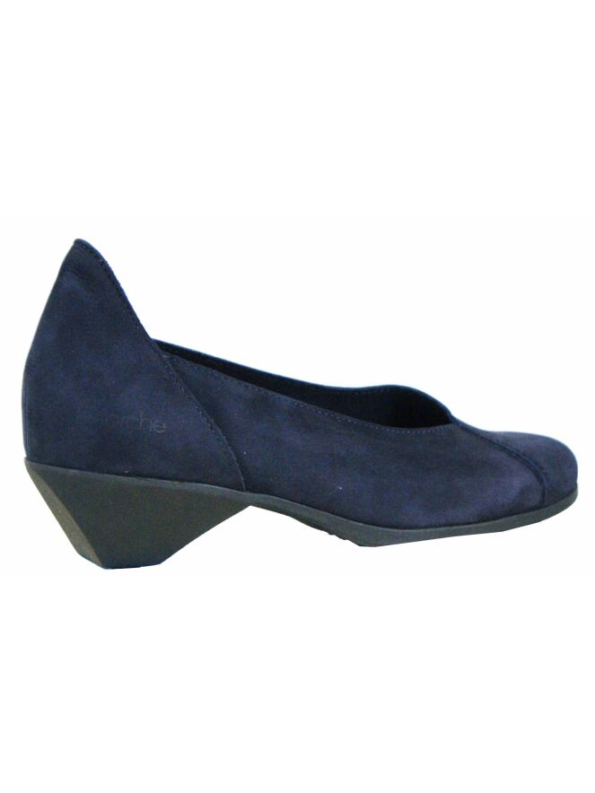 Een pump van het merk Arche in de kleur marine blauw. De mooie ronde neus is aan één zijde onderbroken door een diagonaal gestikte naad. Dit detail komt terug op de hiel. De pump is niet gevoerd.