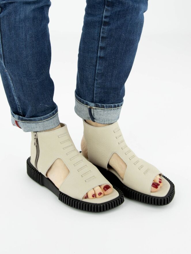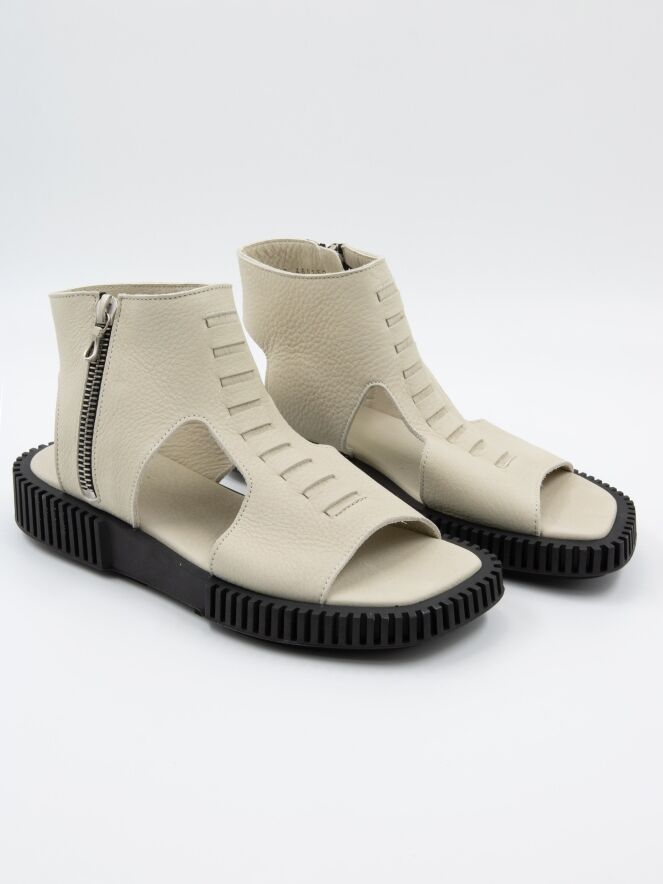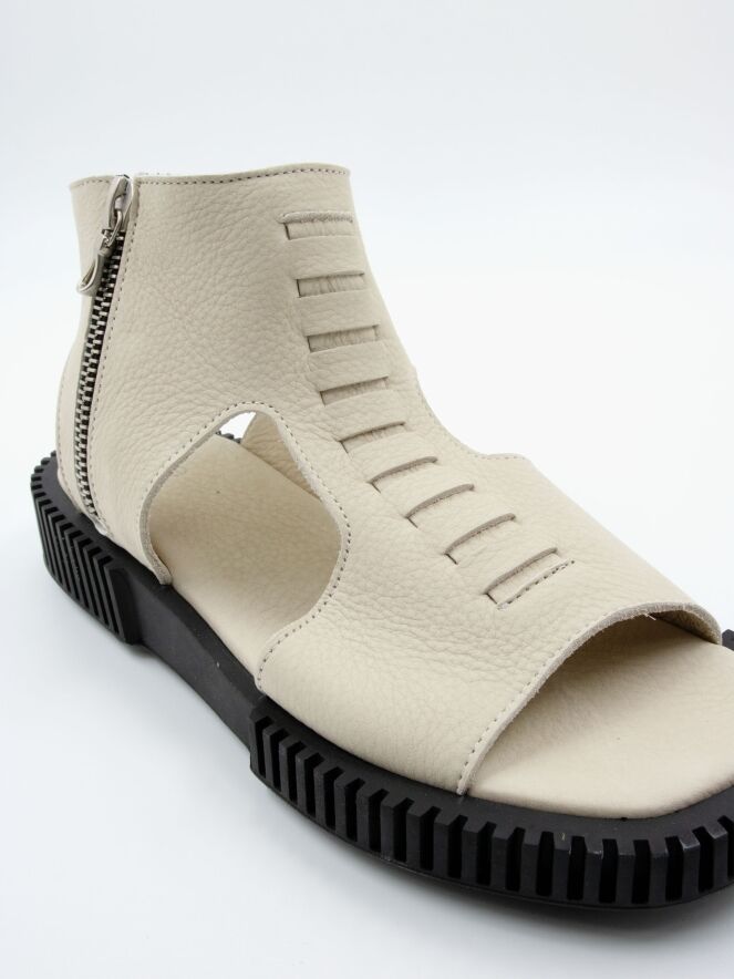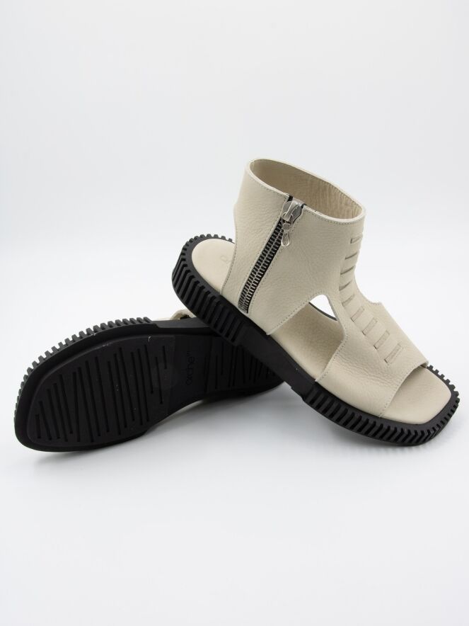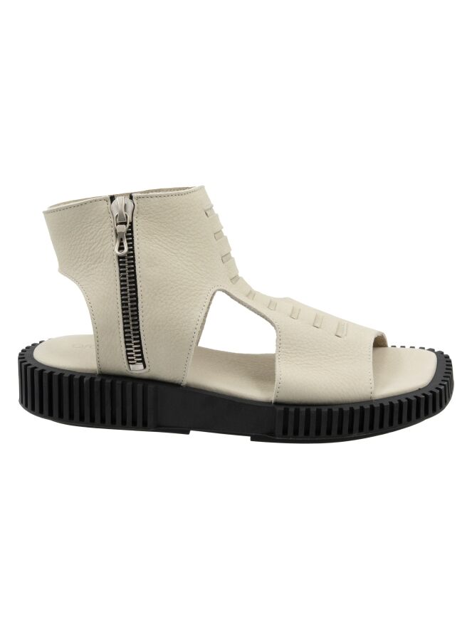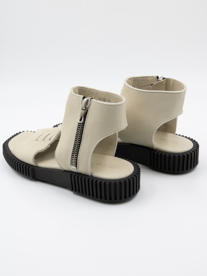 Een sandaal van Arche in de kleur roomwit. De sandaal heeft over het midden van de voorvoet openingen in een streepvorm, waardoor een lederen bies loopt. Aan de buitenzijde bevindt zich een zilveren rits. De sandaal heeft een open hiel en de rand van de zool is geribbeld.