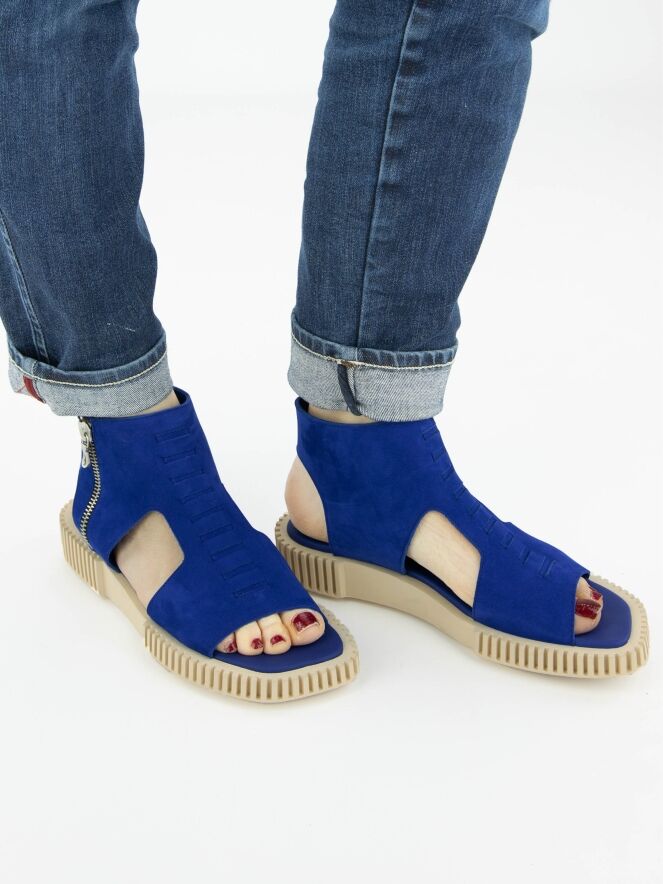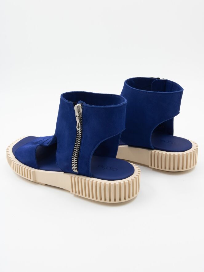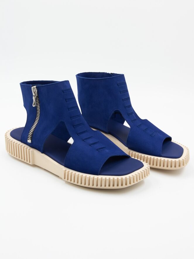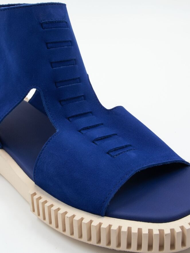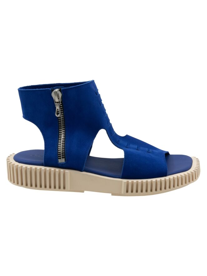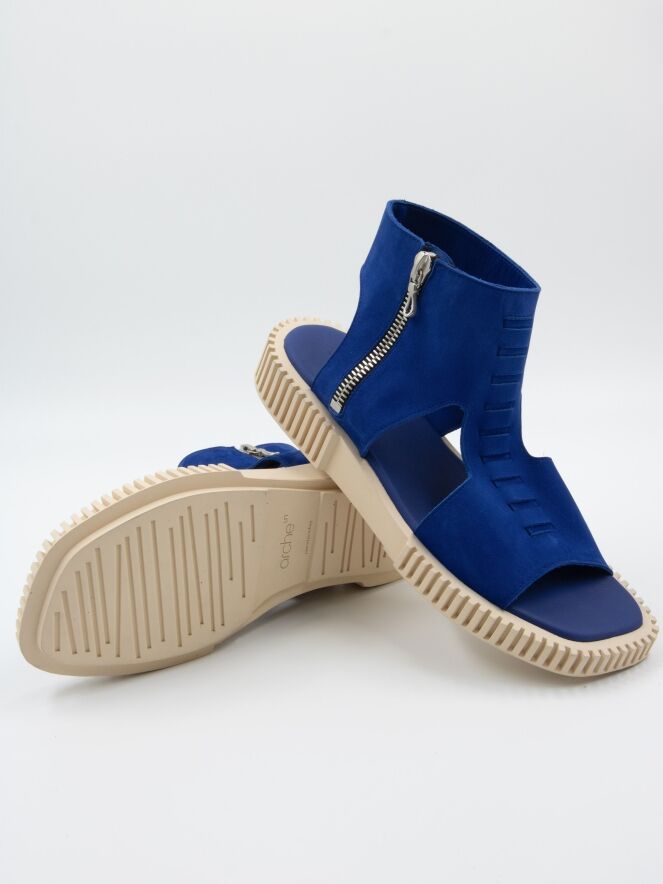 Een sandaal van Arche in de kleur kobaltblauw. De sandaal heeft over het midden van de voorvoet openingen in een streepvorm, waardoor een lederen bies loopt. Aan de buitenzijde bevindt zich een zilveren rits. De sandaal heeft een open hiel en de rand van de zool is geribbeld.