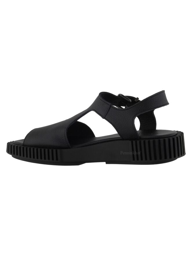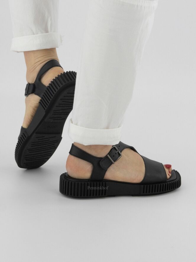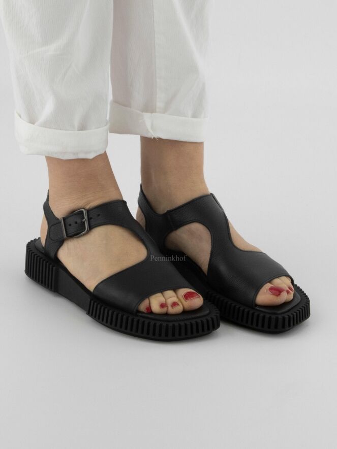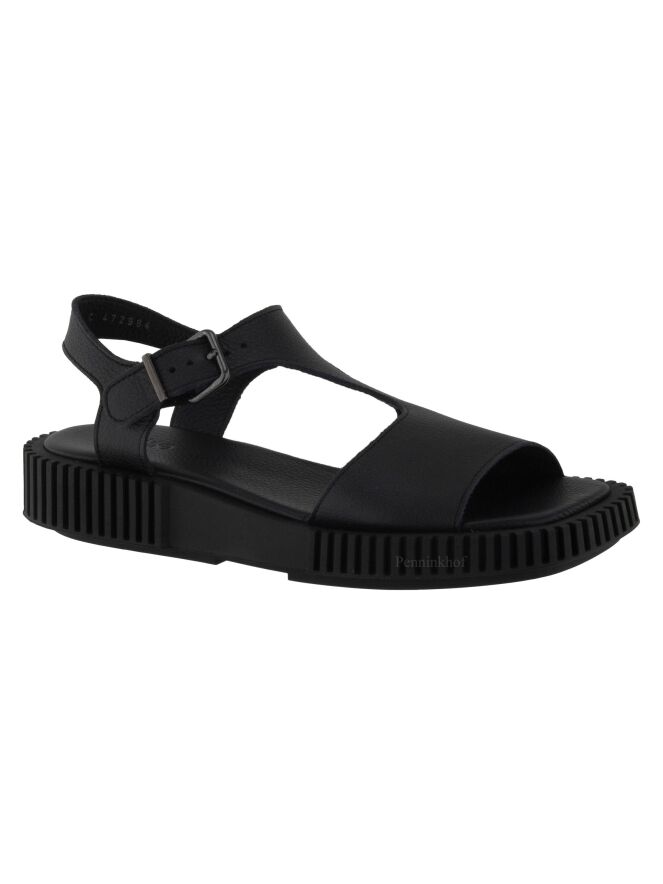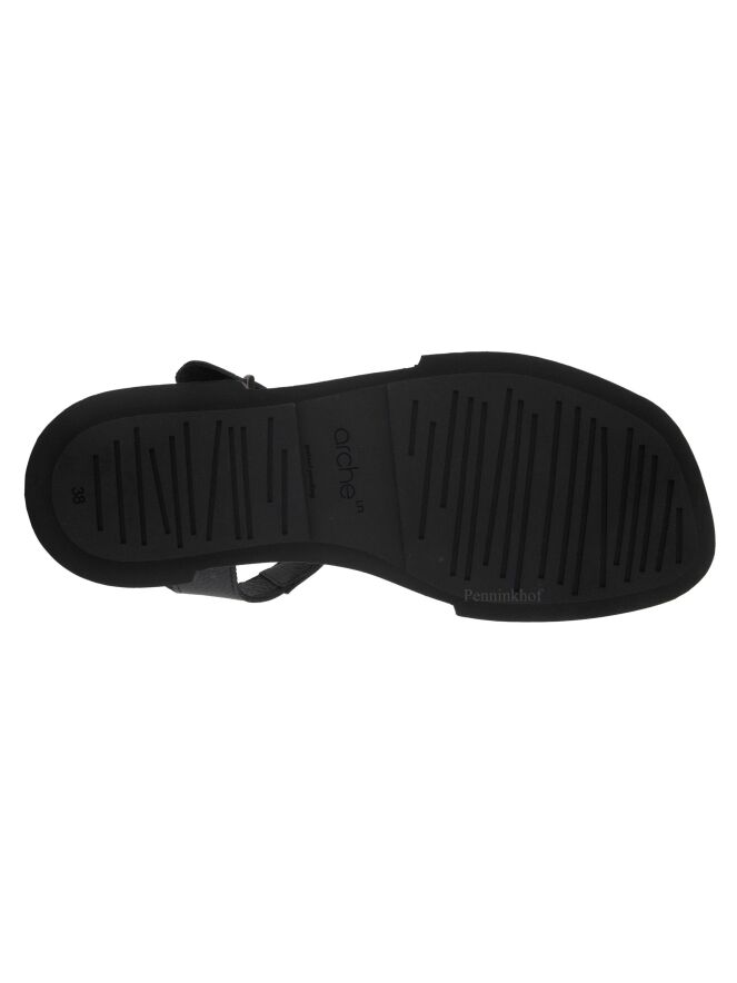 Een open sandaal van Arche in de kleur zwart. Het riempje over de voorvoet is verstelbaar met een gesp. De zwarte zool is gekarteld.