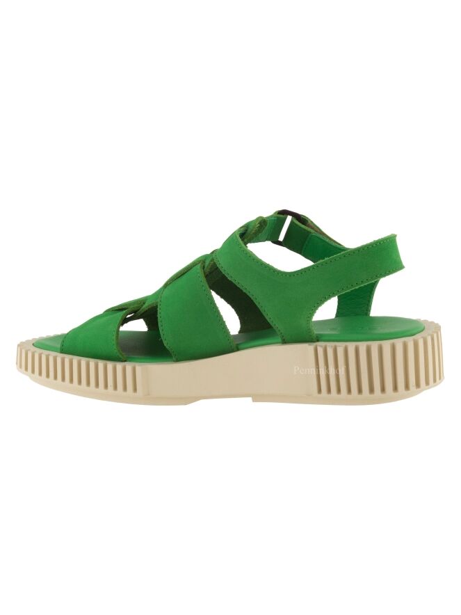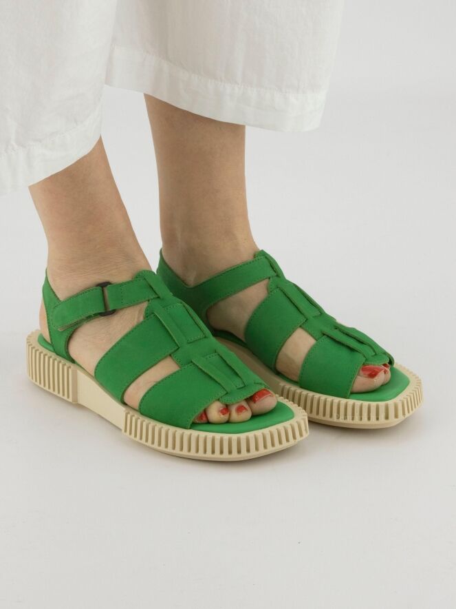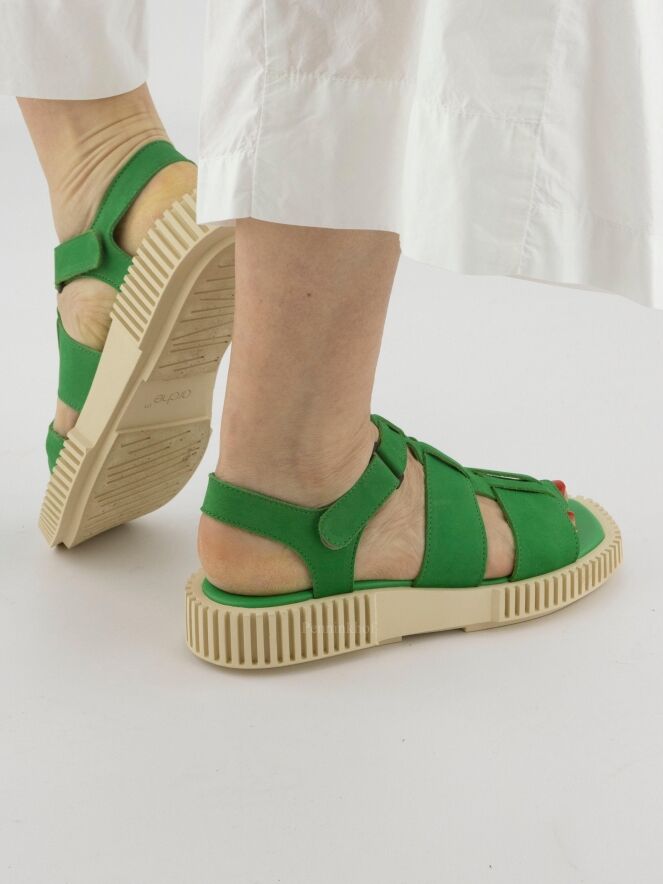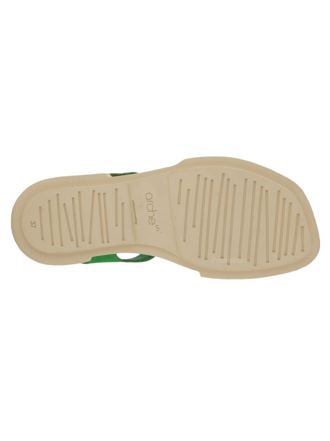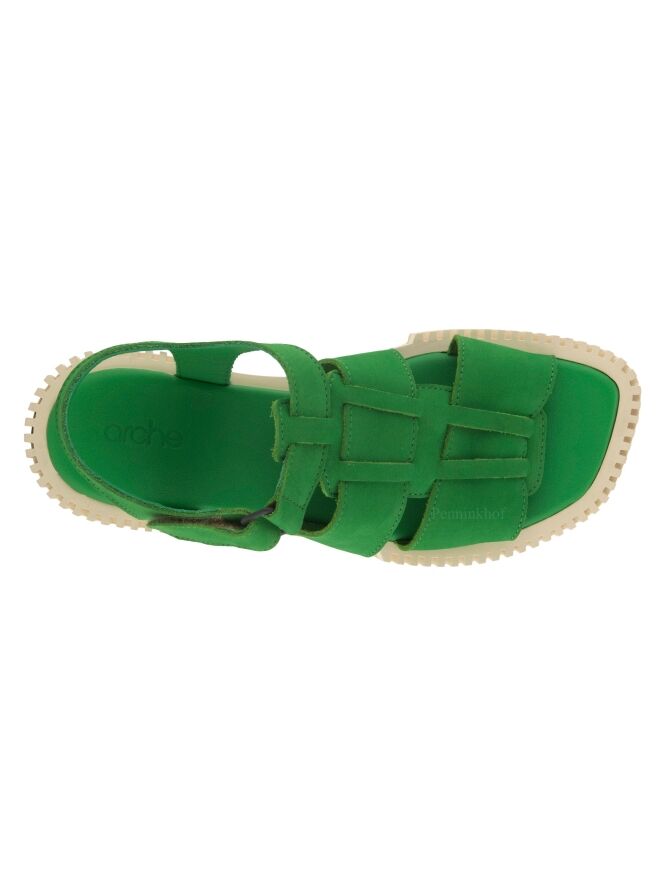 Een sandaal van Arche in een groene kleur. De zool is in rechte lijnen geribbeld. De sluiting om de voet is met klittenband verstelbaar.