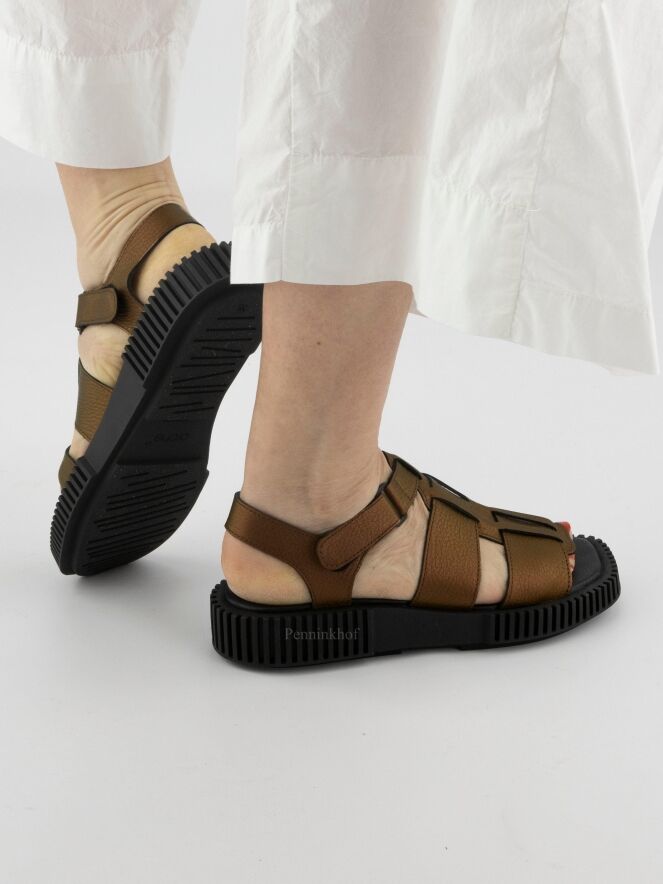Een sandaal van Arche in een metallic bronzen kleur. De zool is in rechte lijnen geribbeld. De sluiting om de voet is met klitteband verstelbaar.