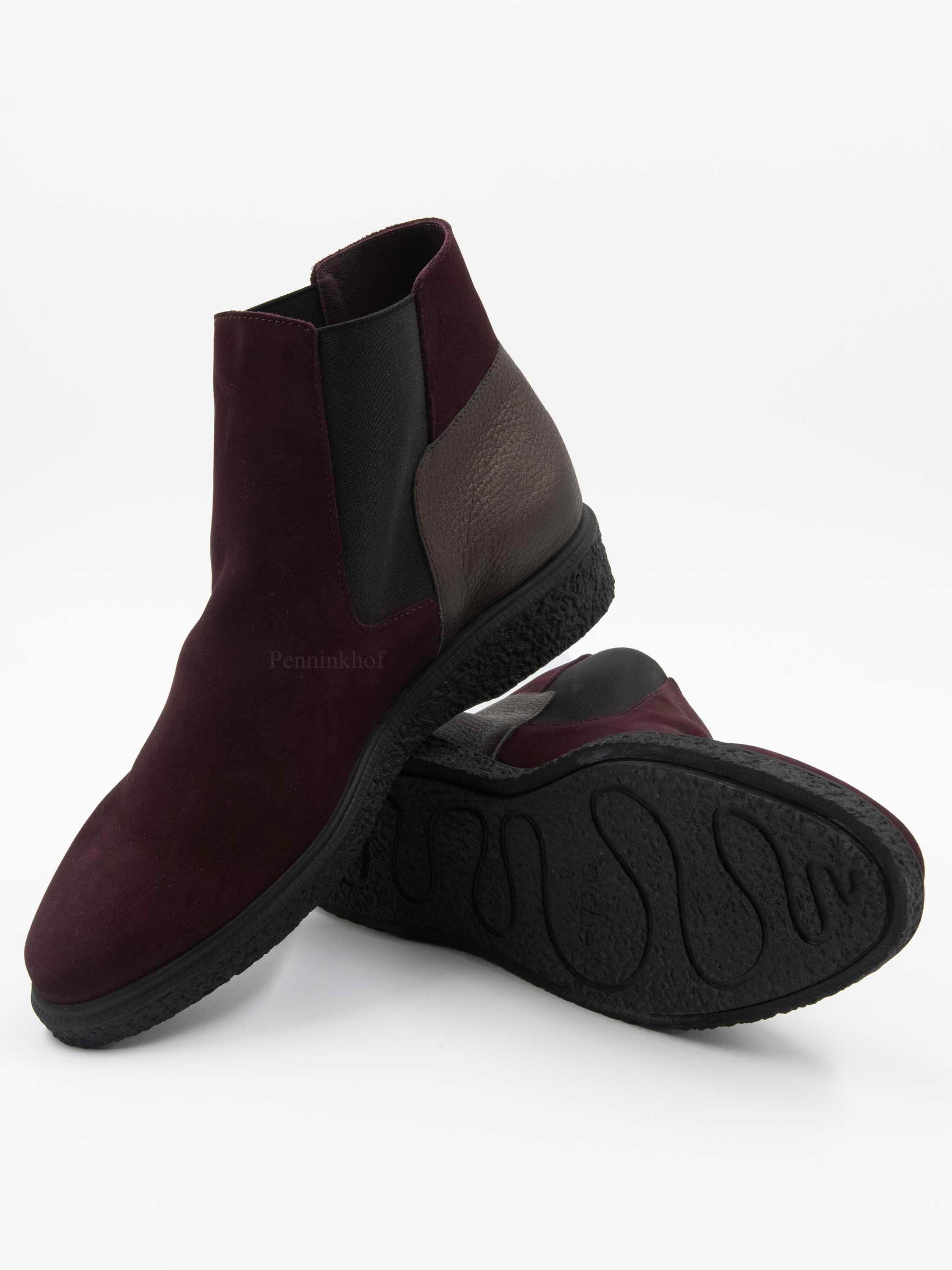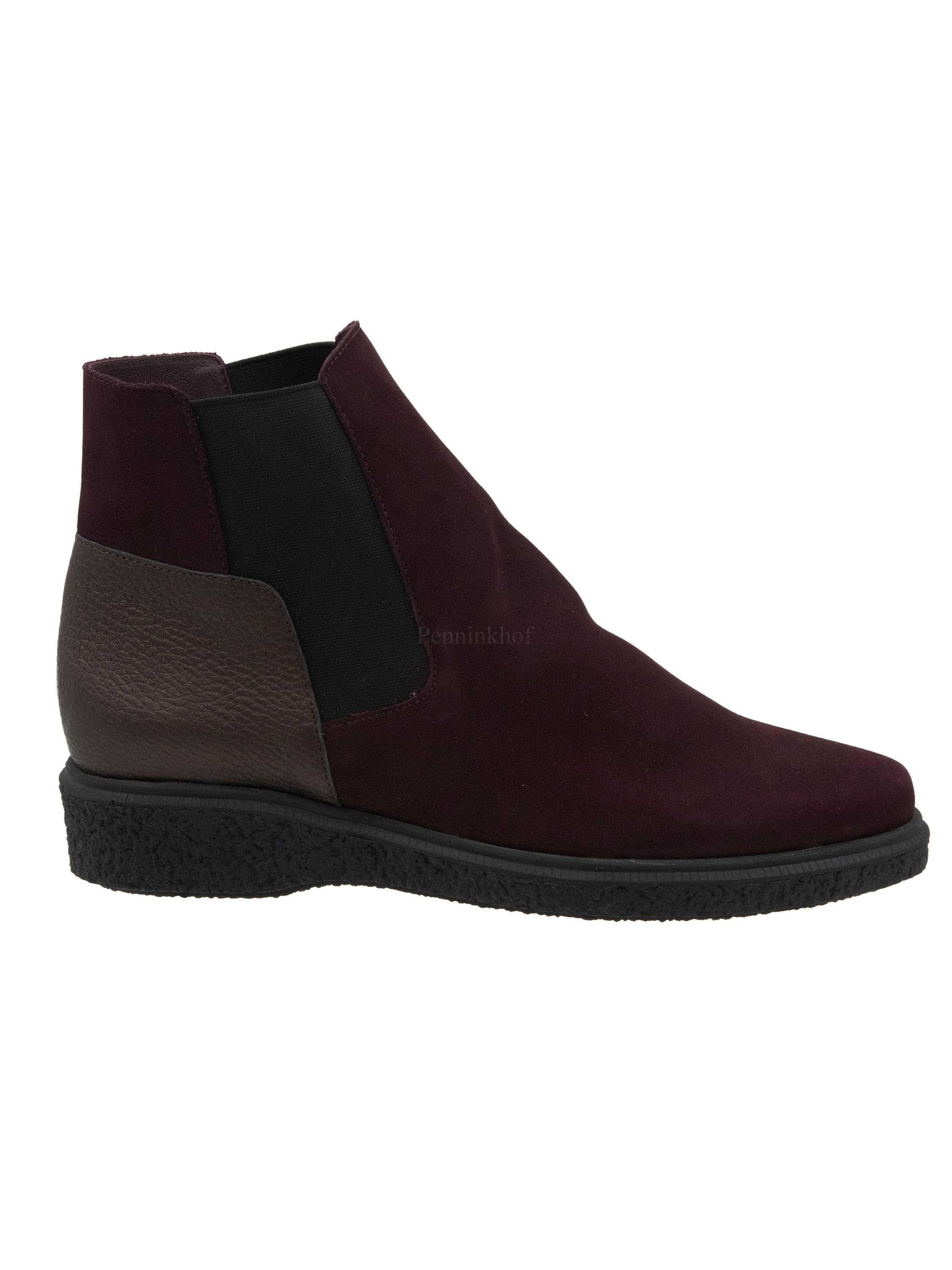 Een kort laarsje van Arche in de kleur bordeauxrood. Aan beide zijkanten van de korte schacht is een elastiek stuk stof ingezet. Op de hiel is een bordeauxrood stuk leder. Het laarsje is ongevoerd.