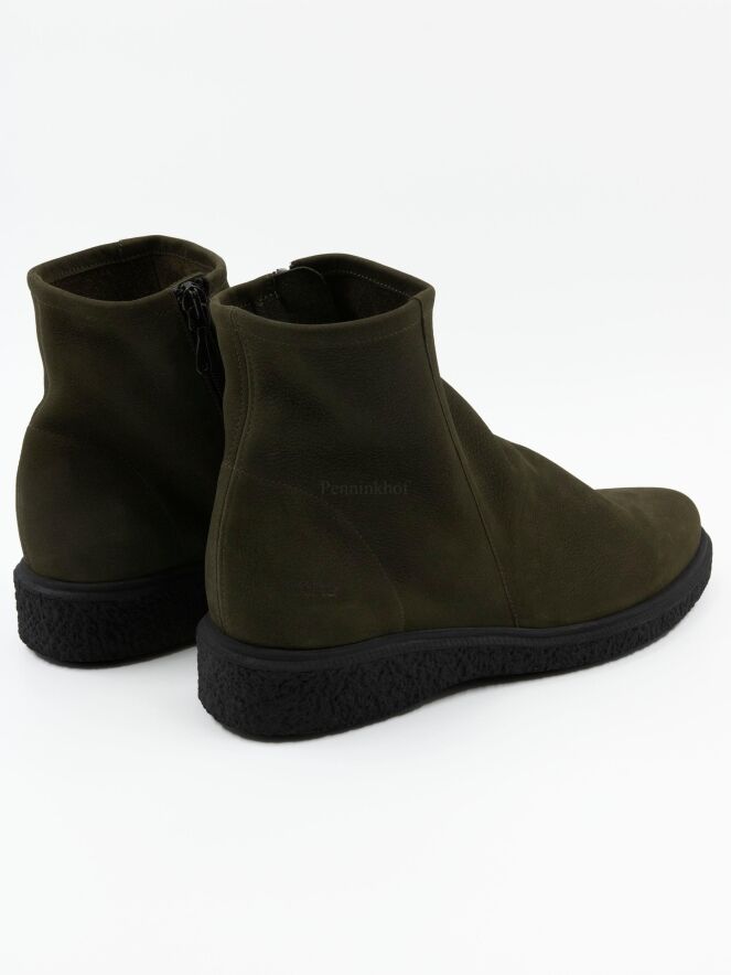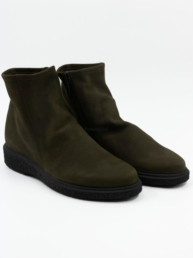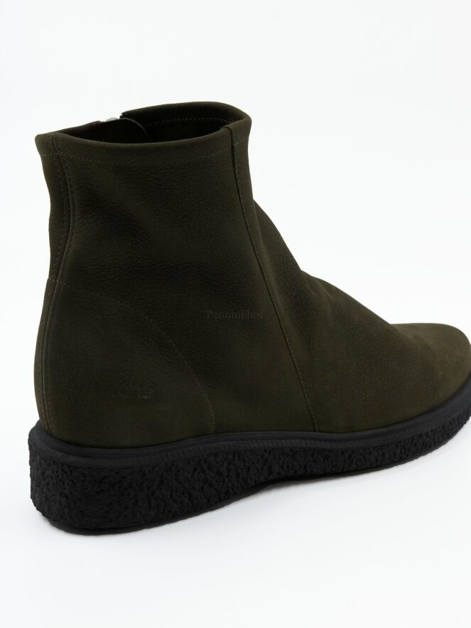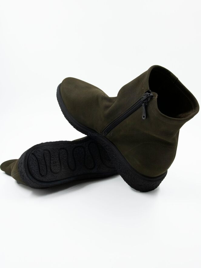 Een laarsje van Arche in de kleur olijfgroen. Aan de binnenzijde is een zwarte rits. De zool is in de kleur zwart. De binnenkant is ongevoerd.