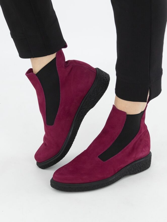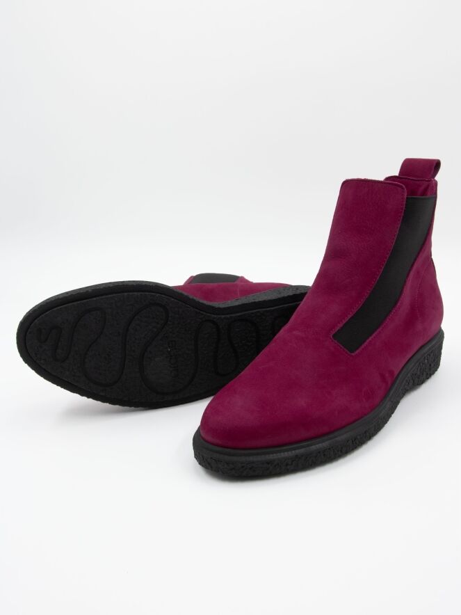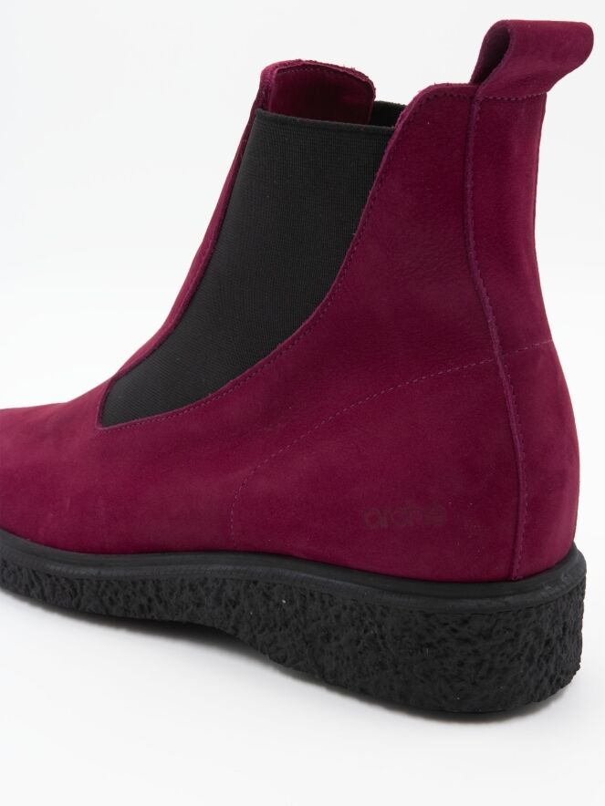 Een enkellaarsje van Arche in zachte bordeaux kleur. Aan beide zijden van de voorvoet is een elastieken stof die met de vorm van de voorvoet naar de schacht is mee gevormd. De binnenkant is ongevoerd.