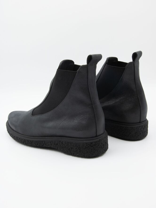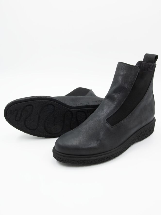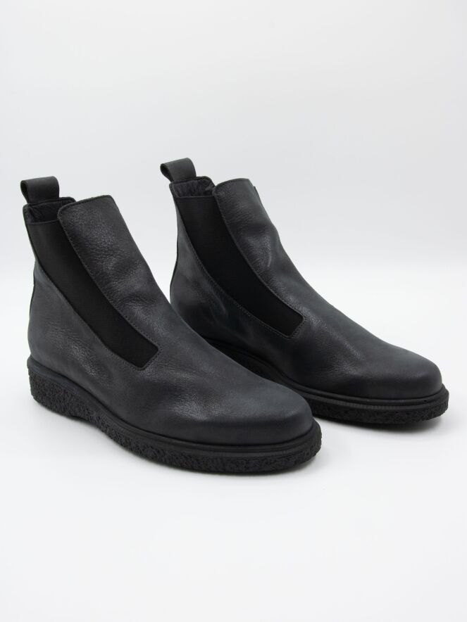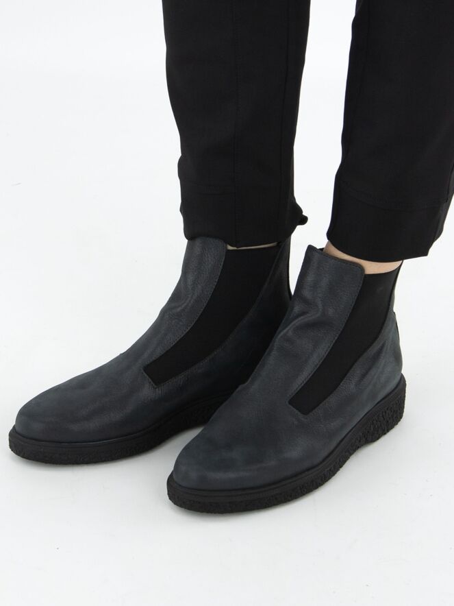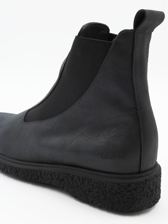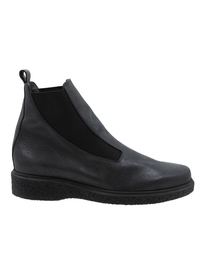 Een enkellaarsje van Arche in donkergrijze kleur. Aan beide zijden van de voorvoet is een elastieken stof die met de vorm van de voorvoet naar de schacht is mee gevormd. De binnenkant is ongevoerd.