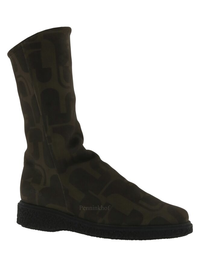 Een half hoog laarsje van Arche in een grafische print met de kleuren khaki en zwart. Aan de binnenzijde is een zwarte rits. De zool is geribbeld. Het laarsje heeft een ronde neus en de binnenkant is met gekookte wol gevoerd.