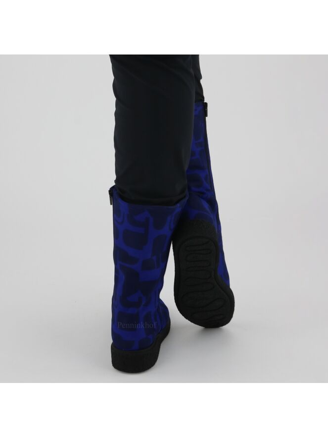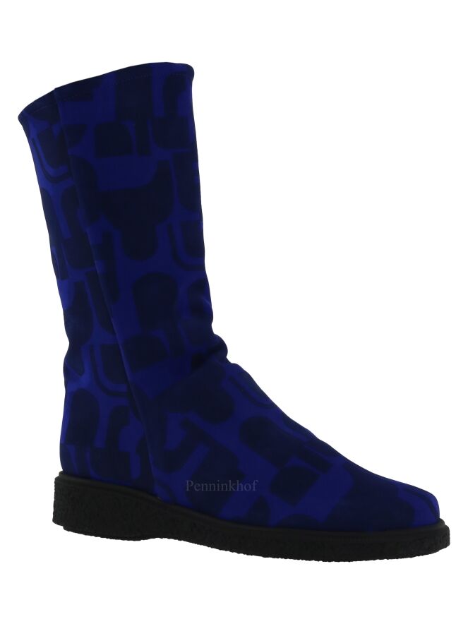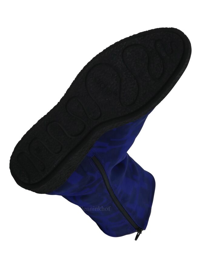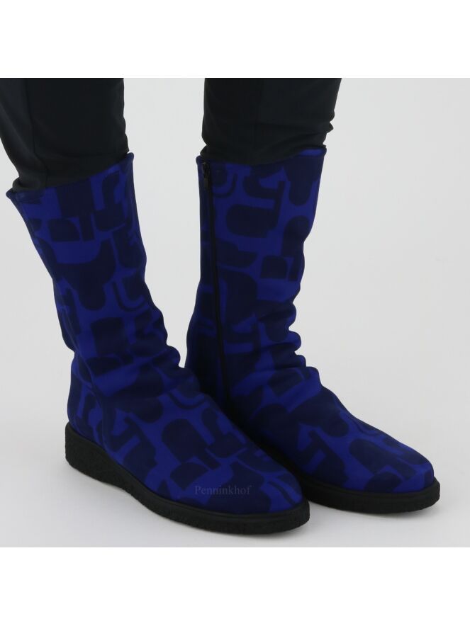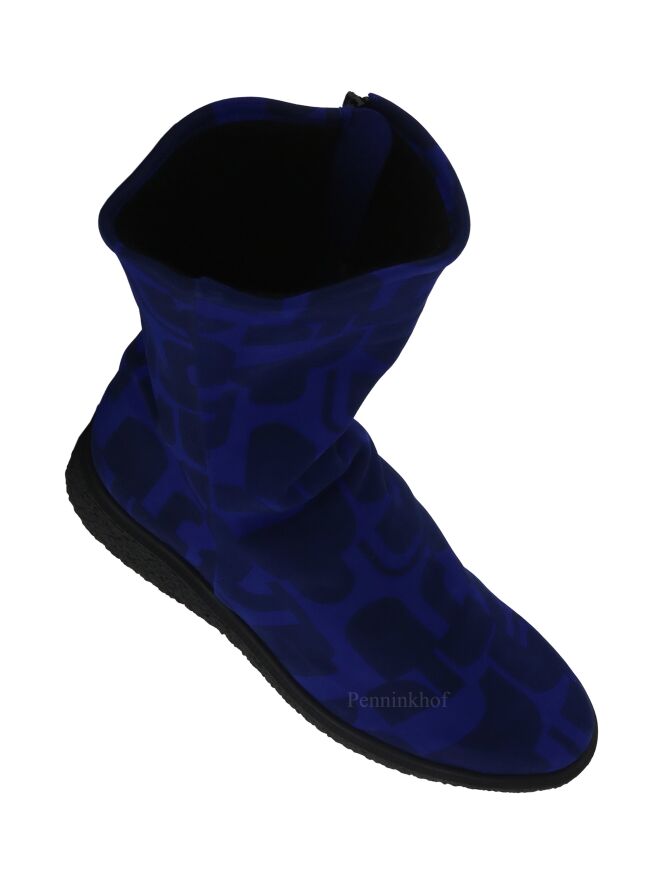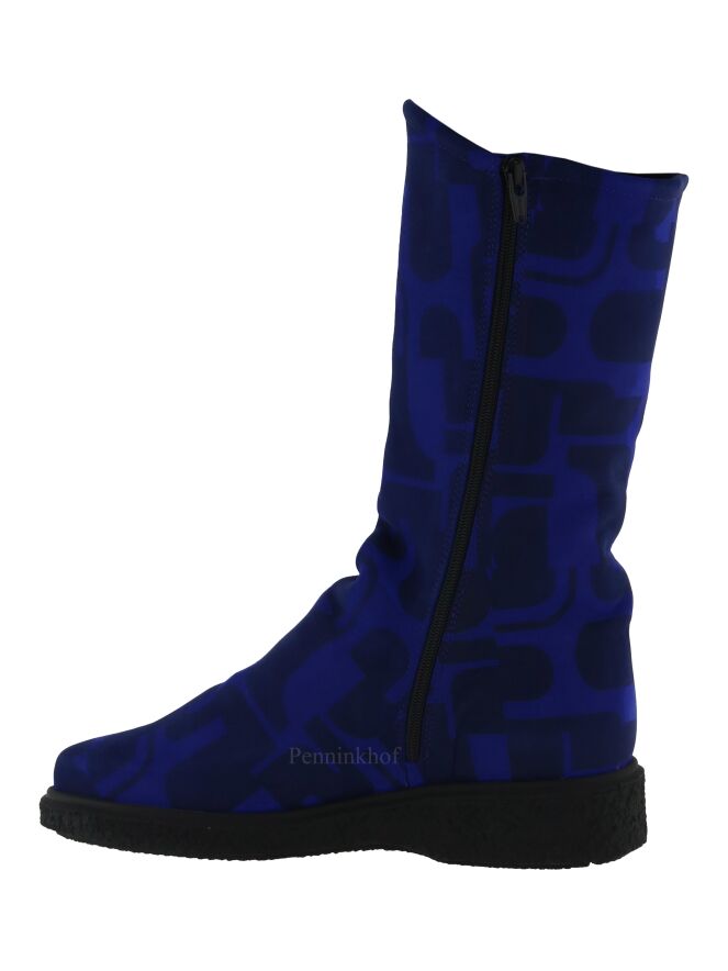 Een half hoog laarsje van Arche in een grafische print met de kleuren kobaltblauw en zwart. Aan de binnenzijde is een zwarte rits. De zool is geribbeld. Het laarsje heeft een ronde neus en de binnenkant is met gekookte wol gevoerd.