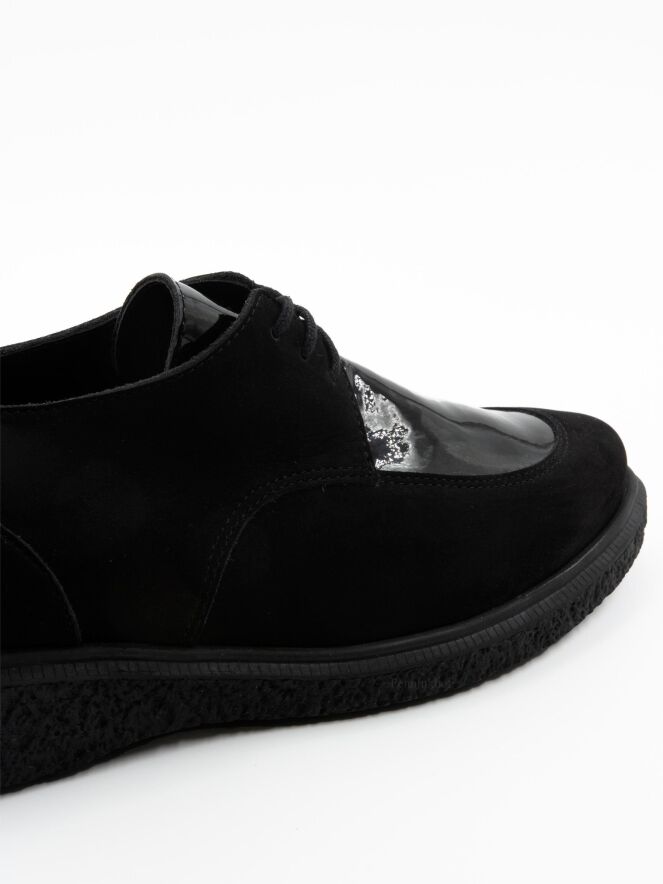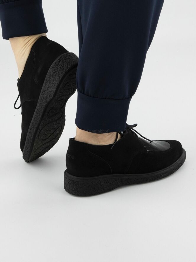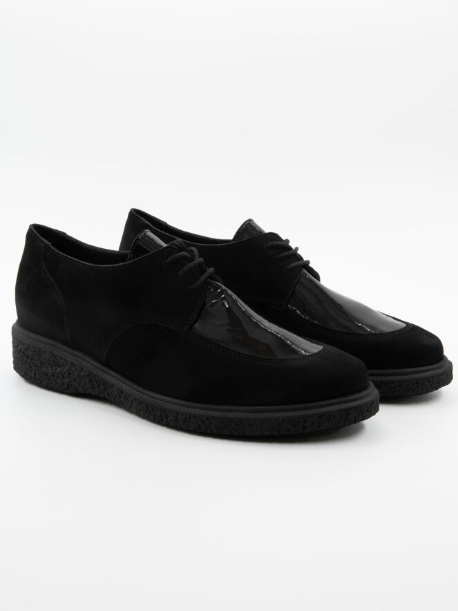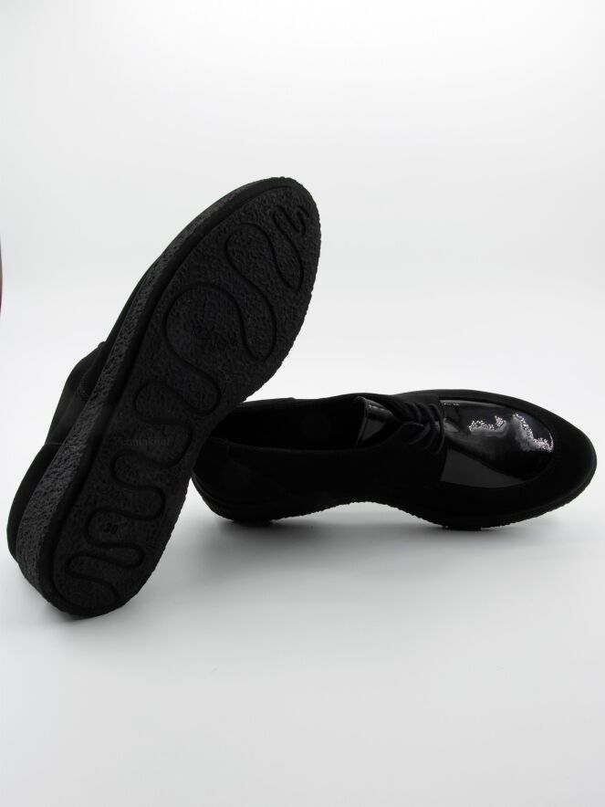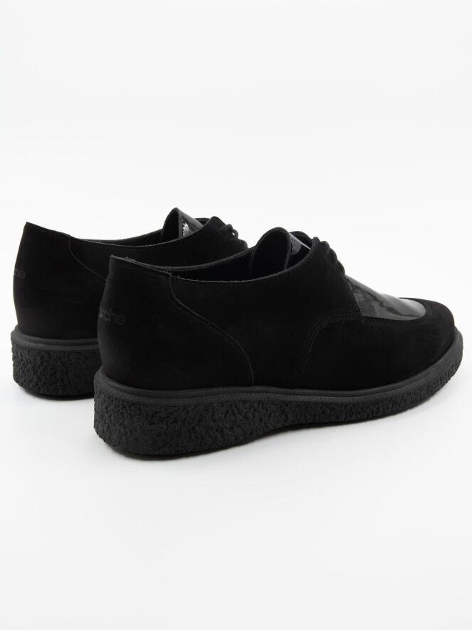 Een veterschoen van Arche in de kleur zwartDe bovenkant van de voorvoet is in een zwart lakleder. De binnenkant is ongevoerd.