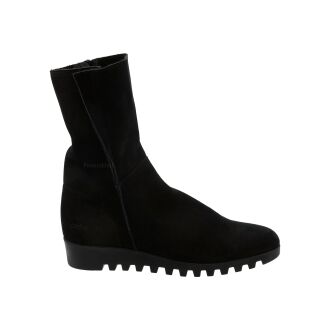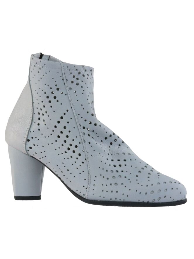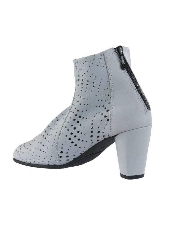Een kort laarsje van Arche in de kleur licht grijs. Het leder is fijn geperforeerd. De hiel is in uni leder met een ritsje in een zwarte kleur. De binnenkant is ongevoerd.