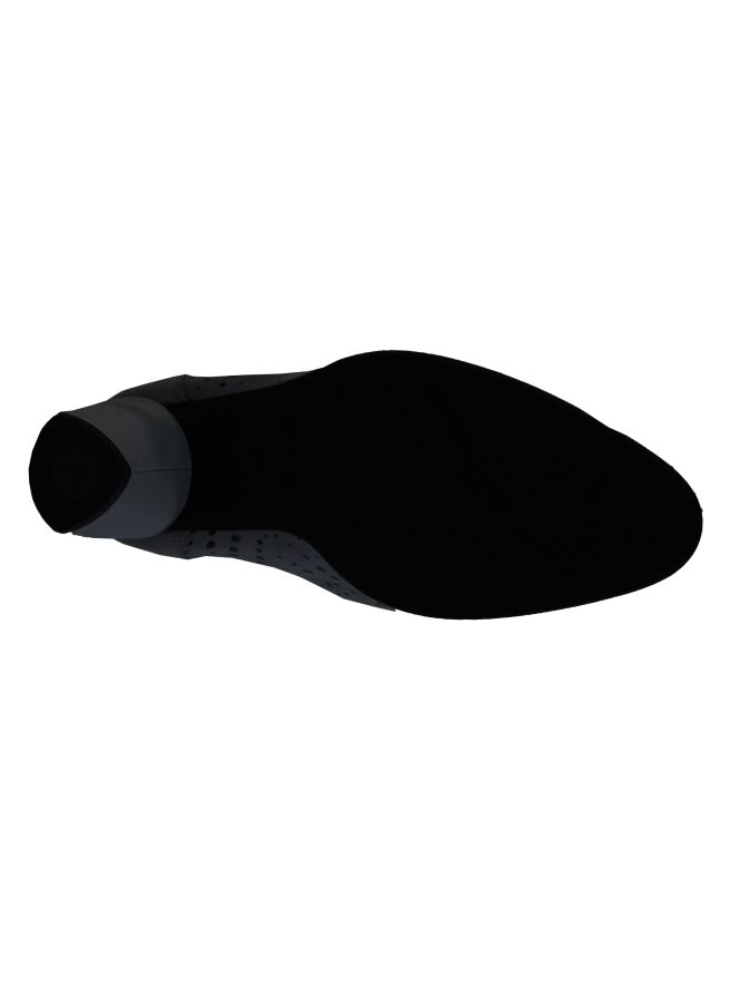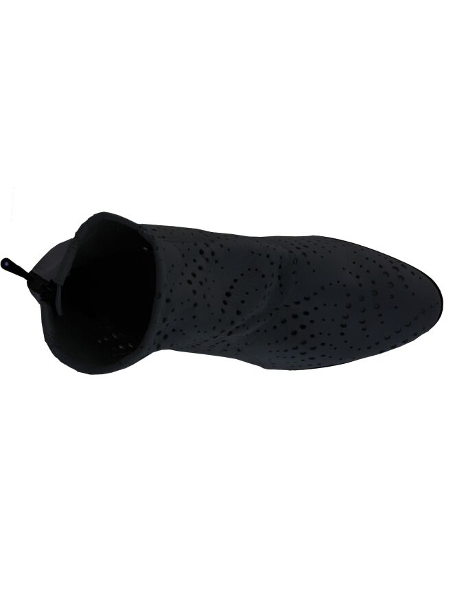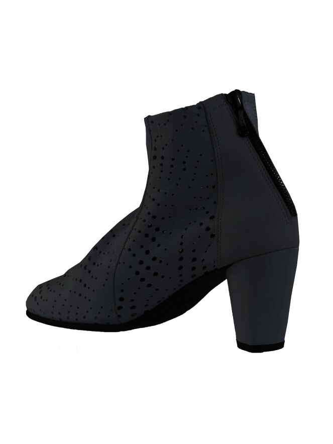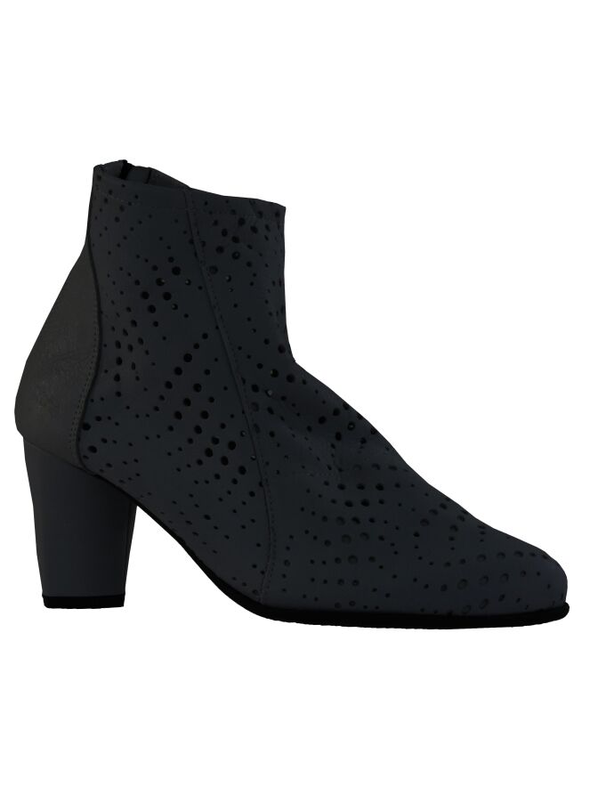 Een kort laarsje van Arche in de kleur antraciet. Het leder is fijn geperforeerd. De hiel is in uni leder met een ritsje in een zwarte kleur. De binnenkant is ongevoerd.