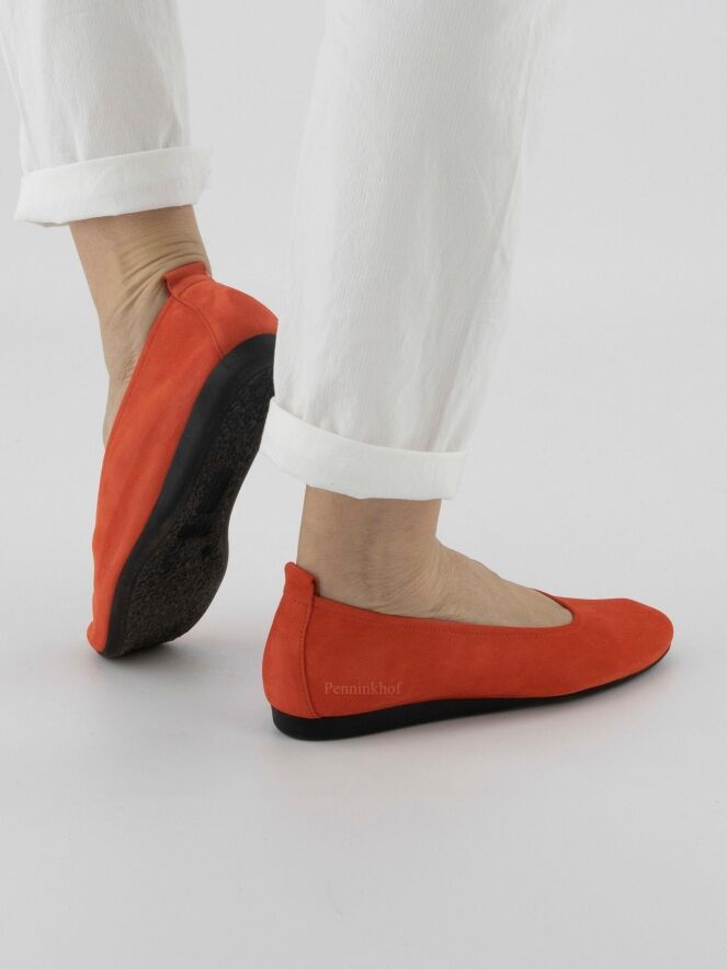 Het model Laius is een basis model van het merk Arche in de kleur oranje. Deze ballerina is van een hoge kwaliteit kalfssuède gemaakt en heeft een latex zool. Het model heeft een uni kleur. Het neusje van de ballerina is mooi rond gesneden. De ballerina is aan de binnenzijde niet gevoerd. Het achterstuk van de zool is licht verhoogd wat bijdraagt aan meer comfort.