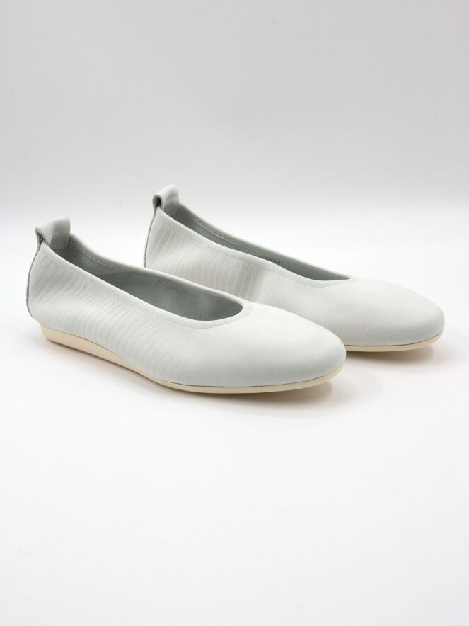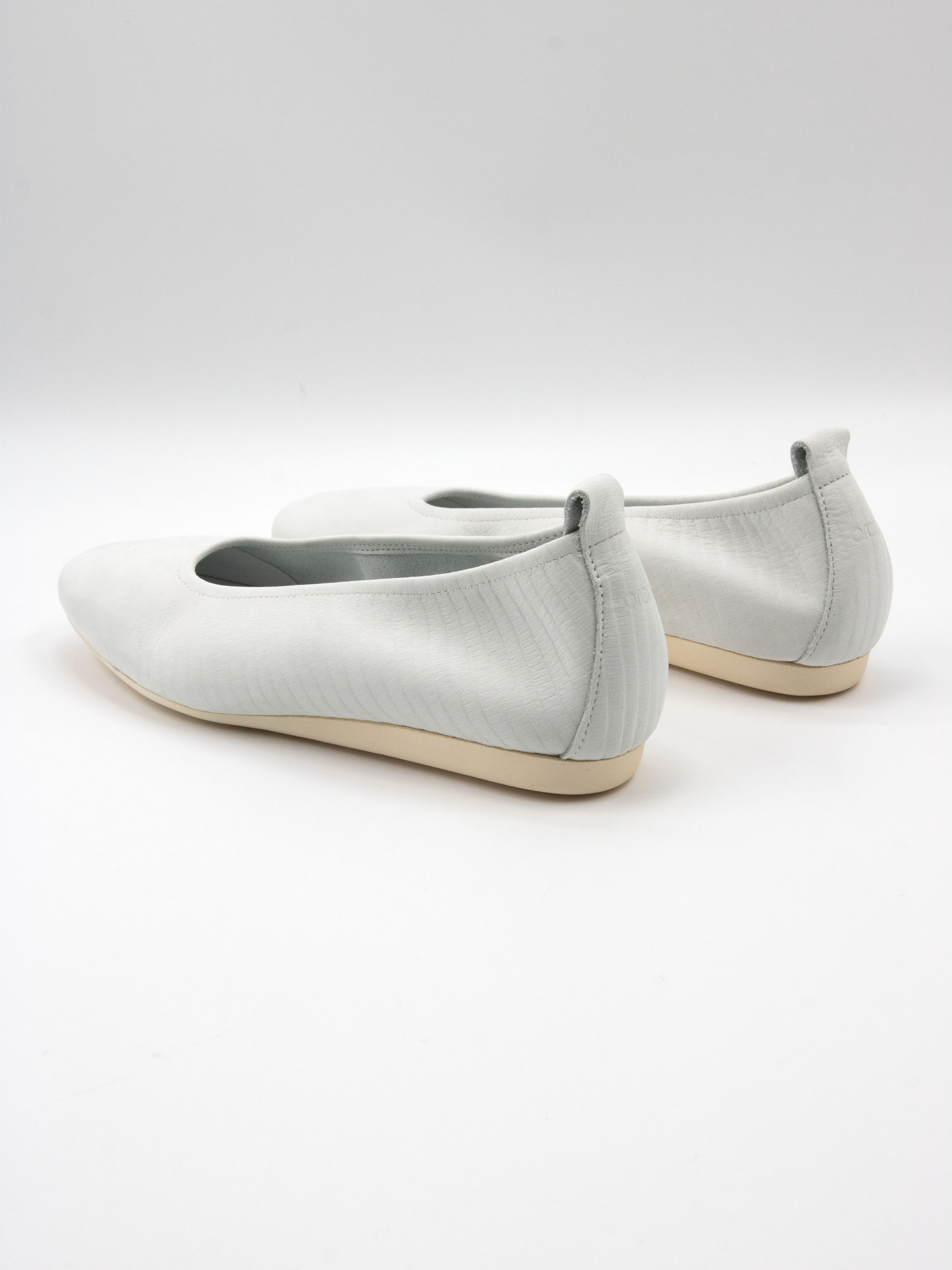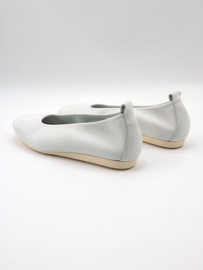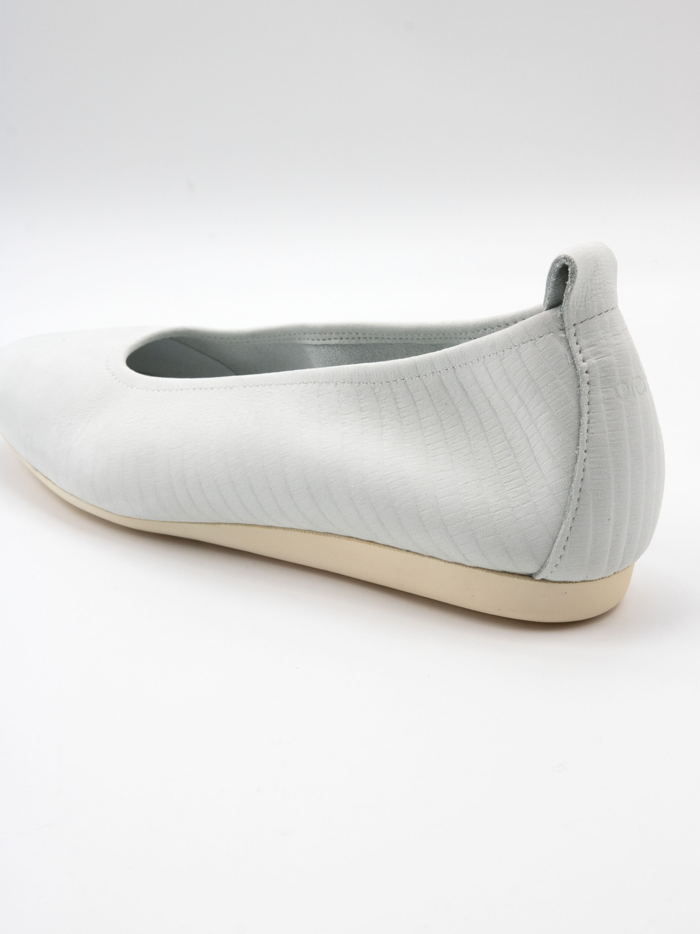 Het model Laius van Arche is een tijdloos basismodel, uitgevoerd in een verfijnde reptielprint in meerdere tinten roomwit. Deze ballerina is vervaardigd van hoogwaardig kalfssuède en voorzien van een flexibele latex zool, wat zorgt voor uitzonderlijk comfort. De neus is elegant rond gesneden en de binnenzijde is ongevoerd voor extra souplesse en een natuurlijke pasvorm. Het achterste deel van de zool is licht verhoogd, wat bijdraagt aan optimaal draagcomfort.