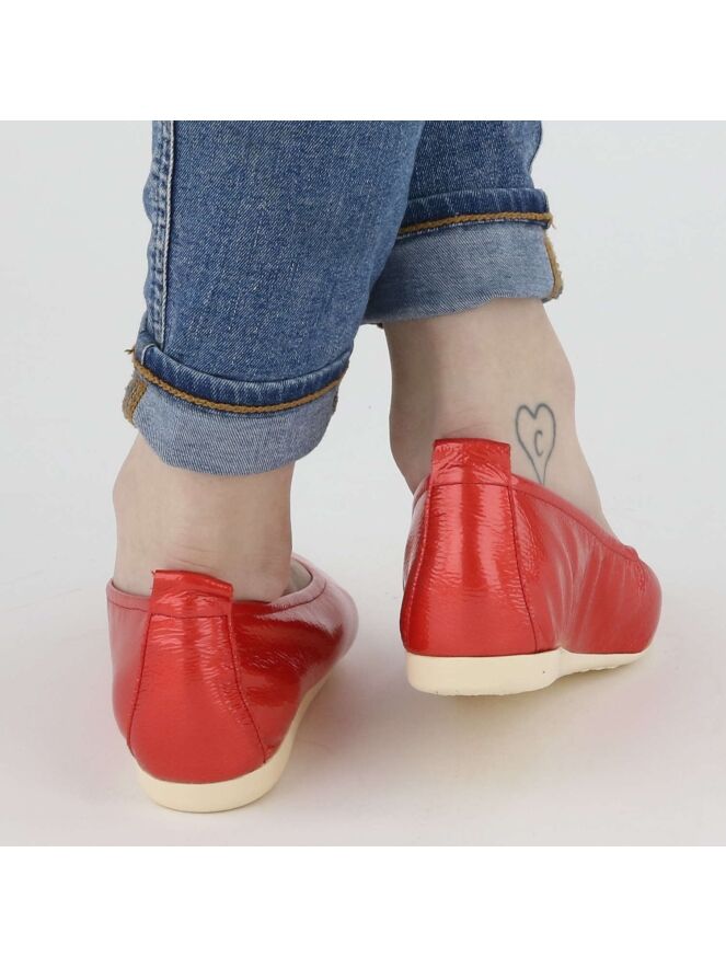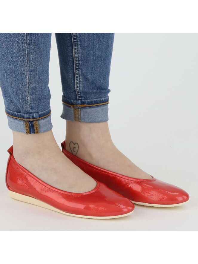 Het model Laius is een basis model van het merk Arche in de kleur rood. Deze ballerina is van een hoge kwaliteit lak leder gemaakt en heeft een witte latex zool. Het model heeft een uni kleur. Het neusje van de ballerina is mooi rond gesneden. De ballerina is aan de binnenzijde niet gevoerd. Het achterstuk van de zool is licht verhoogd wat bijdraagt aan meer comfort.