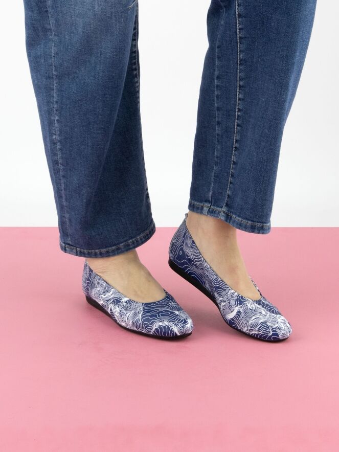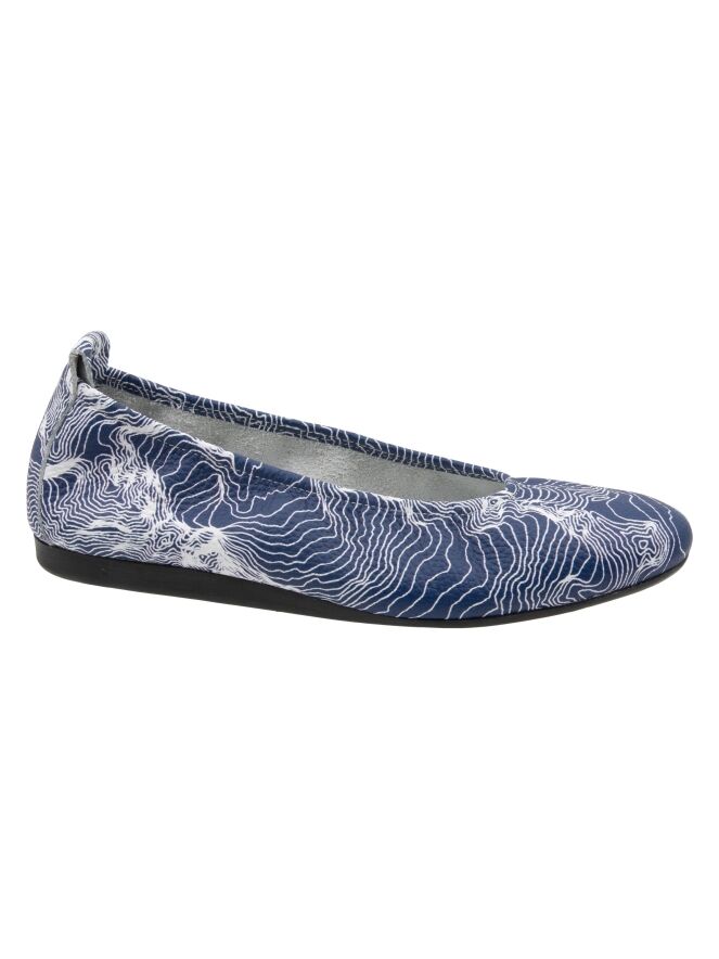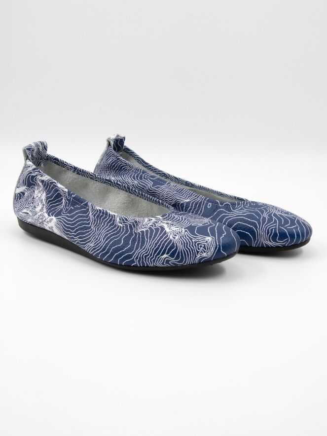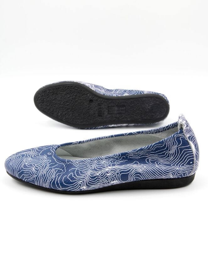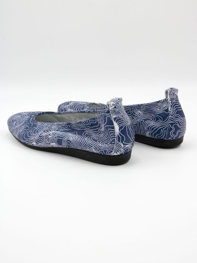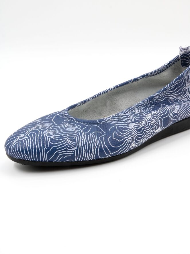Het model Laius is een basismodel van het merk Arche, uitgevoerd in een grafische print met witte lijnen op een blauwe achtergrond. Deze ballerina is vervaardigd van hoogwaardig kalfsleder en heeft een flexibele latex zool. De neus is elegant rond gesneden. De binnenzijde is ongevoerd voor extra souplesse. Het achterstuk van de zool is licht verhoogd, wat bijdraagt aan extra comfort.