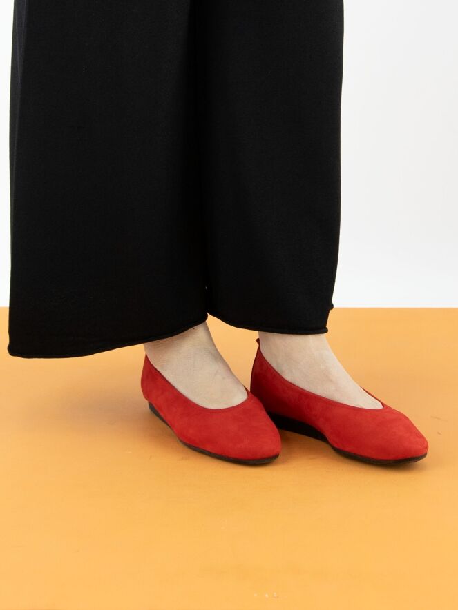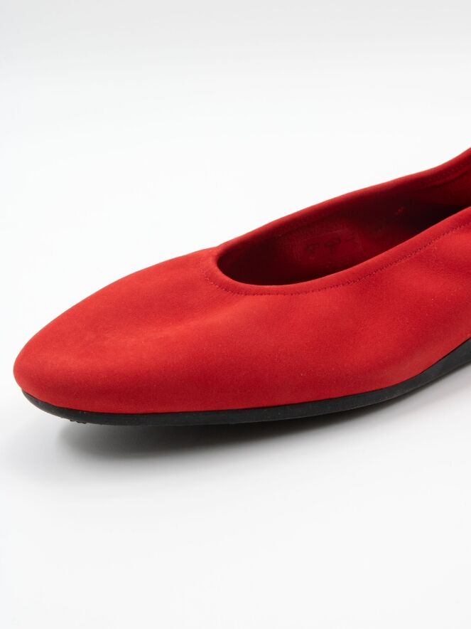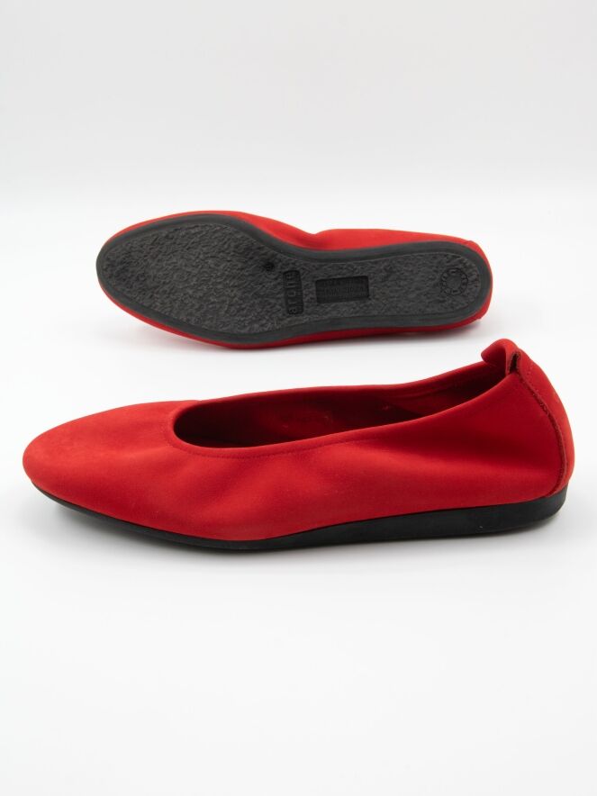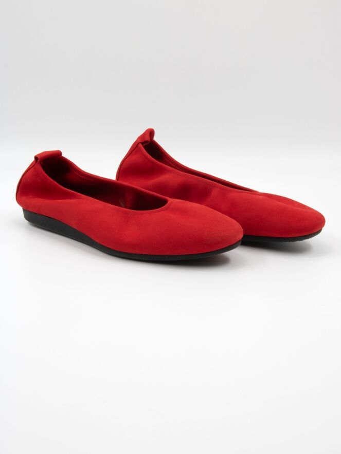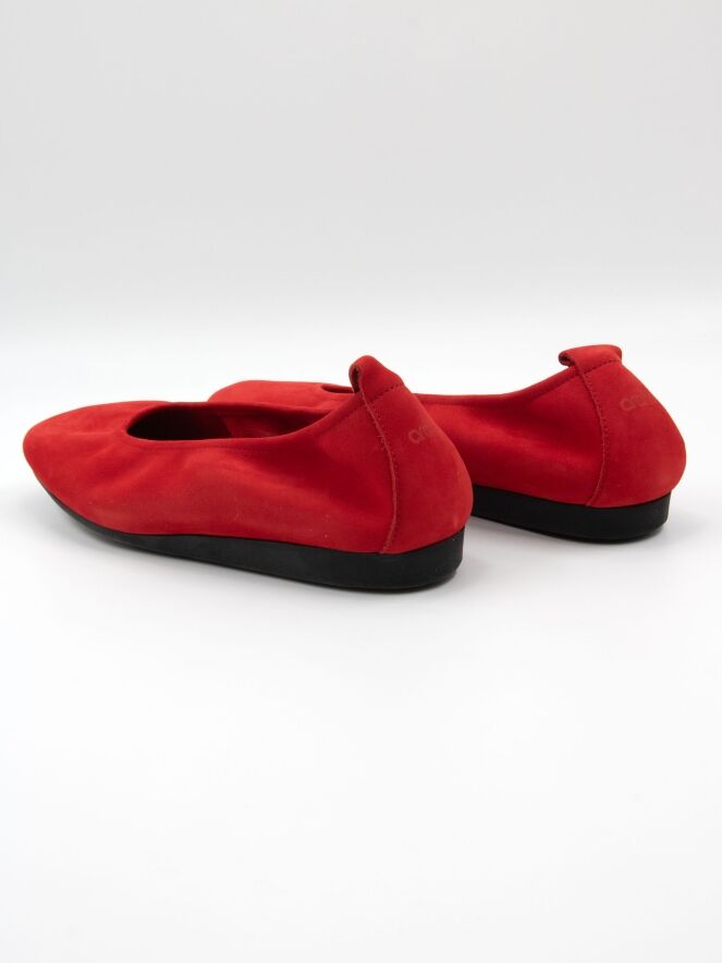 Het model Laius in de kleur rood. Het is een basis model van het merk Arche. Deze ballerina is van een hoge kwaliteit kalfssuède gemaakt en heeft een latex zool. Het model heeft een uni kleur. Het neusje van de ballerina is mooi rond gesneden. De ballerina is aan de binnenzijde niet gevoerd. Het achterstuk van de zool is licht verhoogd wat bijdraagt aan meer comfort.