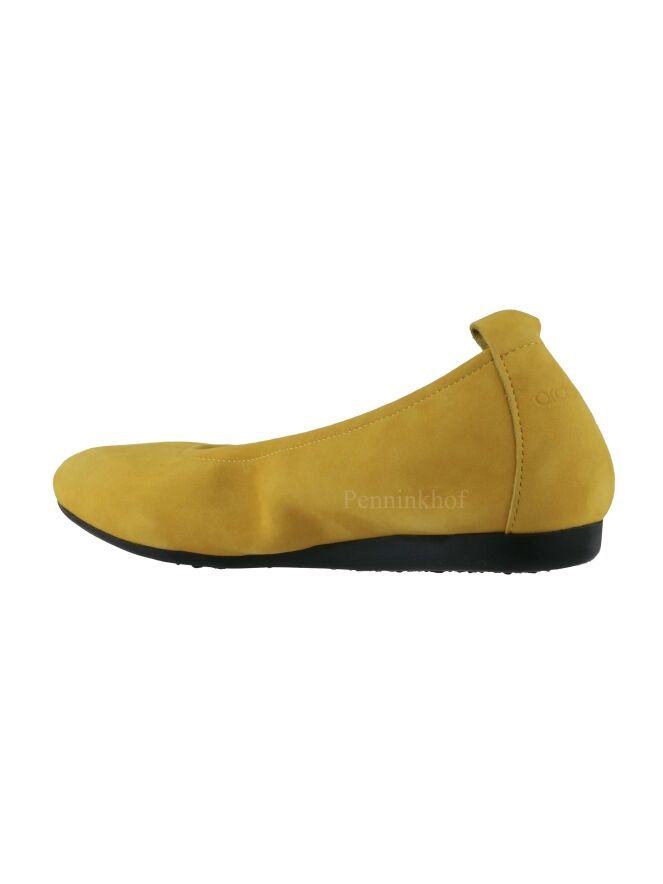 Het model Laius is een basis model van het merk Arche in de kleur geel. Deze ballerina is van een hoge kwaliteit kalfssuède gemaakt en heeft een zwarte latex zool. Het model heeft een uni kleur. Het neusje van de ballerina is mooi rond gesneden. De ballerina is aan de binnenzijde niet gevoerd. Het achterstuk van de zool is licht verhoogd wat bijdraagt aan meer comfort.