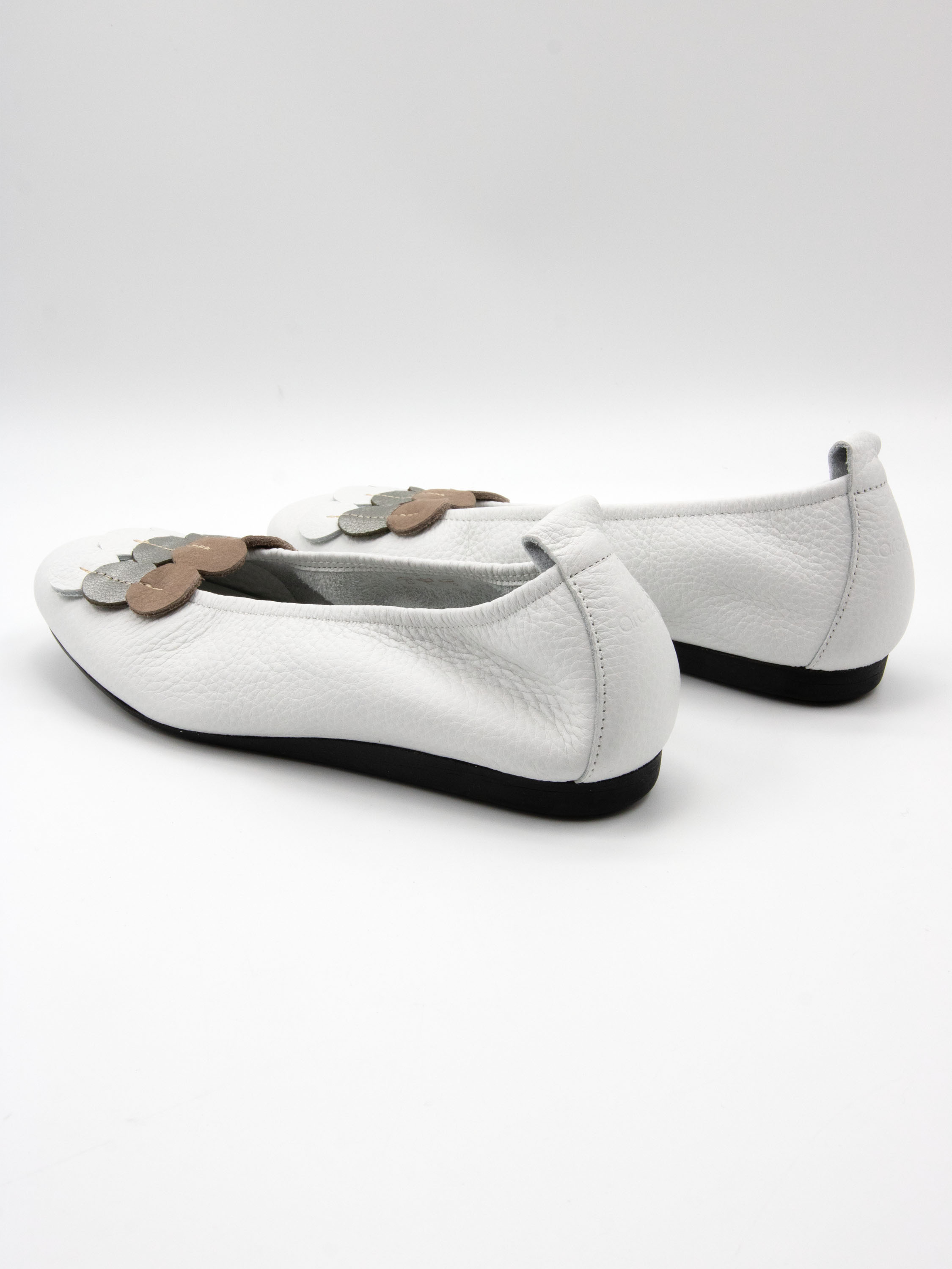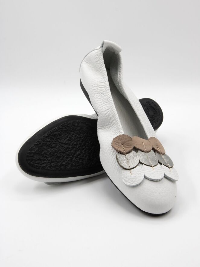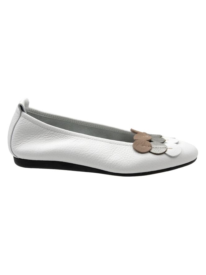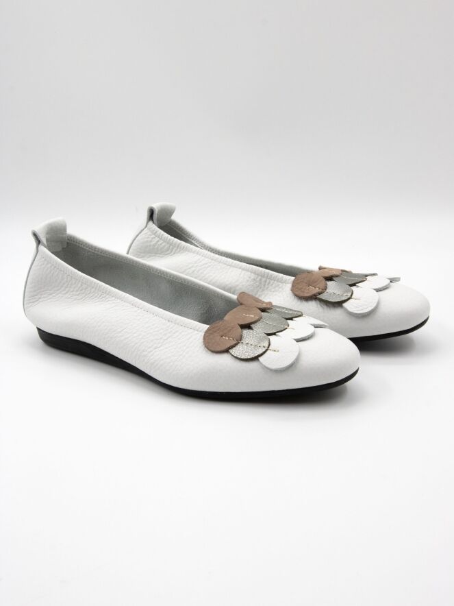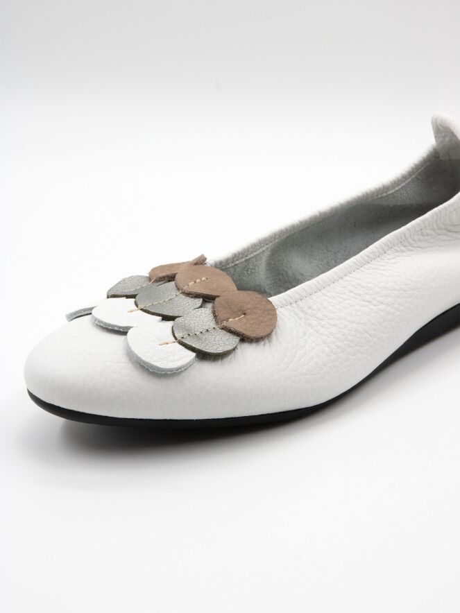 Ballerina van Arche in een hoogwaardige lederen kwaliteit, identiek aan het model Laius, in een elegante roomwitte tint. Op de voorvoet zijn negen decoratieve ronde cirkels (3 x 3) aangebracht in drie verschillende leersoorten in roomwit, taupe en zilver, wat zorgt voor een verfijnd en speels accent. De neus is elegant rond gesneden en geeft het ontwerp een tijdloze uitstraling. De binnenzijde is ongevoerd voor extra souplesse en een natuurlijke pasvorm. Het achterstuk van de zool is licht verhoogd, wat bijdraagt aan extra comfort bij iedere stap.