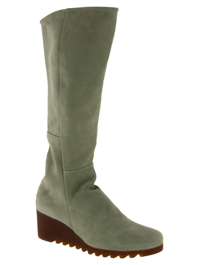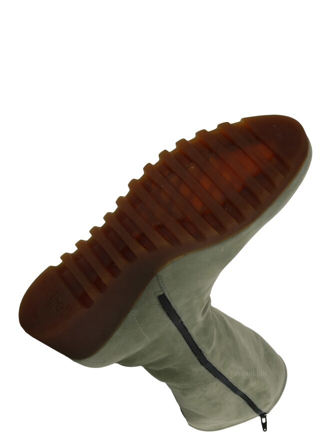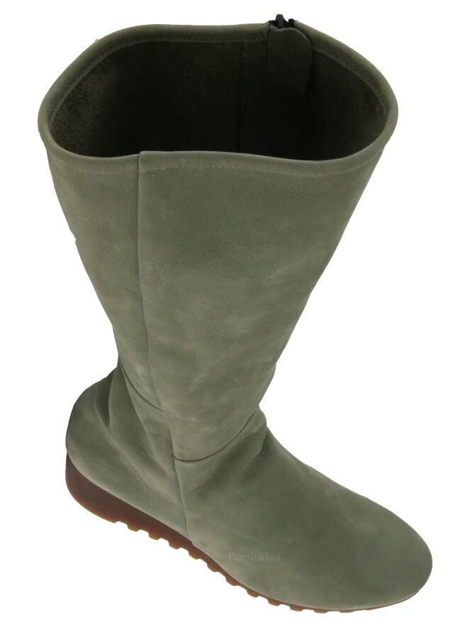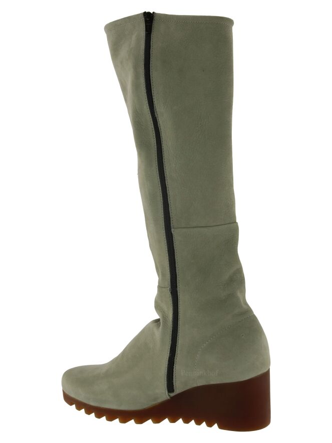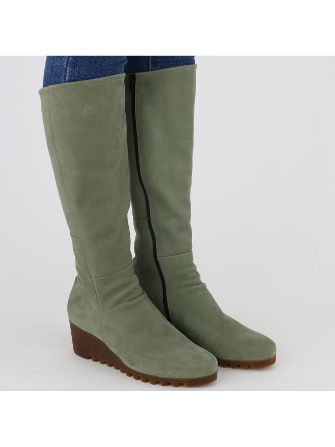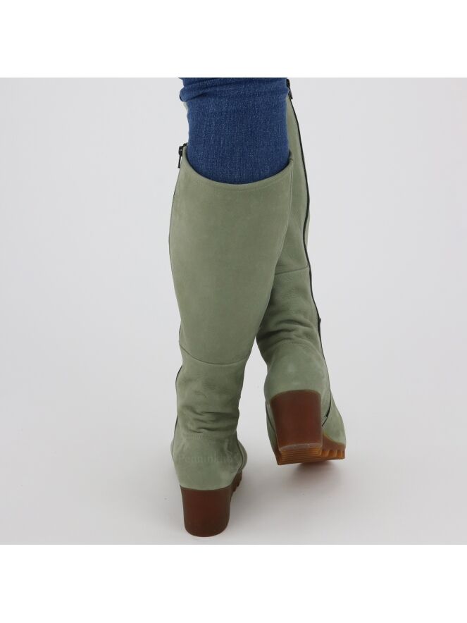 Een hoge laars van Arche in de kleur olijfgroen. De laars heeft een sleehak met een latex zool in een cognac kleur. De rits aan de binnenzijde is in de kleur zwart. De binnenkant is ongevoerd.