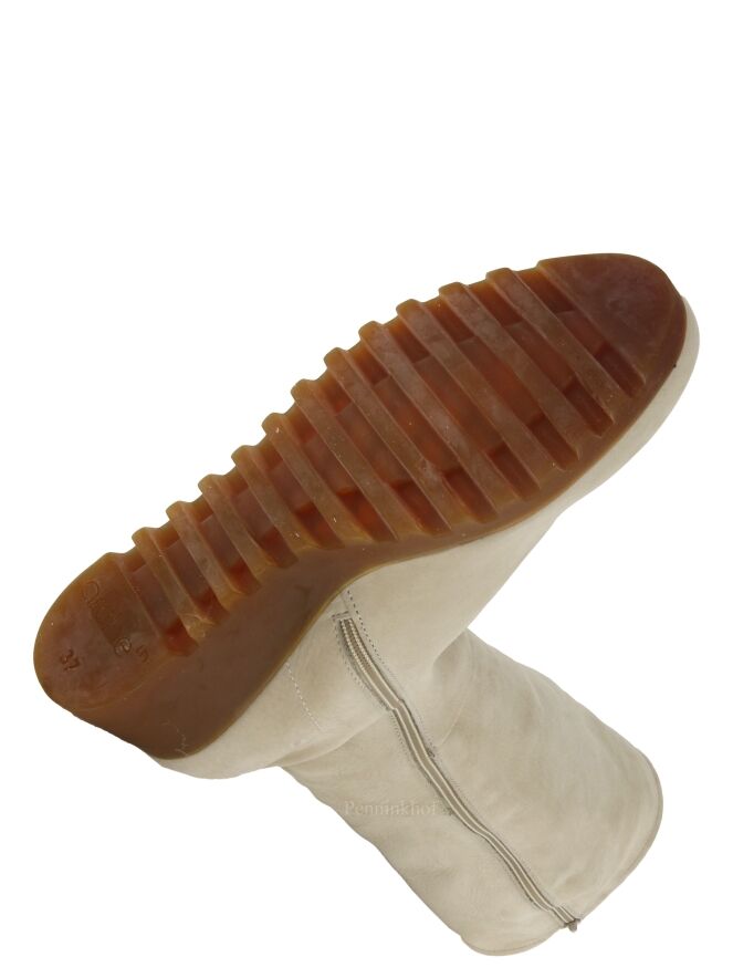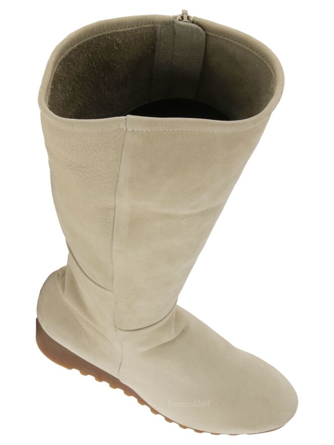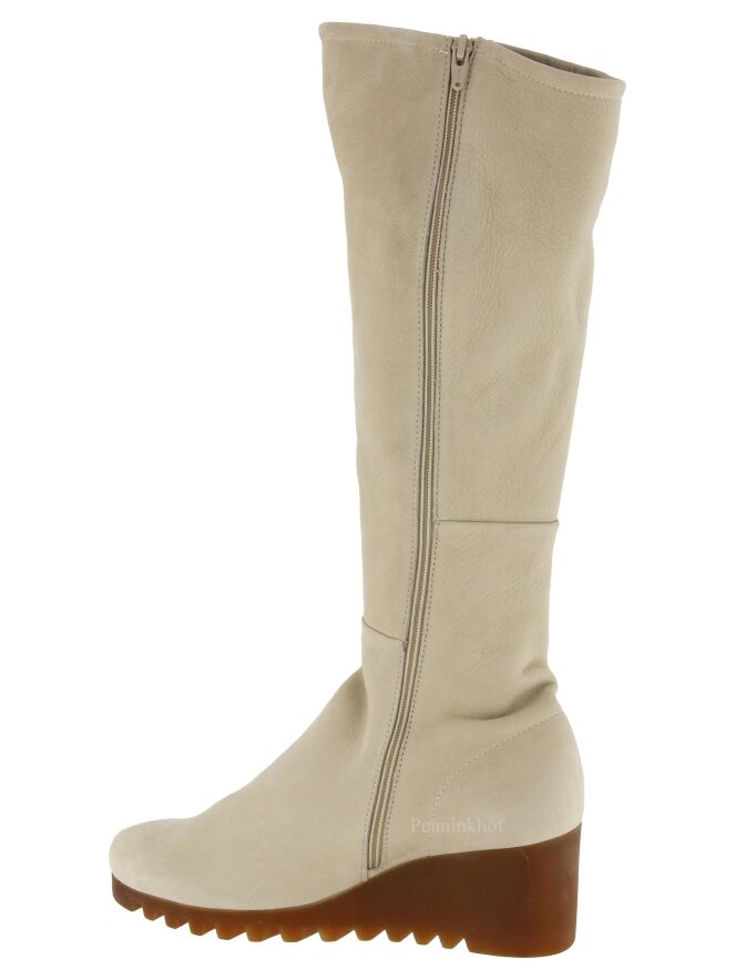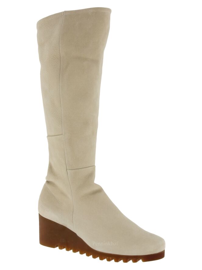 Een hoge laars van Arche in de kleur roomwit. De laars heeft een sleehak met een latex zool in een cognac kleur. De rits aan de binnenzijde is in de kleur zwart. De binnenkant is ongevoerd.