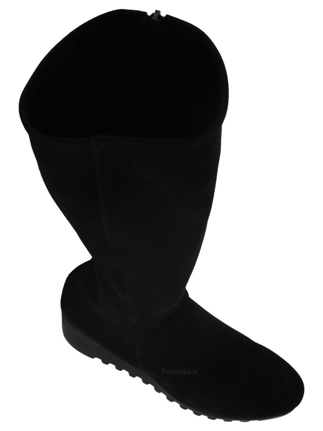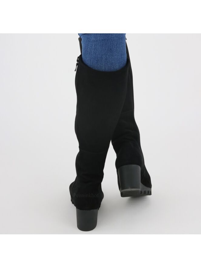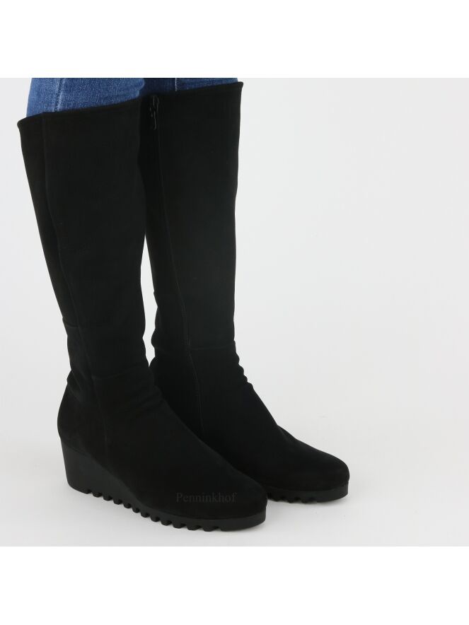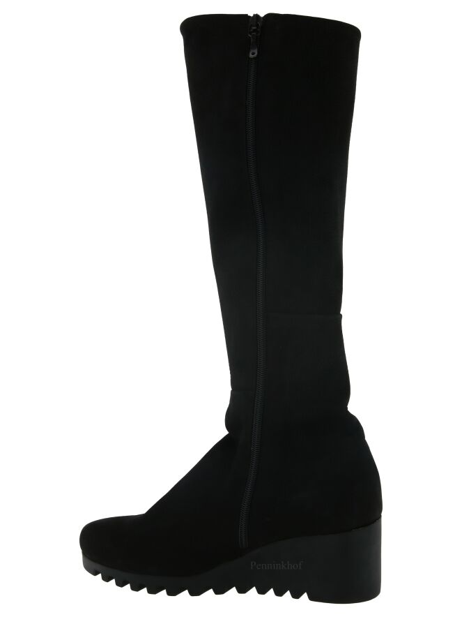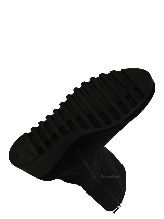 Een hoge laars van Arche in de kleur zwart. De laars heeft een sleehak met een latex zool in een zwarte kleur. De rits aan de binnenzijde is in de kleur zwart. De binnenkant is ongevoerd.