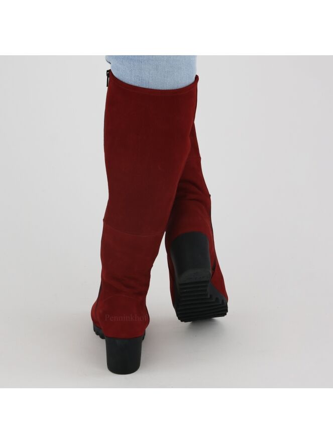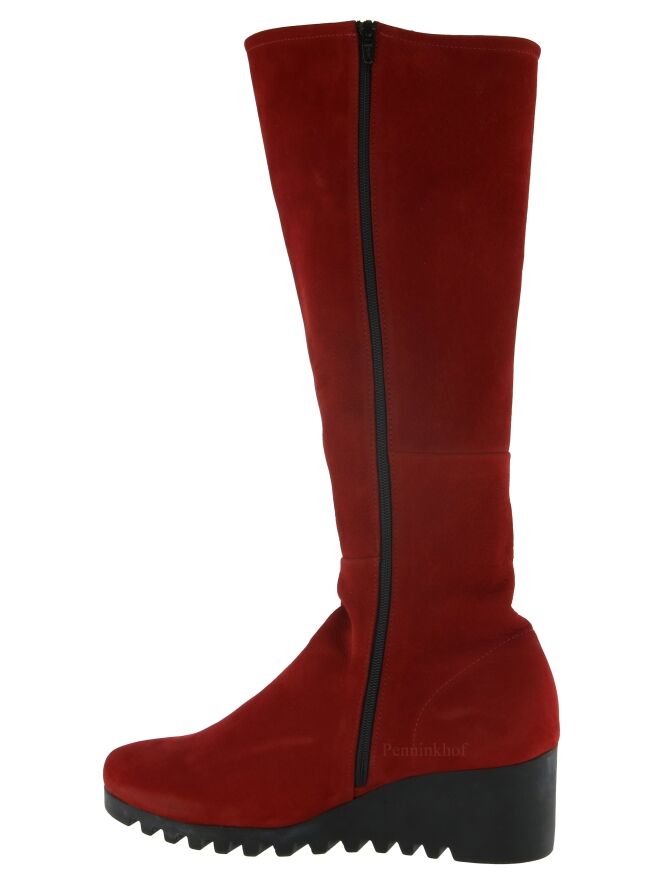 Een hoge laars van Arche in de kleur rood. De laars heeft een sleehak met een latex zool in een zwarte kleur. De rits aan de binnenzijde is in de kleur zwart. De binnenkant is ongevoerd.