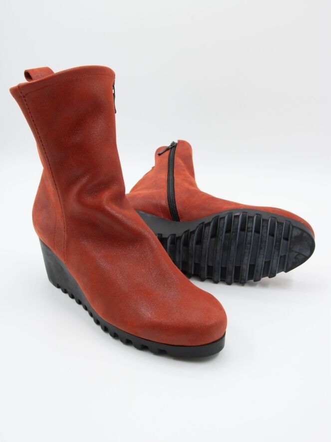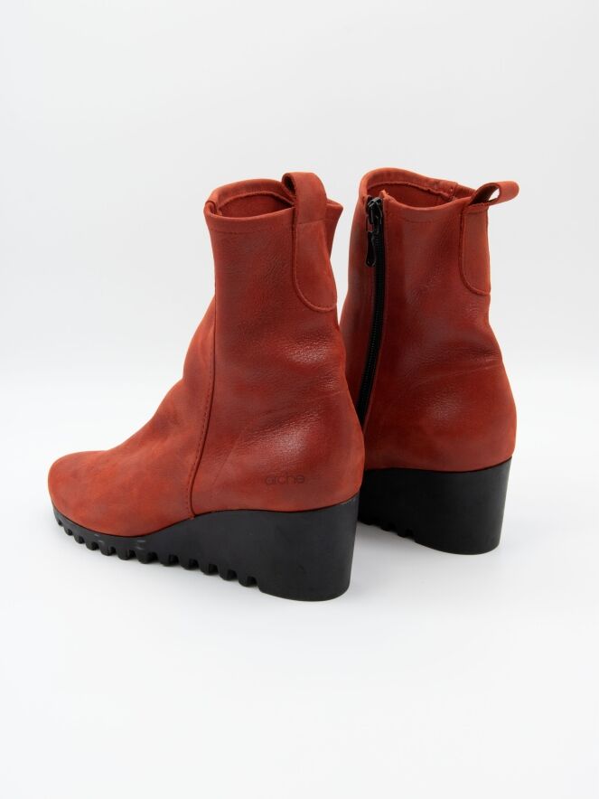 Een enkellaarsje op een sleehak van het merk Arche in een gevlamde cognac kleur. Het laarsje is ongevoerd. De zool is sportief gekarteld.
