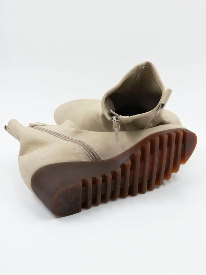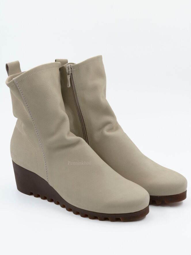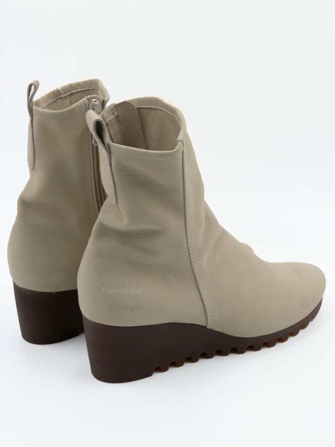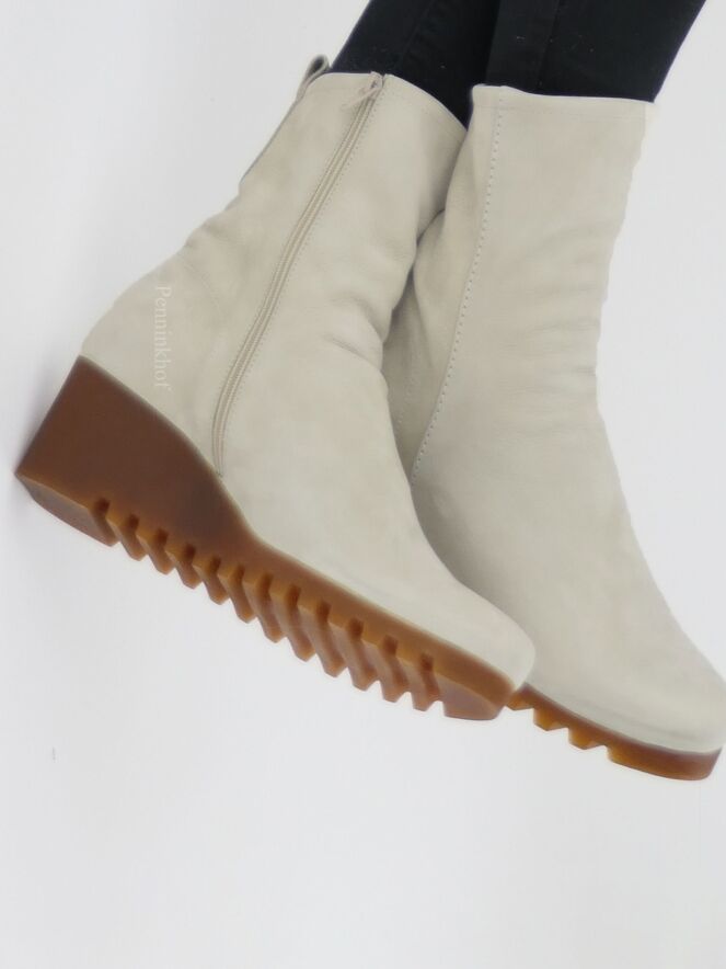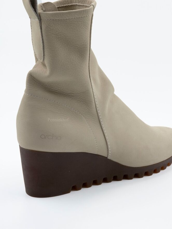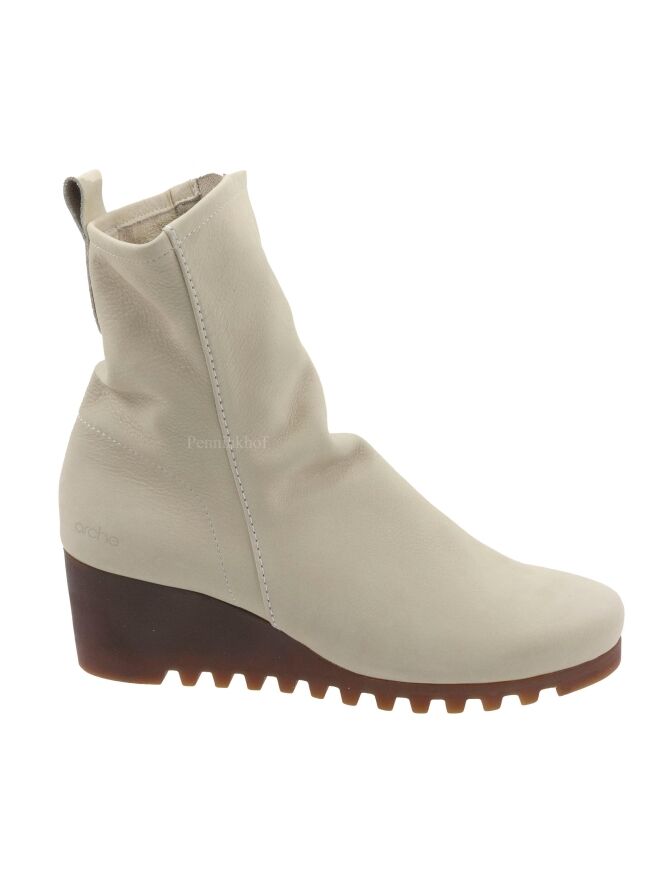 Een enkellaarsje op een sleehak van het merk Arche in een zeer zacht suède in een roomwitte kleur. Het laarsje is ongevoerd. De zool is sportief gekarteld.