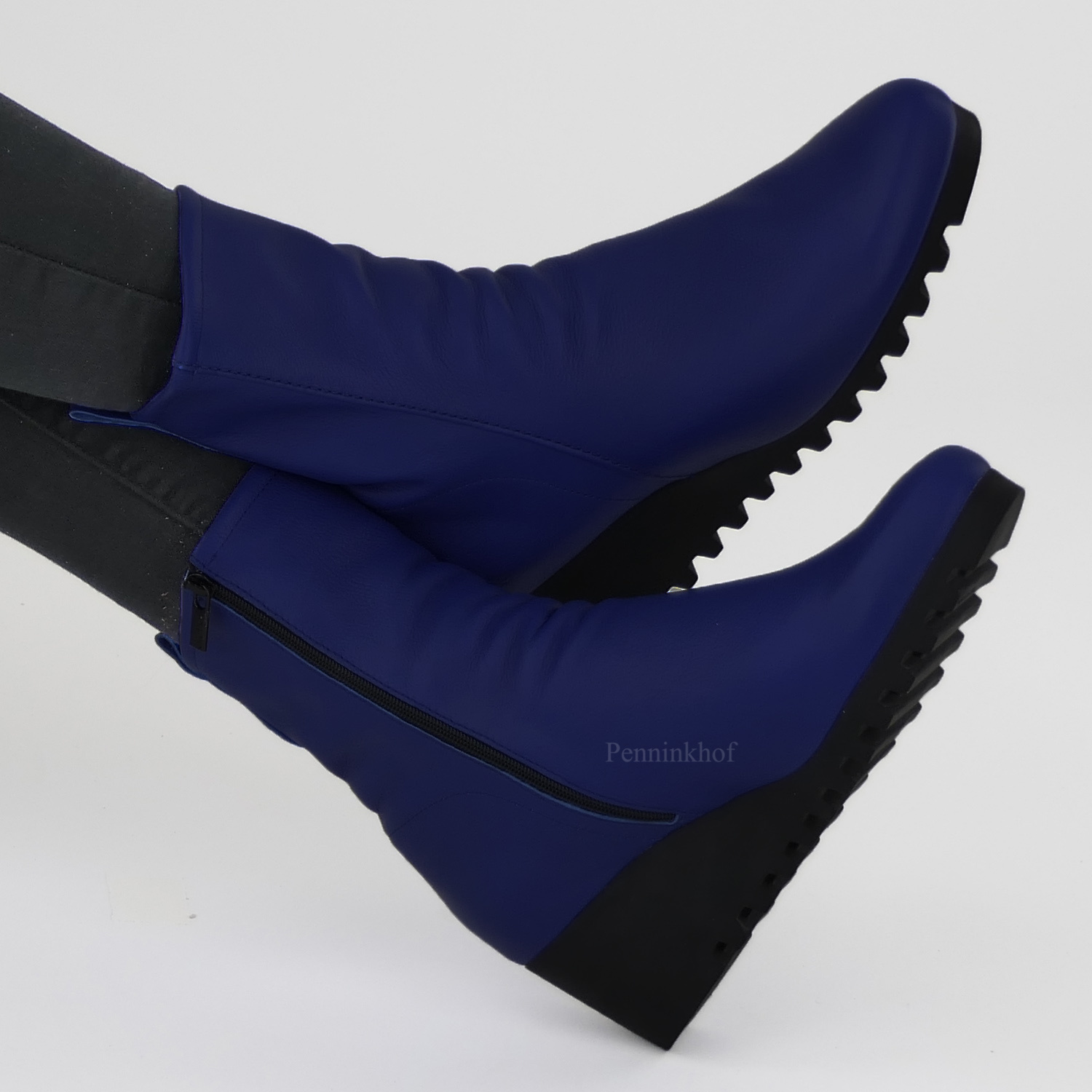 Een enkellaarsje op een sleehak van het merk Arche in een zeer zacht leder in een kobaltblauwe kleur. Het laarsje is ongevoerd. De zool is sportief gekarteld.