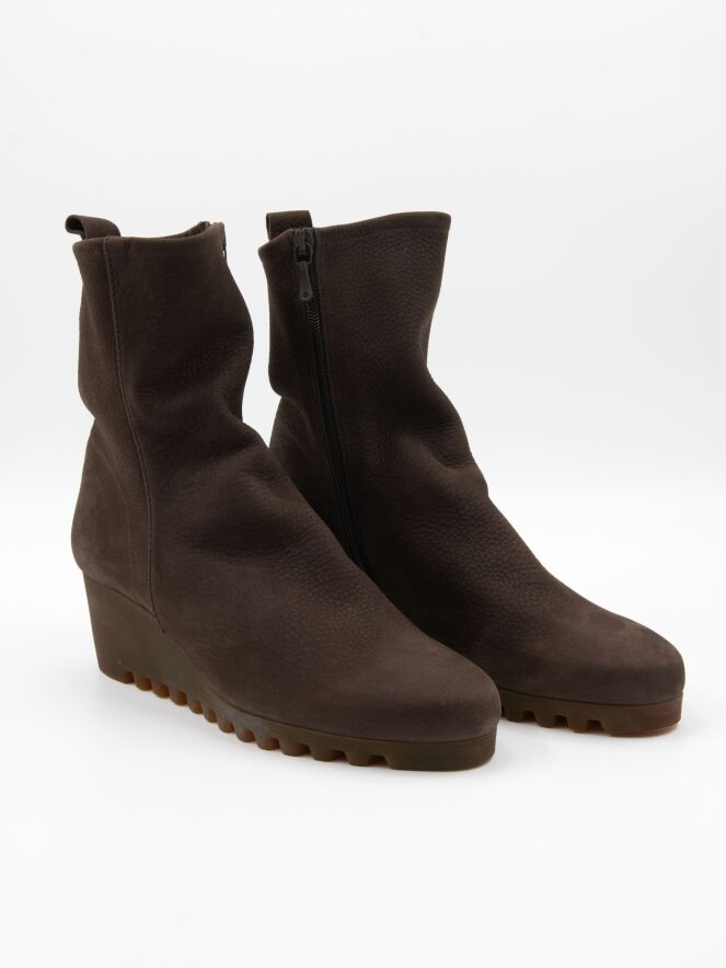 Een enkellaarsje op een sleehak van het merk Arche in een zeer zacht leder in een mokka bruine kleur. Het laarsje is ongevoerd. De zool is in een bruine kleur en is sportief gekarteld.