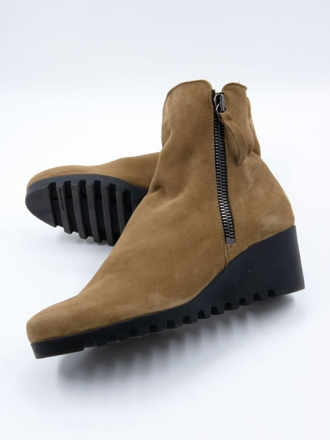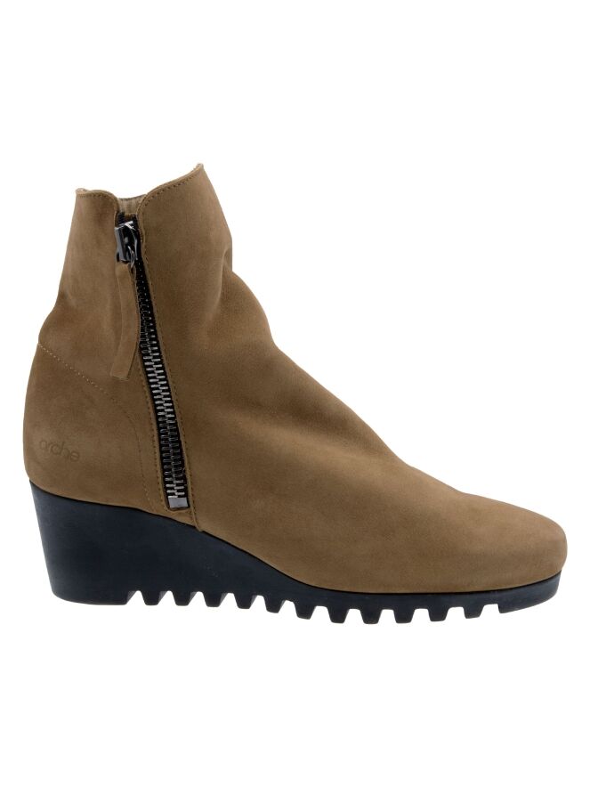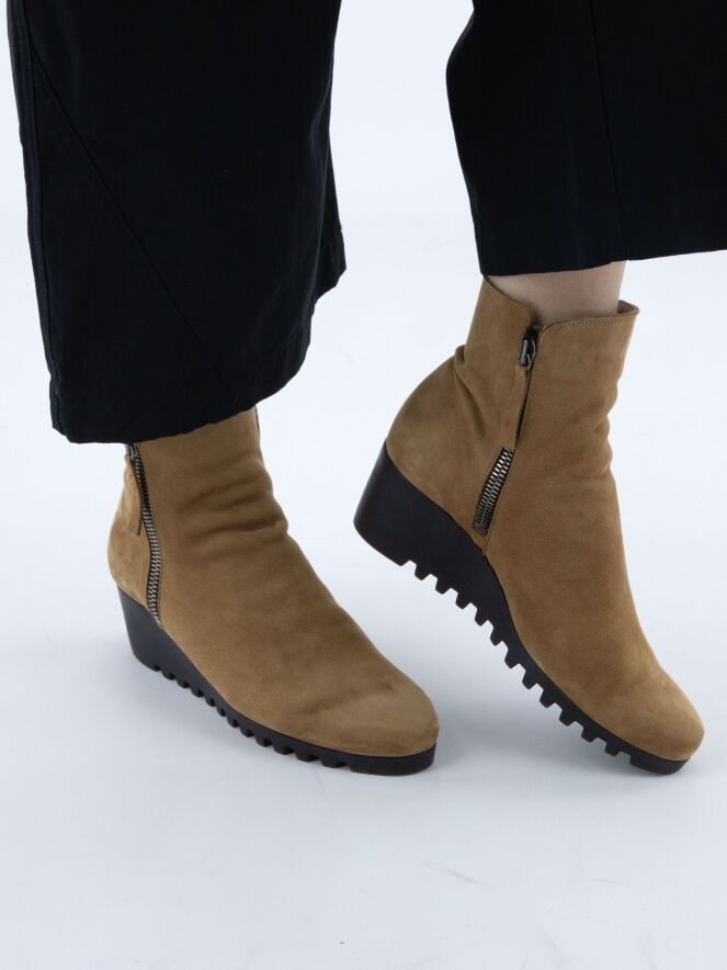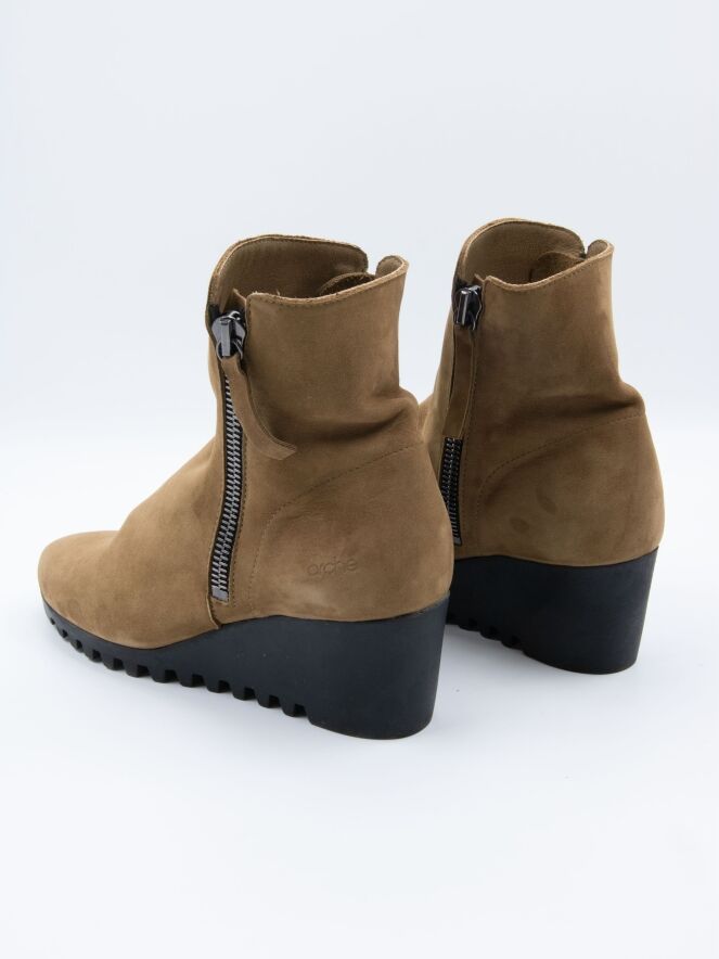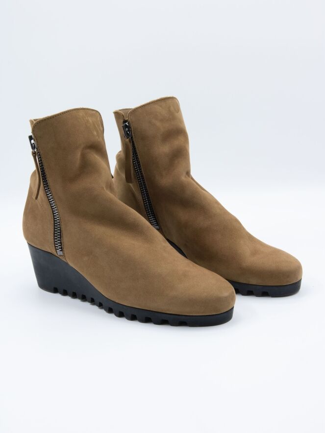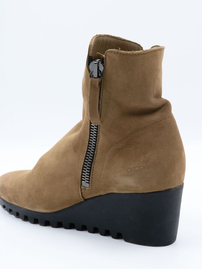 Een enkellaarsje van Arche in de kleur camel. Aan beide zijden van de schacht zit een rits. De latexzool heeft een fijn geblokt profiel. De binnenkant van het laarsje is ongevoerd.