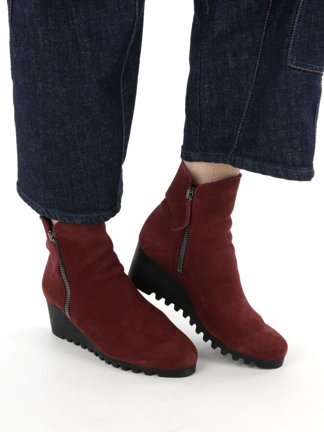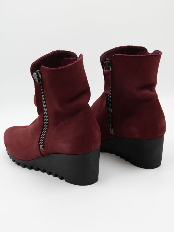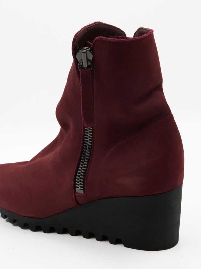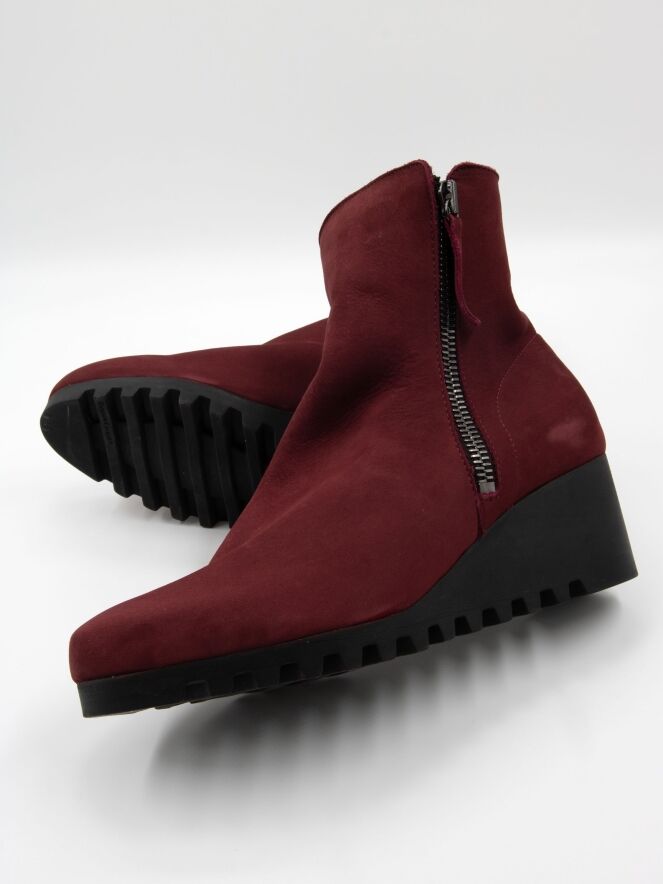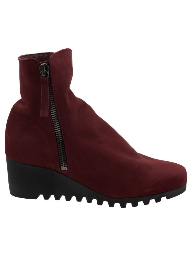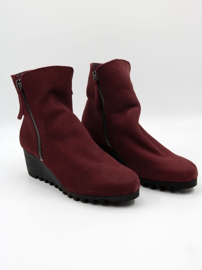 Een enkellaarsje van Arche in de kleur bordeauxrood. Langs beide zijden van de schacht zit een rits. De latexzool heeft een fijn geblokt kartelpatroon. De binnenkant van het laarsje is ongevoerd.