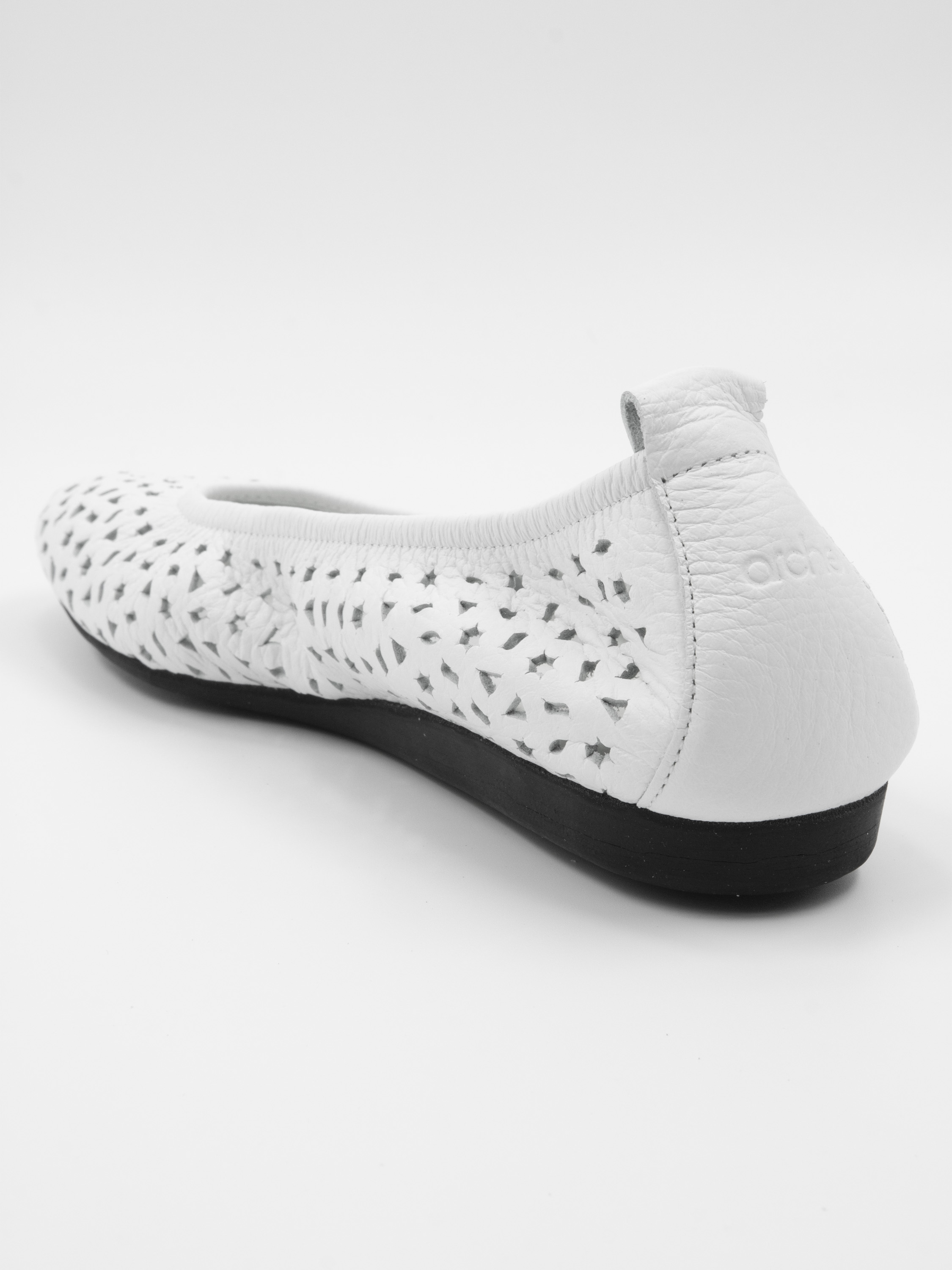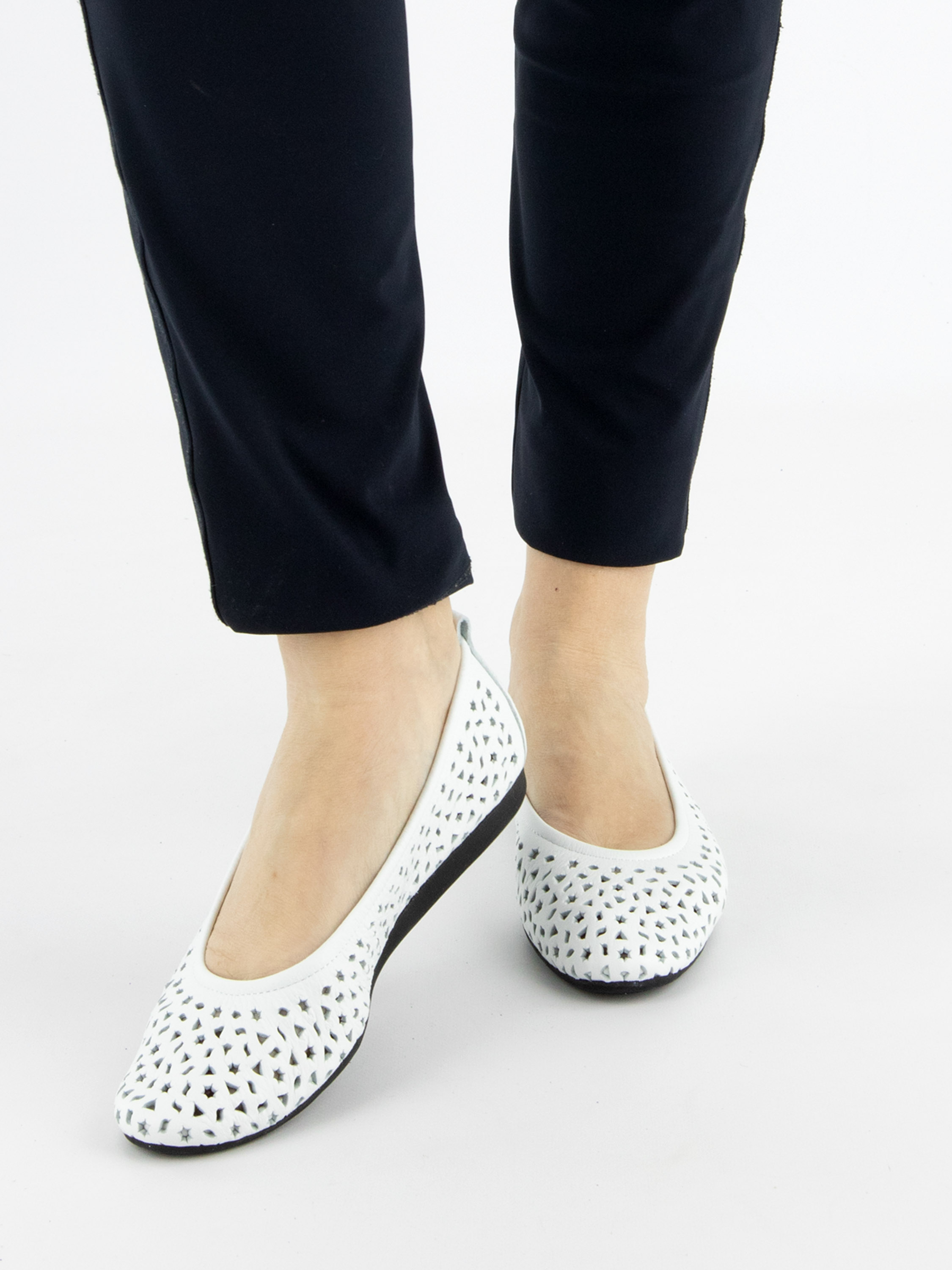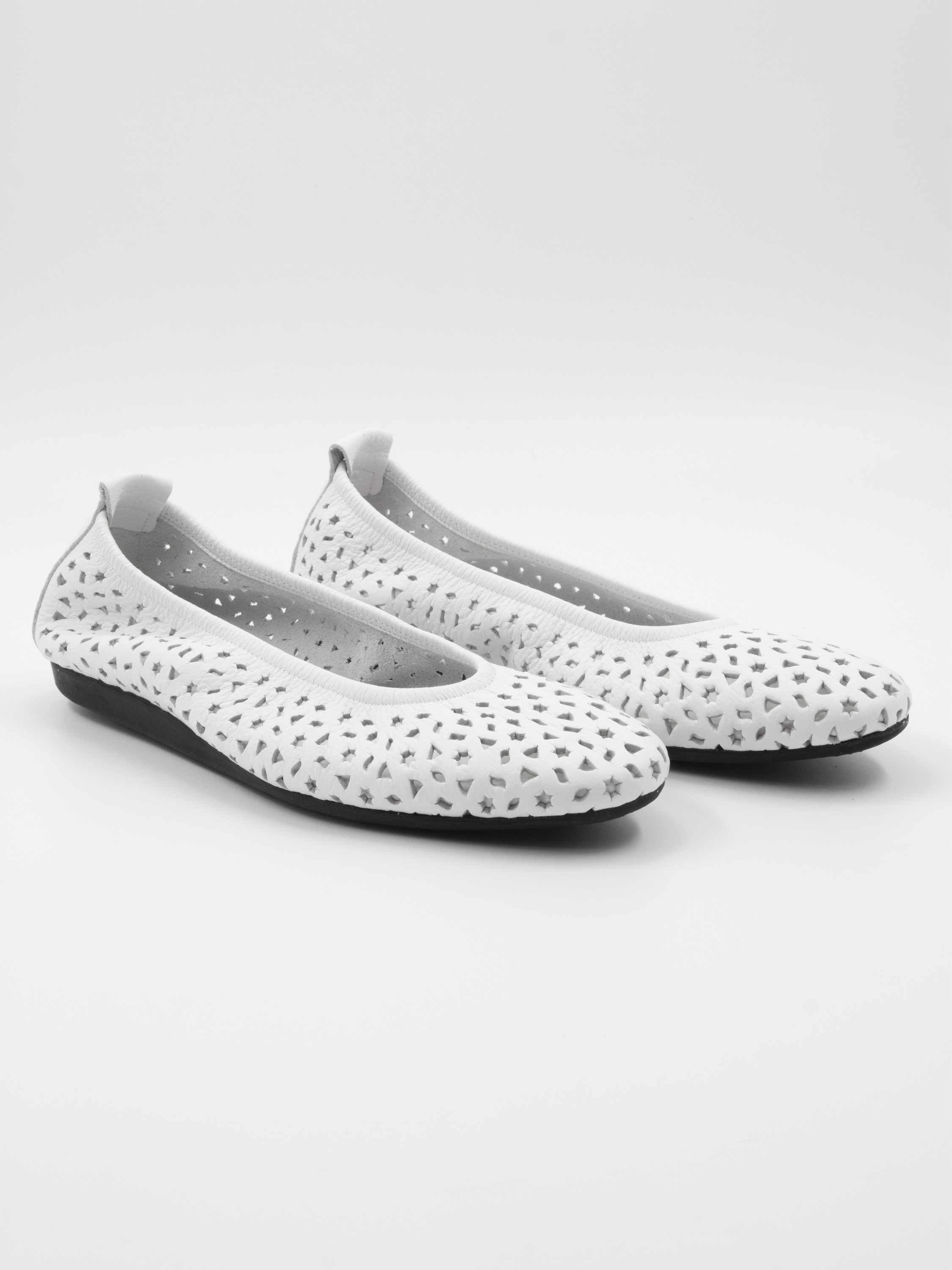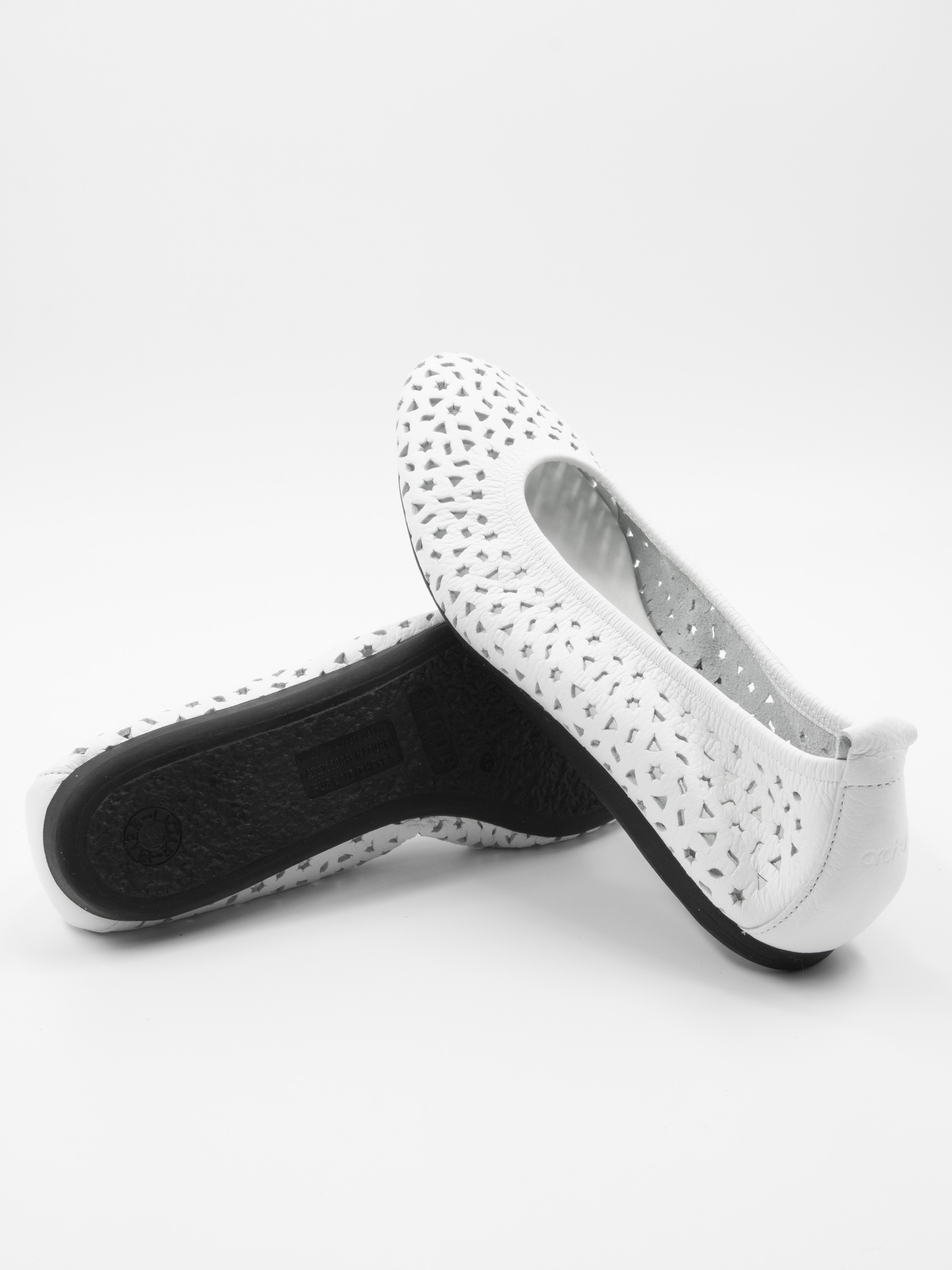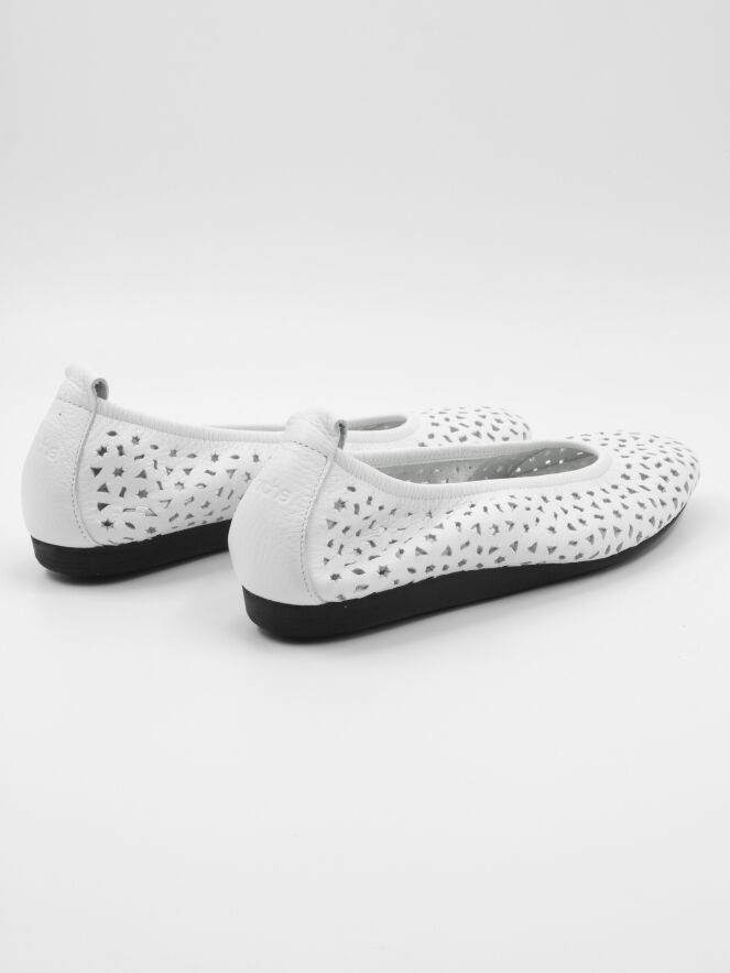 Een ballerina van Arche in de kleur wit. Het leder is geperforeerd in meerdere figuurtjes waaronder sterretjes en driehoekjes. De ballerina heeft een ronde neus en is ongevoerd.