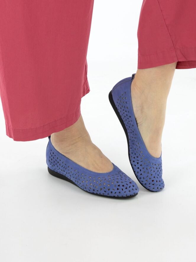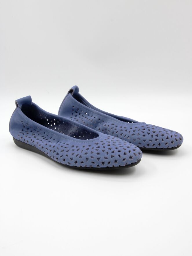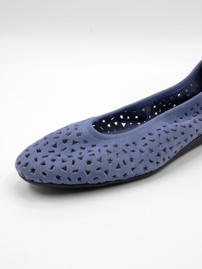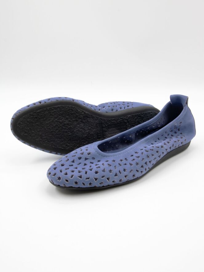 Ballerina van Arche in een zachte lavendeltint. Het nubucksuède is geperforeerd met diverse figuurtjes, waaronder sterretjes en driehoekjes, wat zorgt voor een speels en verfijnd effect. De ballerina heeft een ronde neus en is ongevoerd voor extra souplesse en een natuurlijk draaggevoel. De flexibele latex zool biedt optimale demping, terwijl het licht verhoogde achterstuk bijdraagt aan extra comfort.