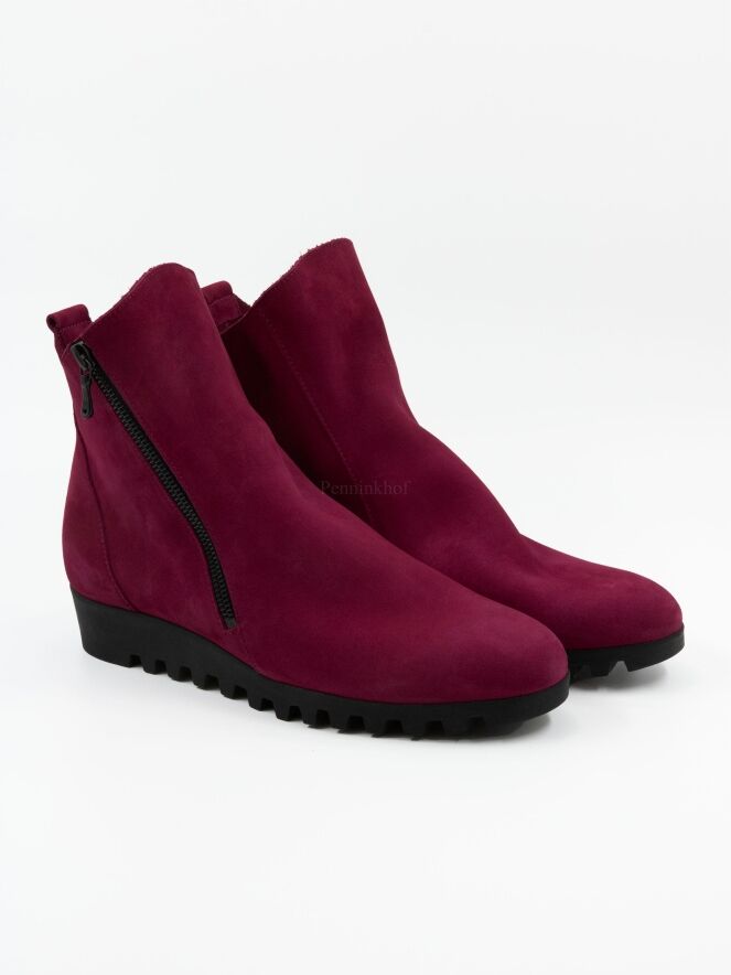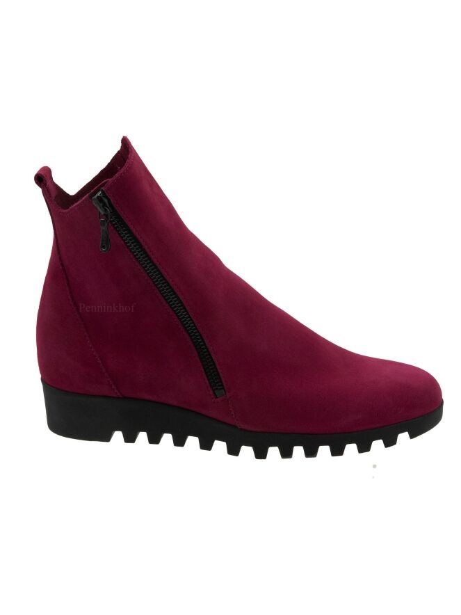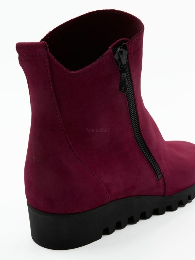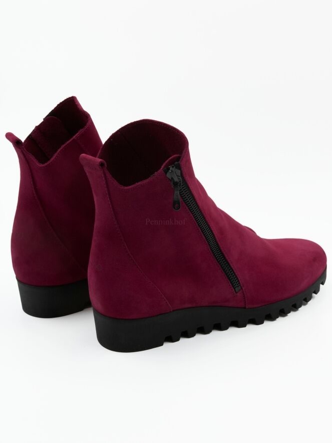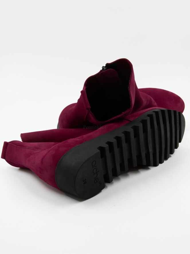 Een kort laarsje van Arche in de kleur framboos of kersenrood. Aan de buitenzijde is een rits. De zool is gekarteld. Het laarsje heeft een ronde neus en de binnenkant is ongevoerd.