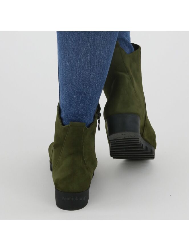 Een kort laarsje van Arche in de kleur groen. Aan de buitenzijde is een zwarte rits. De zool is gekarteld. Het laarsje heeft een ronde neus en de binnenkant is ongevoerd.