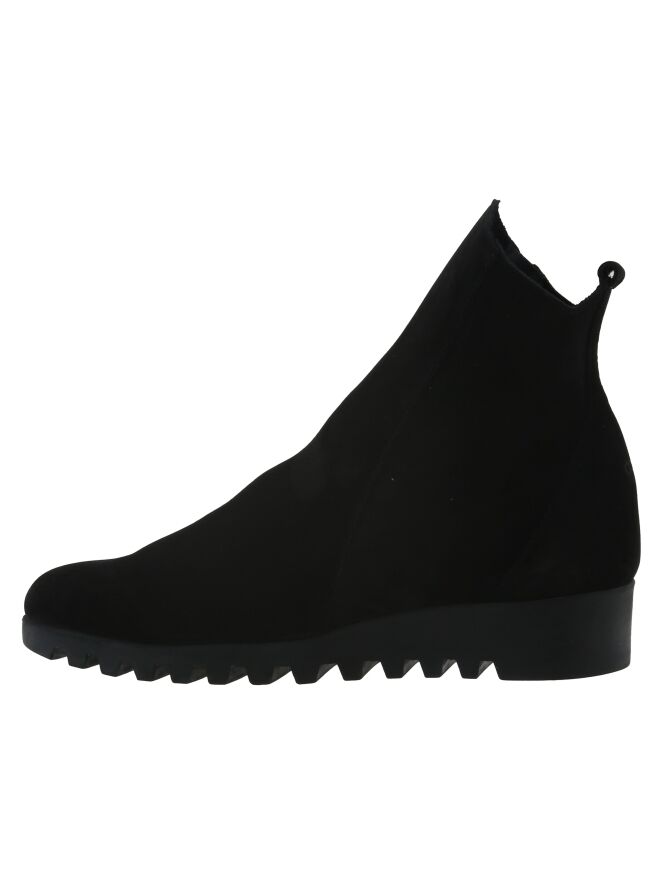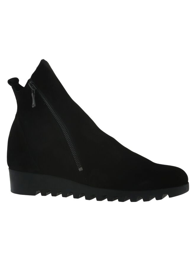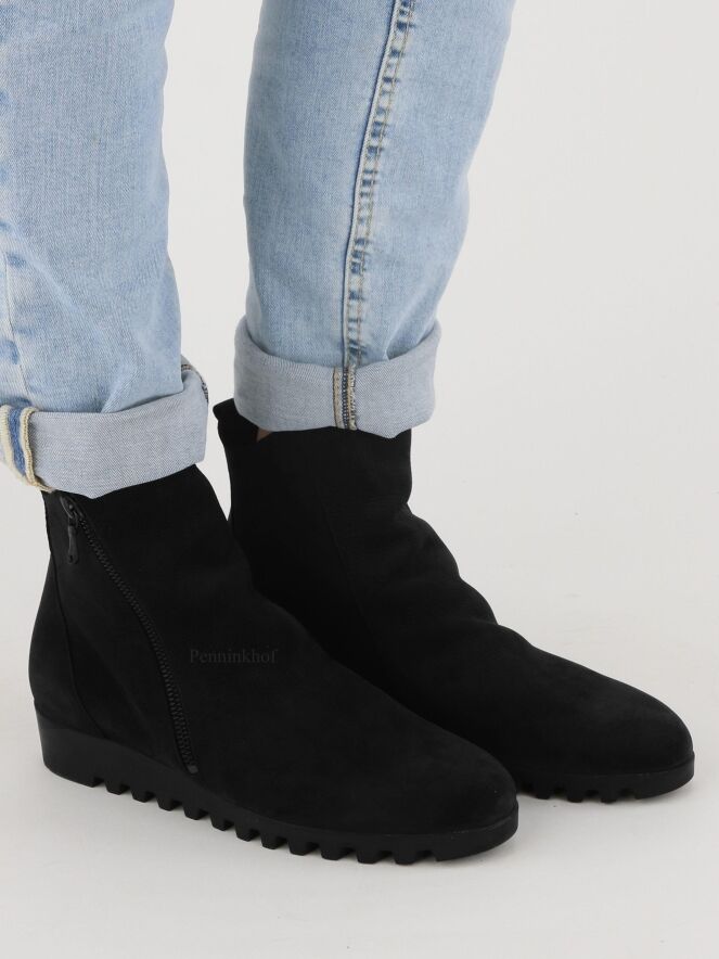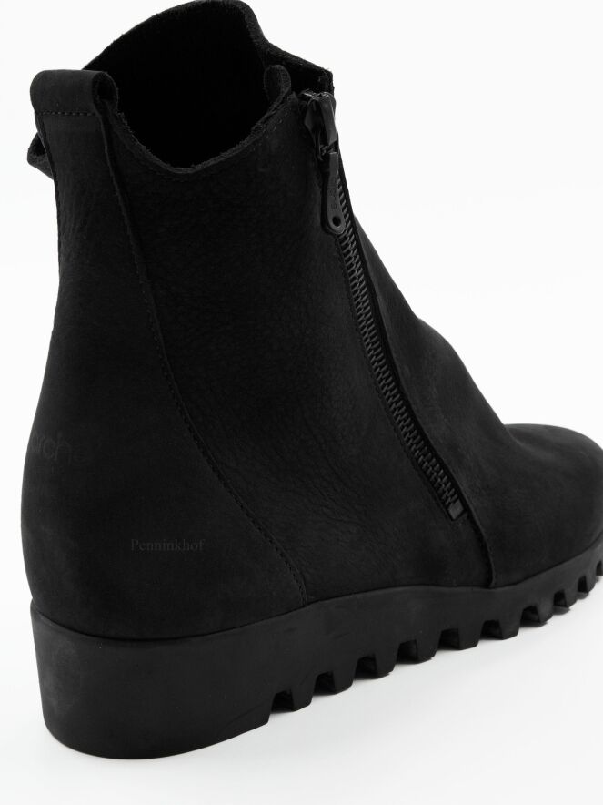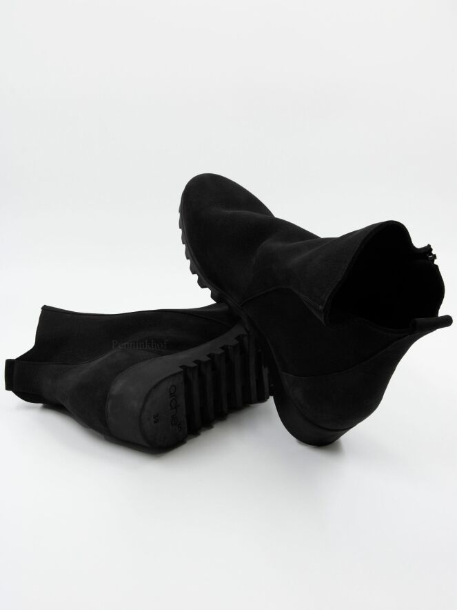 Een kort laarsje van Arche in de kleur zwart. Aan de buitenzijde is een rits. De zool is gekarteld. Het laarsje heeft een ronde neus en de binnenkant is ongevoerd.