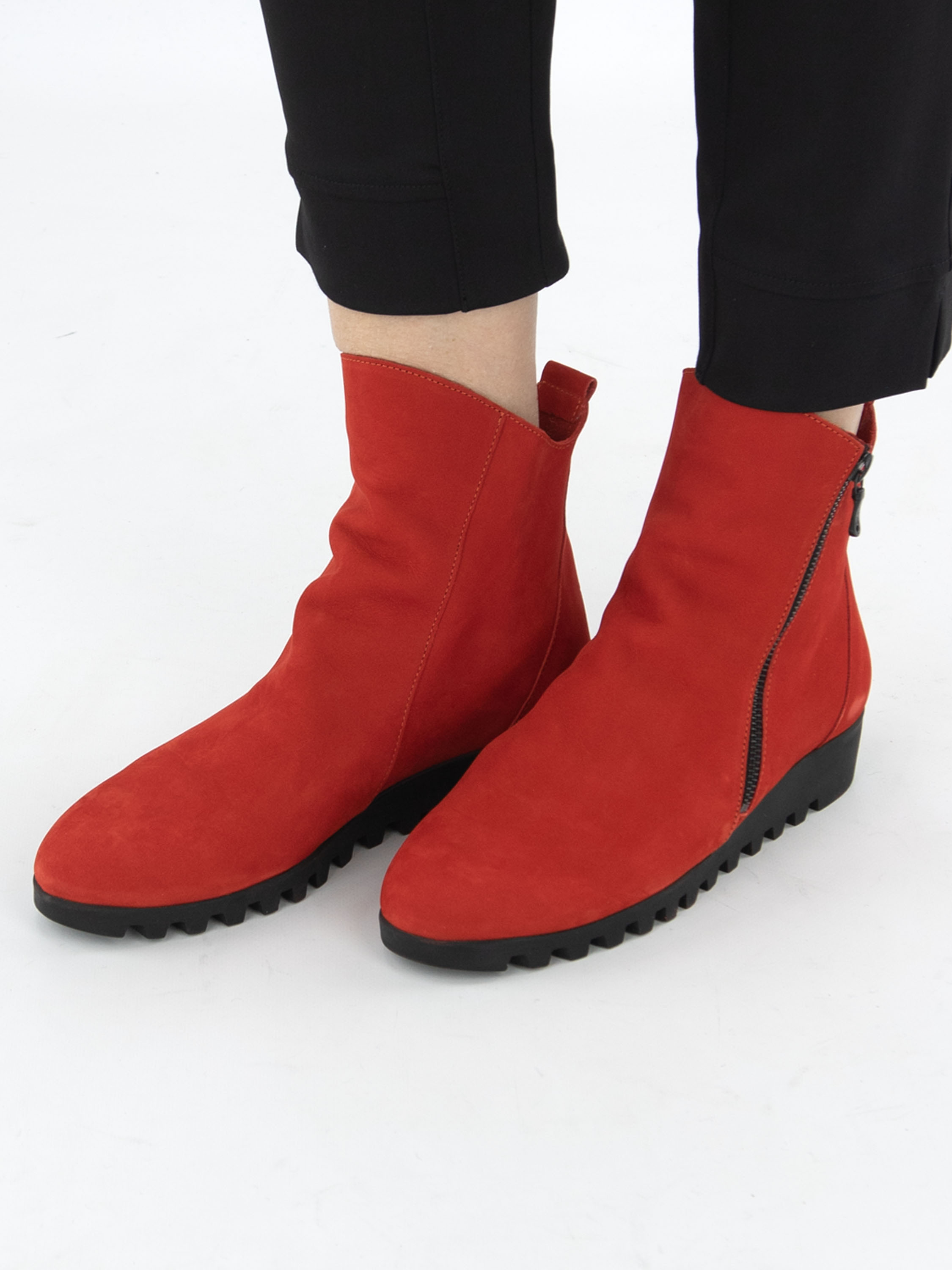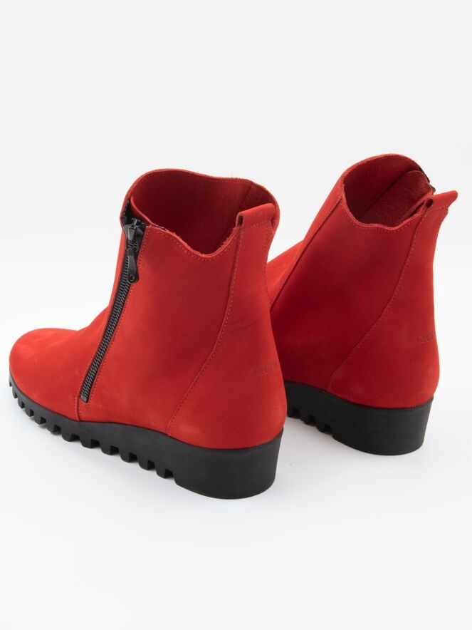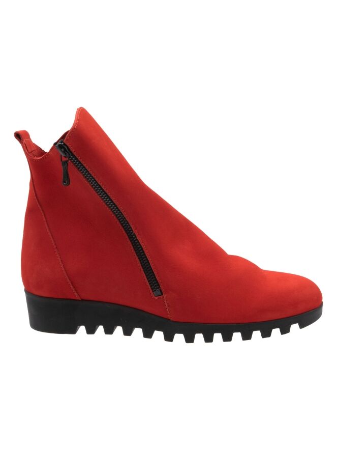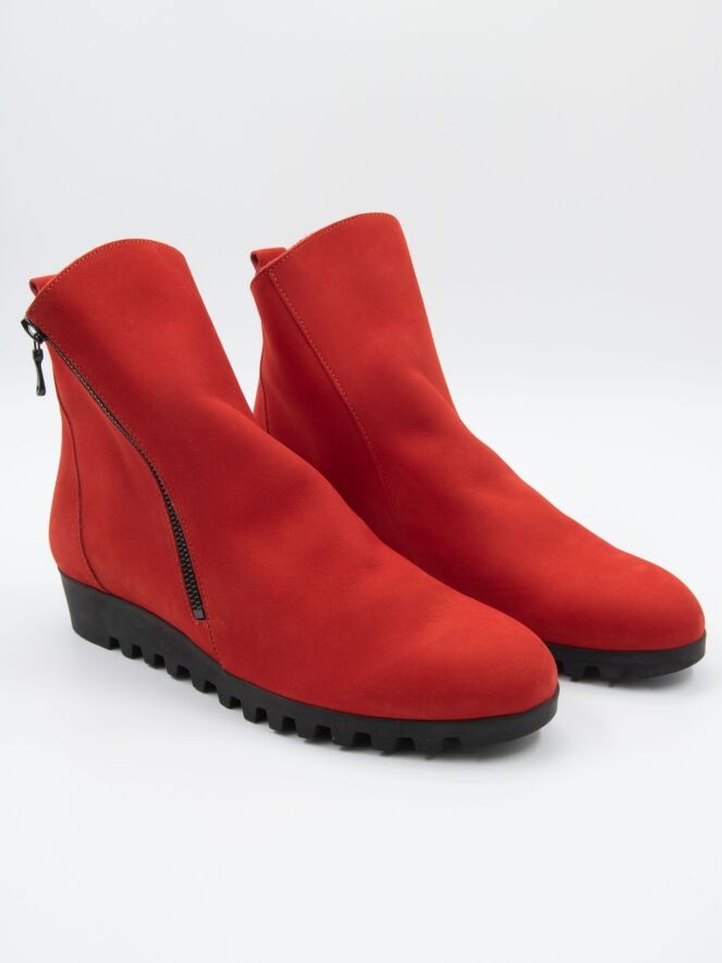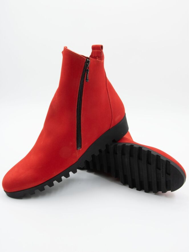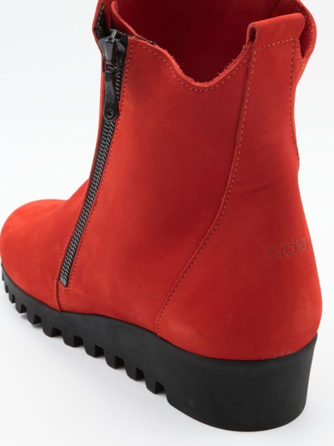 Een kort laarsje van Arche in de kleur helder rood. Aan de buitenzijde is een zwarte rits. De zool is gekarteld. Het laarsje heeft een ronde neus en de binnenkant is ongevoerd.