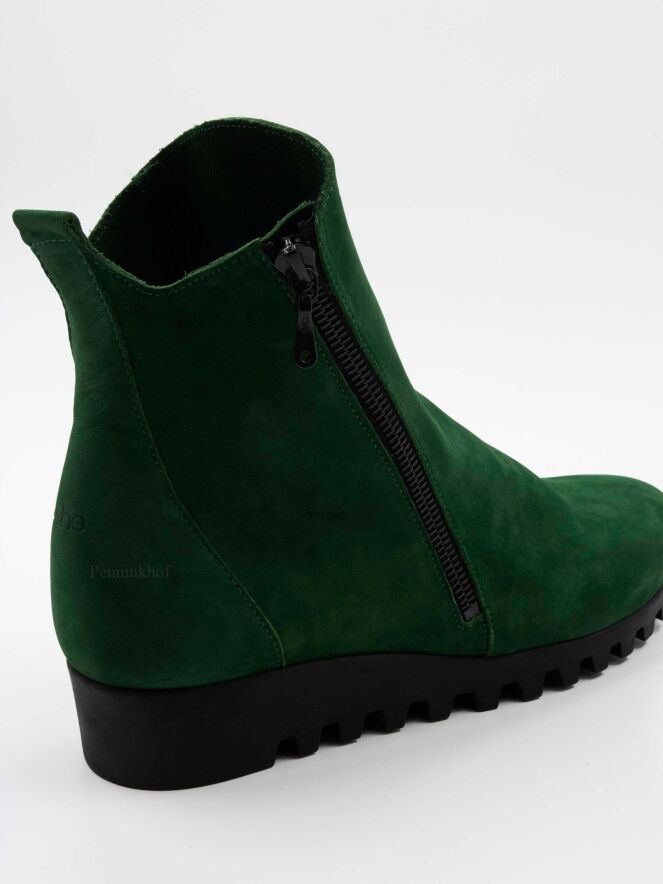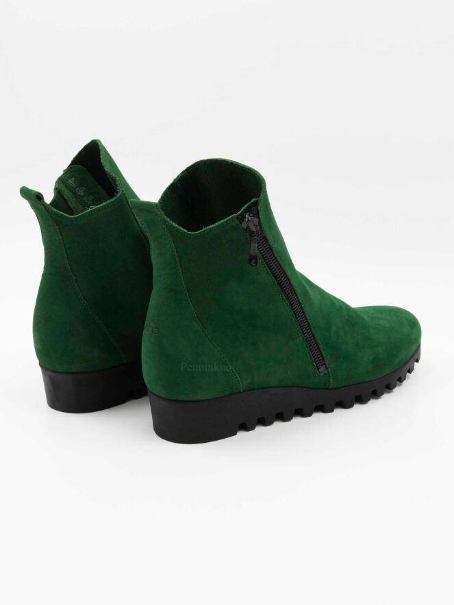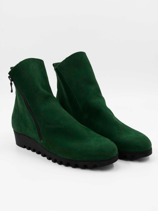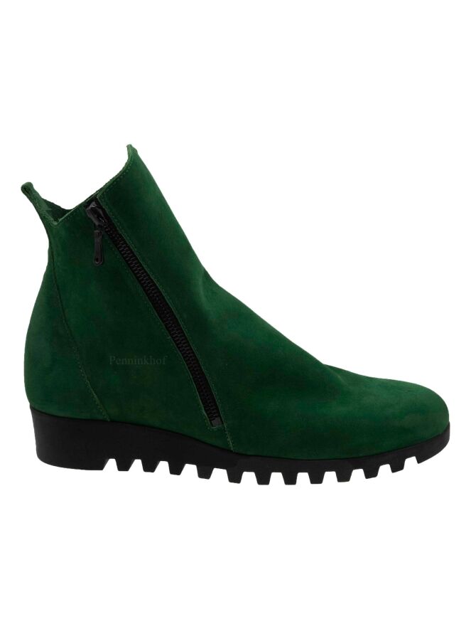 Een kort laarsje van Arche in de kleur groen. Aan de buitenzijde is een rits. De zool is gekarteld. Het laarsje heeft een ronde neus en de binnenkant is ongevoerd.