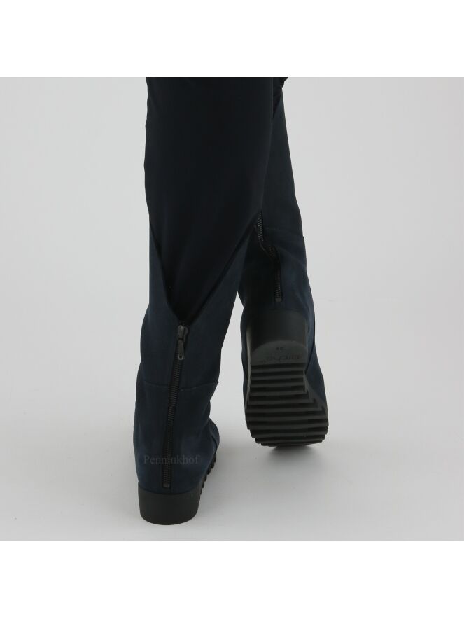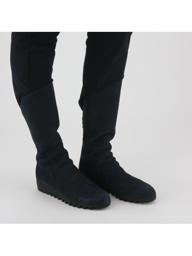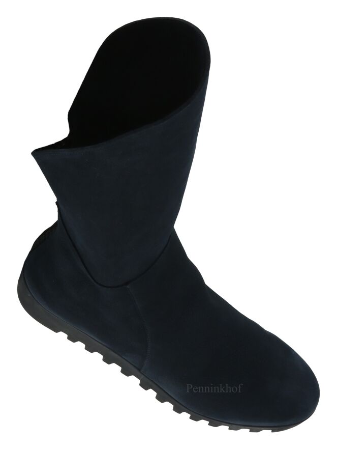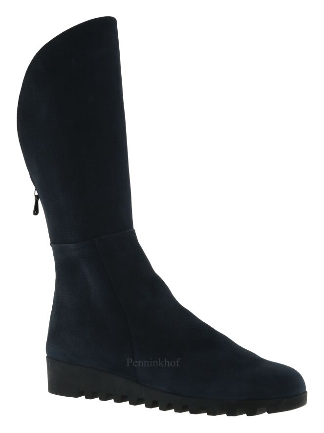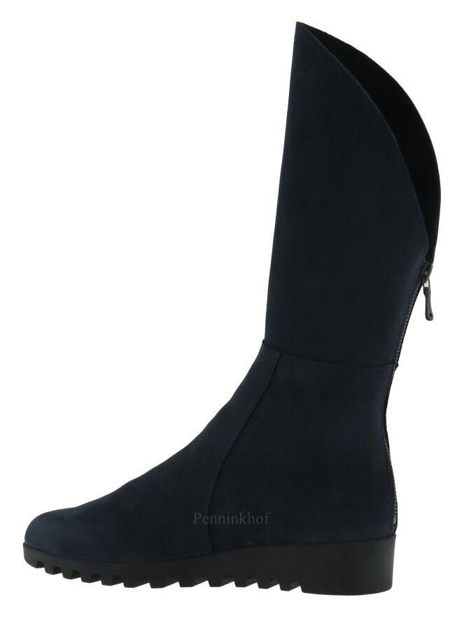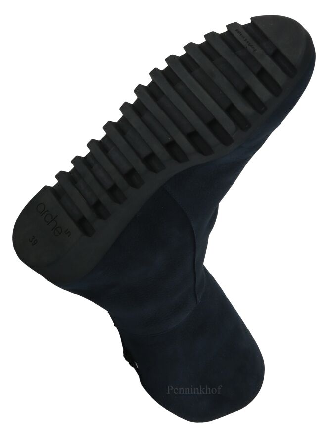 Een halfhoge laars van Arche in de kleur marineblauw. De laars heeft een gekartelde zwarte zool. Aan de achterzijde is een zwarte rits. De voorzijde van de schacht is 14 cm hoger als de achterkant. De binnenkant van de schacht is ongevoerd.