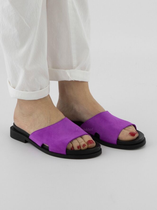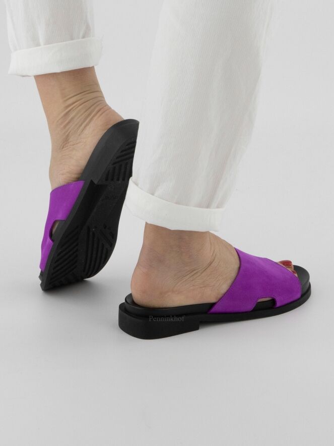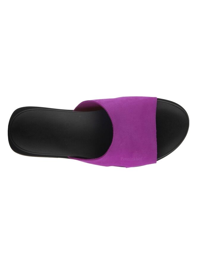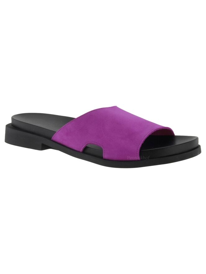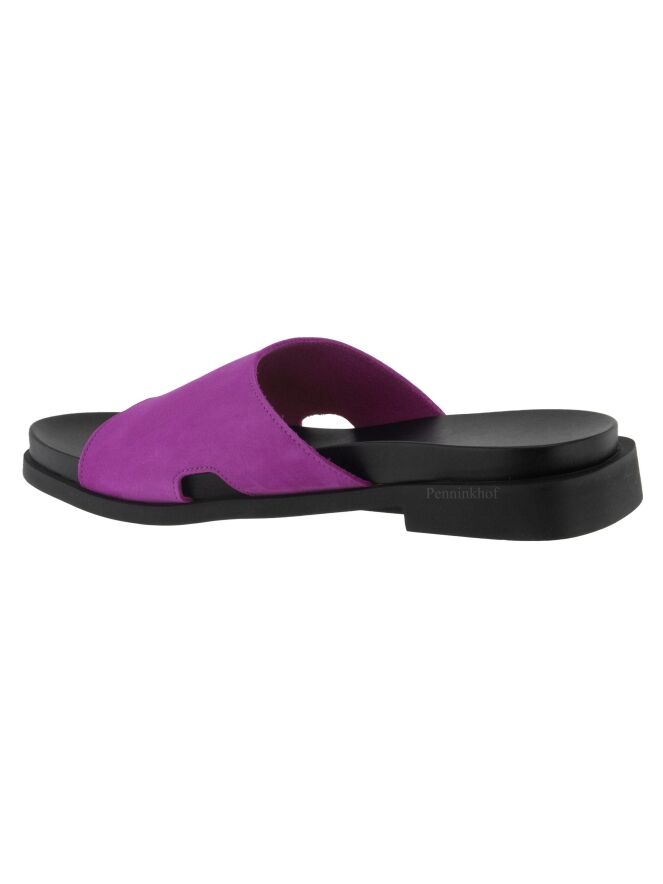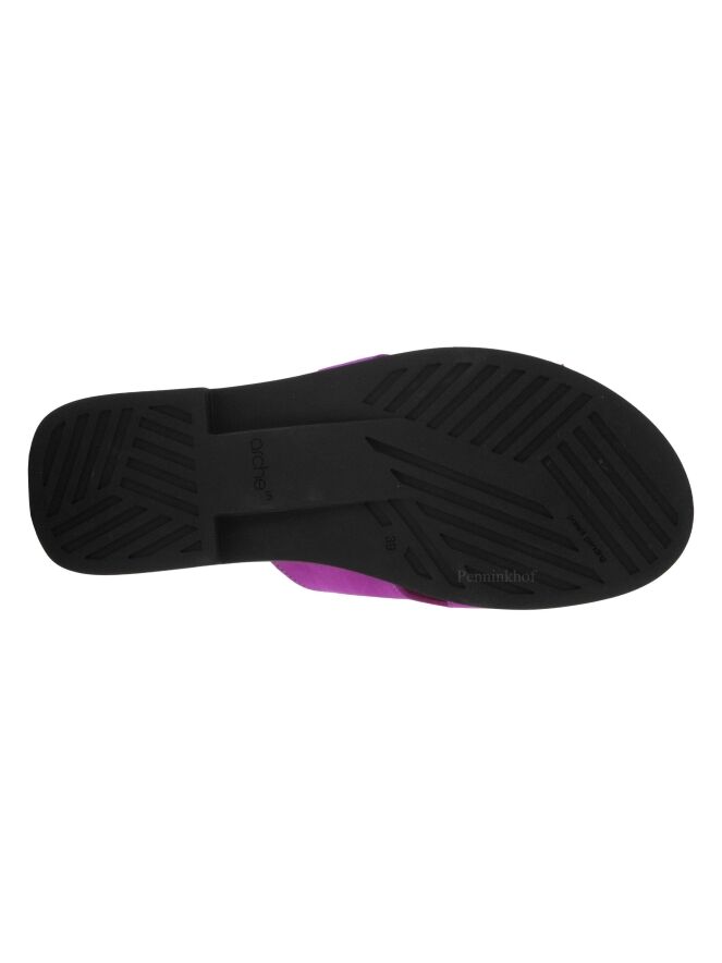 Een slipper van Arche in de kleur fuchsia. Op de latex zool is een zacht voetbed geplaatst. Aan de zijkanten van de slipper is aan beide kanten een kleine opening.